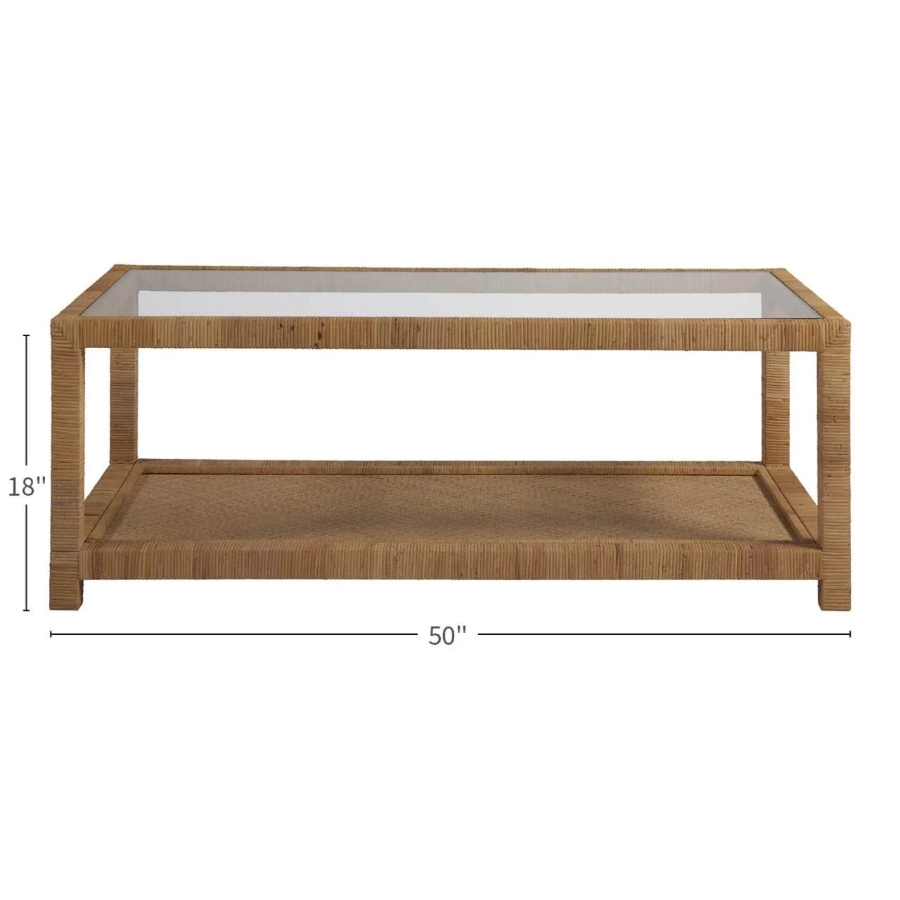 A sleek, rectangular glass top and a fresh open-air display shelf is framed by an earthy, wrapped rattan in the Long Key Cocktail Table, a light and refreshing living room furnishing.