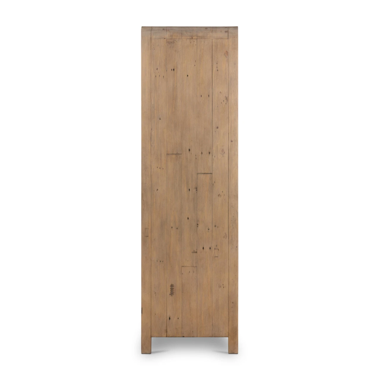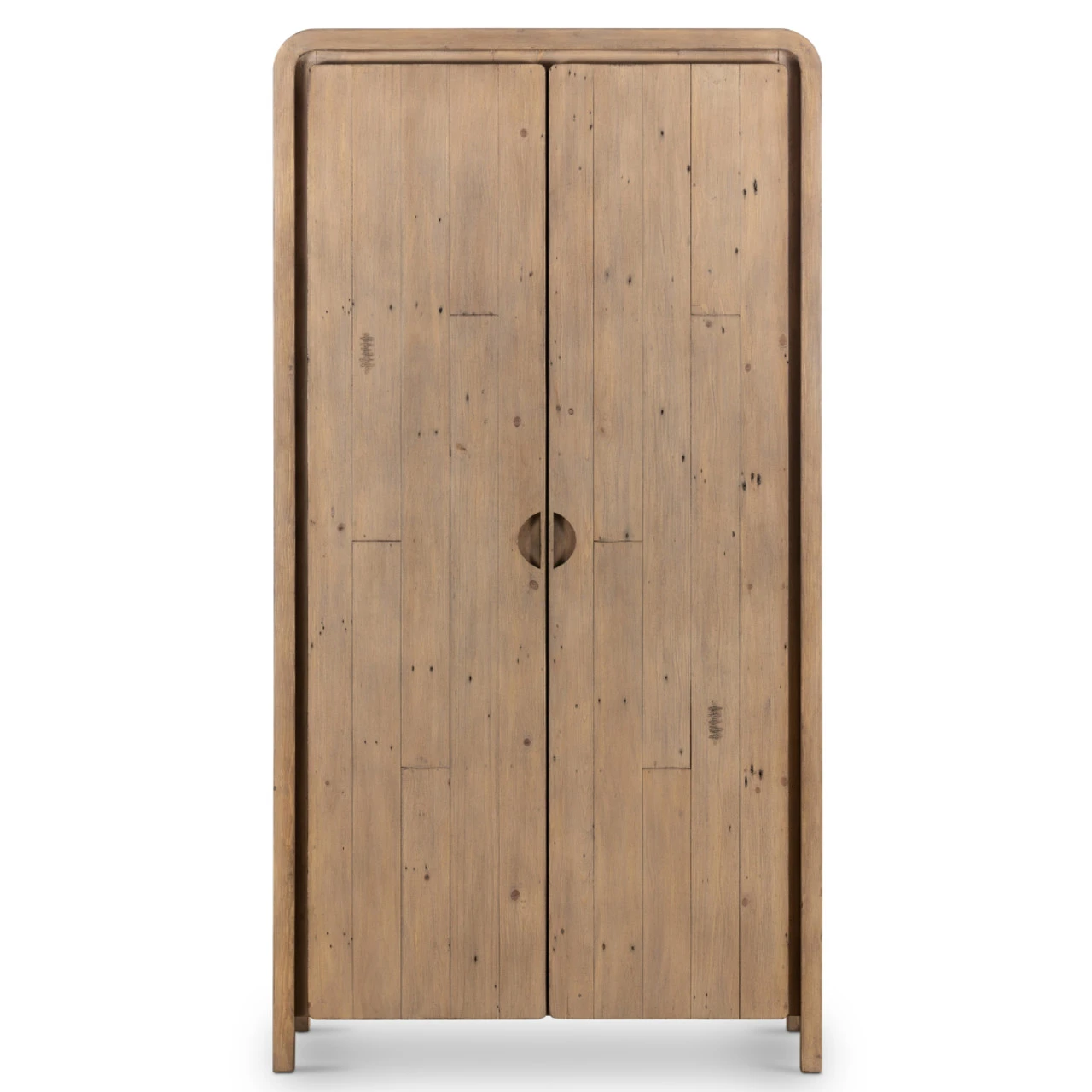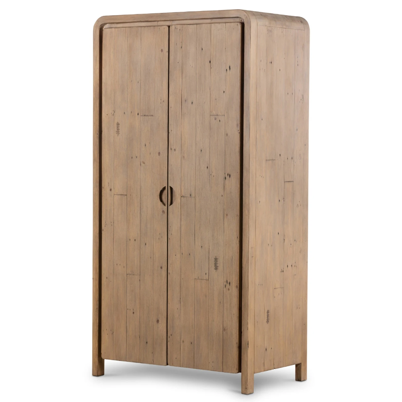 Simple and natural-spirited. Light-finished reclaimed woods shape stately cabinetry with rounded corners for a softened look. Inside, generous space and adjustable shelving fuse for ample storage ideal in any room.
