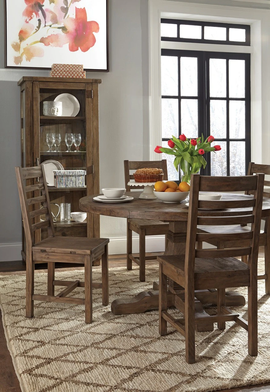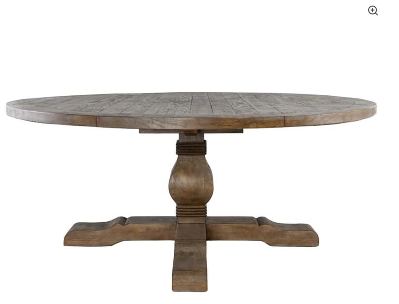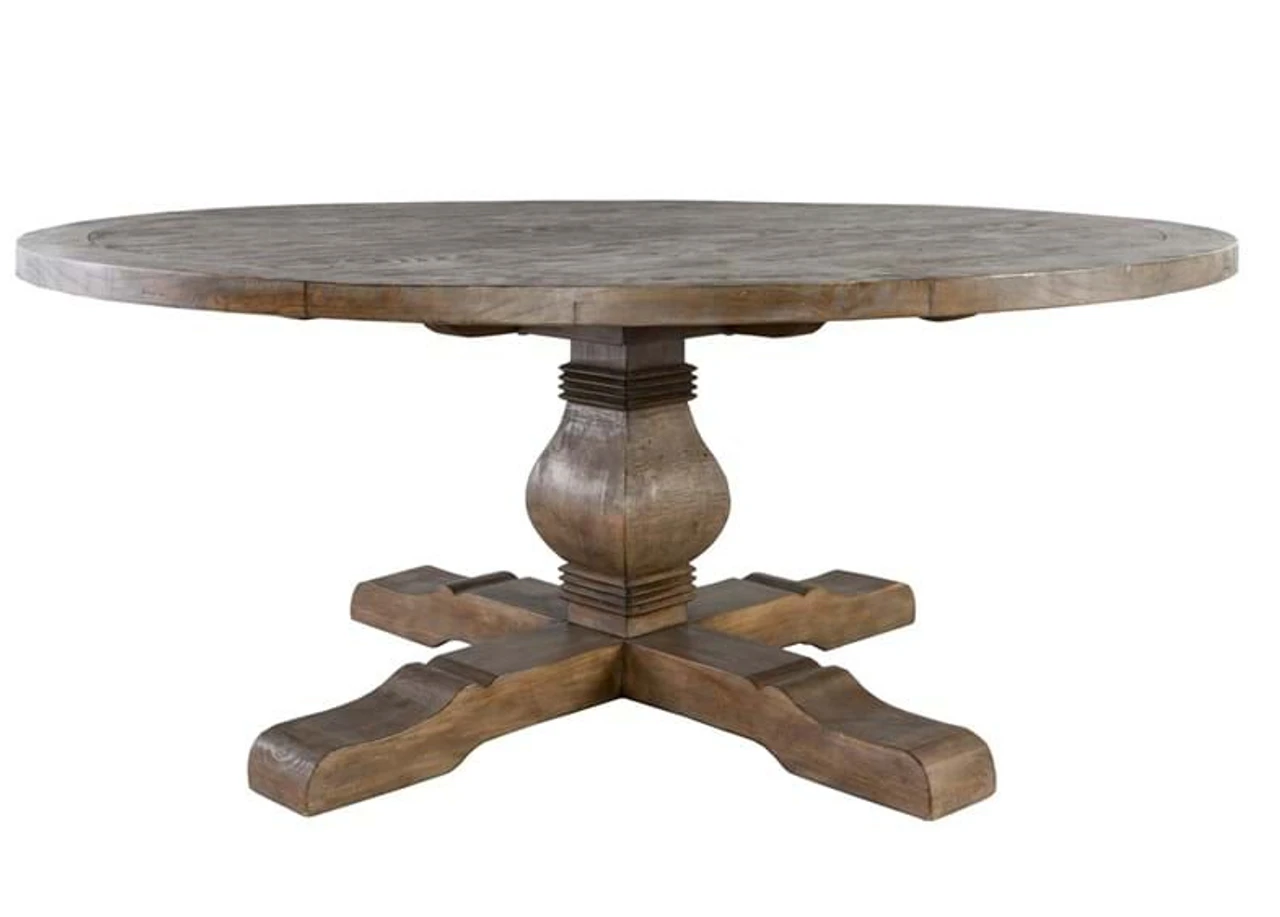 Rustic and majestic, this trestle pedestal round dining table brings classical elegance to any home. Meticulously hand-crafted from natural reclaimed pine wood in a warm desert finish, this round table is sturdy and durable for everyday use and the perfect centerpiece for an elegant, rustic ambiance. The pedestal base of this table reminiscent of traditional design. The Farmhouse Round Dining Table is 72″ in length, which allows you to comfortably seat 8 guests at the table.  A hand-applied desert finish complements the reclaimed pine’s natural variation in grain and finish and enhances the uniquely classic look of this design. By its nature, reclaimed and salvaged wood planks include distinctive nicks, splits, cracks, knots, nail holes and imperfections that speak to the wood’s age and provenance. Salvaged wood will continue to change over time as it interacts with its home environment.Â
