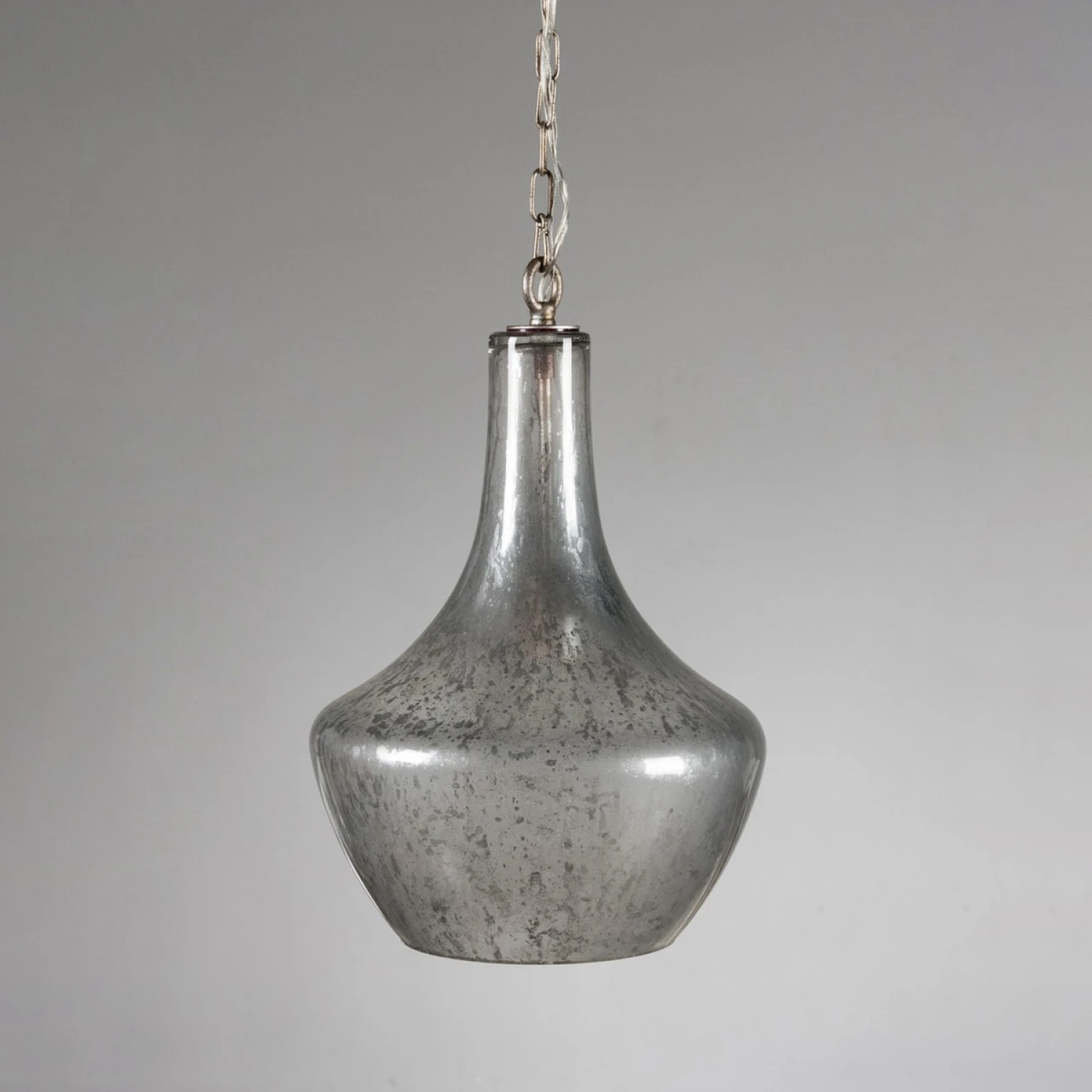Felicity Glass Pendant features an elegantly sculpted shade hanging from a generous 6 foot long chain. A mercury glass treatment gives the pendant a vintage finish that will add character to any space.