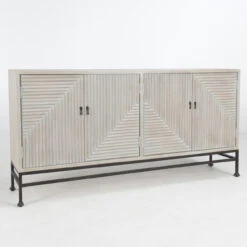 Standing atop a dark iron base, this striking cabinet features whitewashed mango wood and four doors accented with a geometric pattern. The dimensional effect gives this piece a sophisticated look while adding generous storage to any room.
