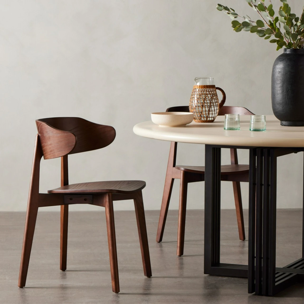 A fresh, exaggerated take on the wing-back dining chair. Finished in a natural hue, a mix of solid ash and ash veneer makes a modern and shapely seating statement with mid-century undertones.