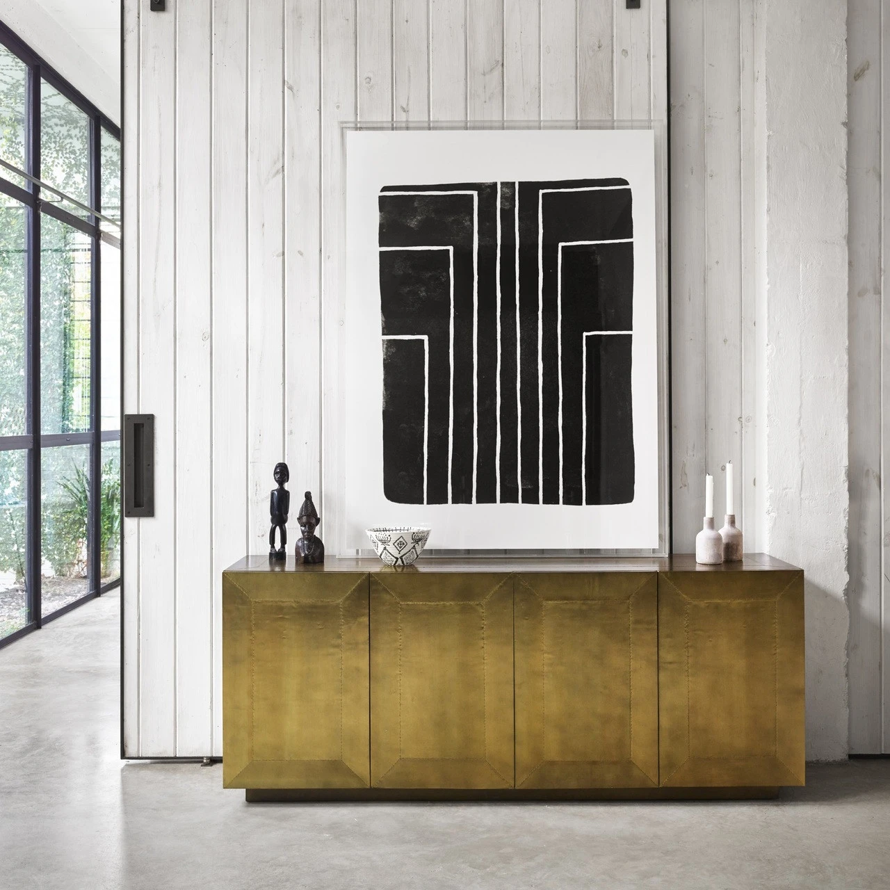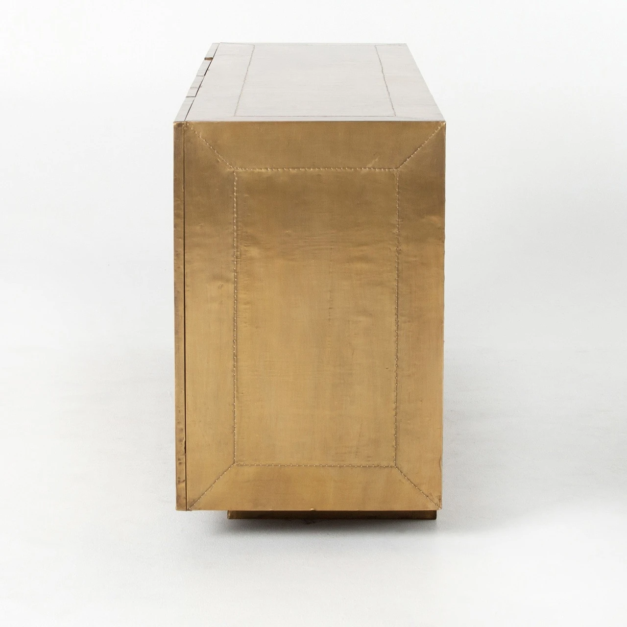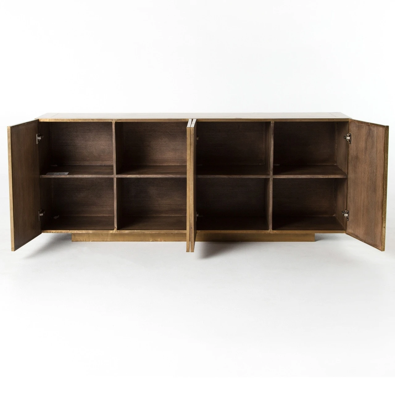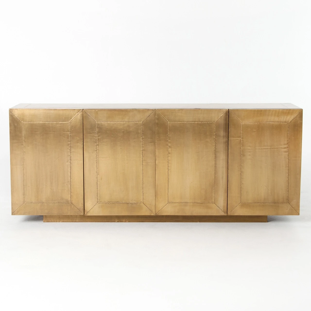 The subtle glamour of aged brass cladding covers this clean-lined buffet sideboard. Inspired by Italian designer Gabriella Crespi, a plinth base, four doors and geometric details up the modernity of ’70s-era design. Our Hollywood Regency Inspired Credenza feature Mitred 4 doors and industrial spit-tack detailing. Inside features natural grey finished mango wood shelves for vast storage for dining or media essentials.