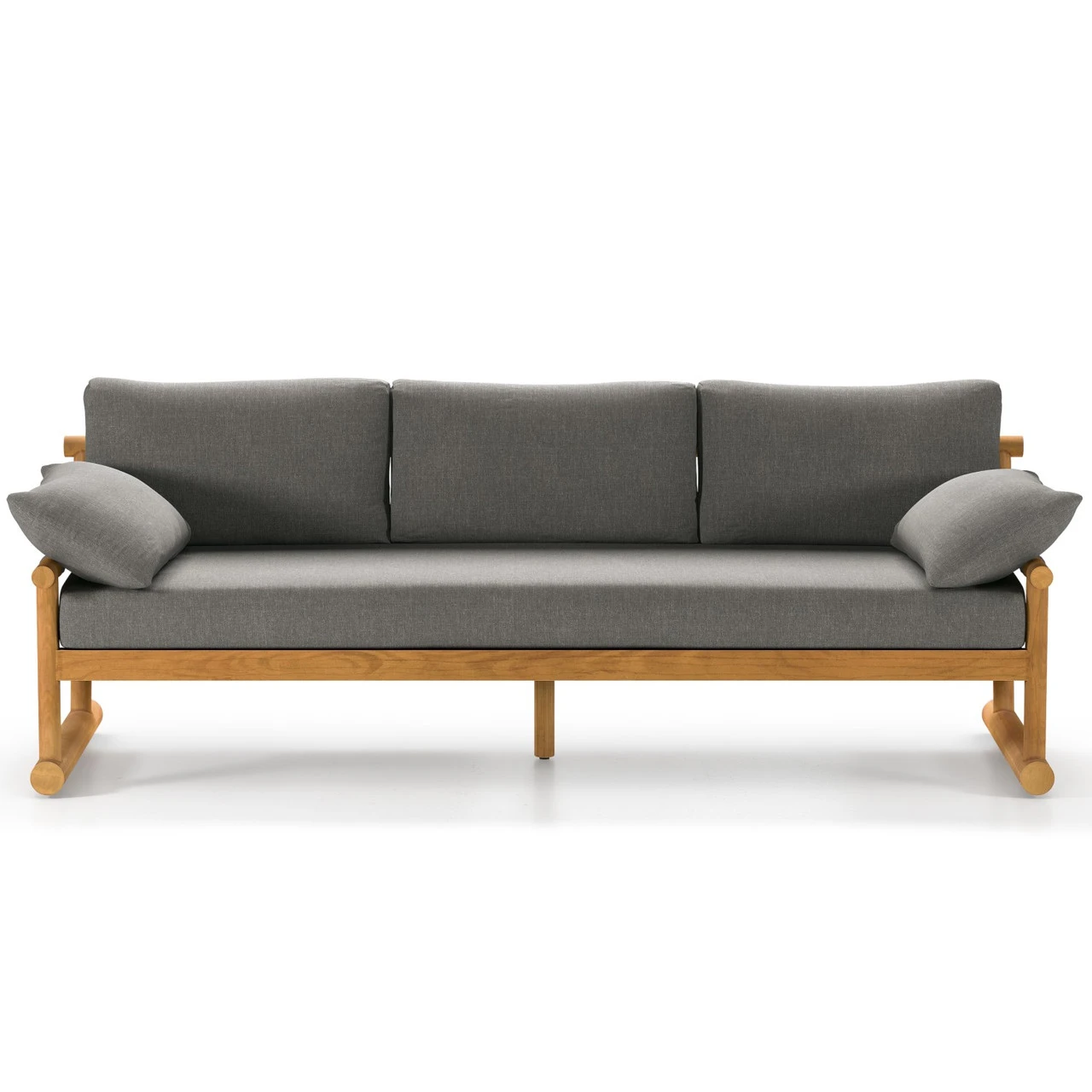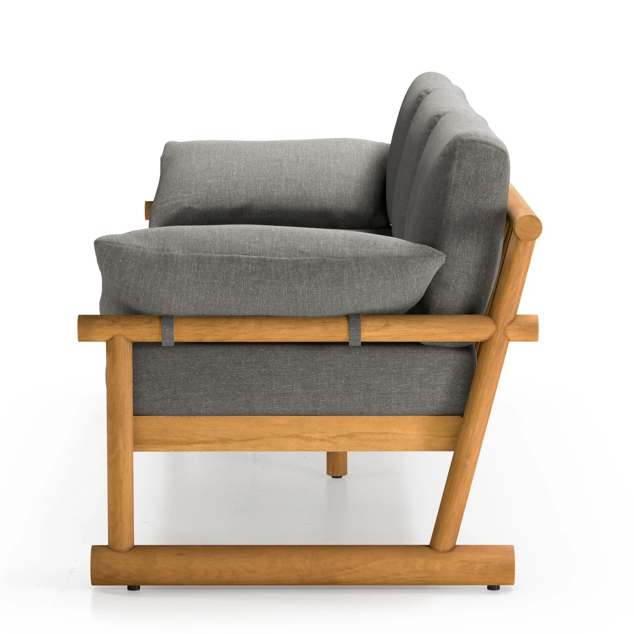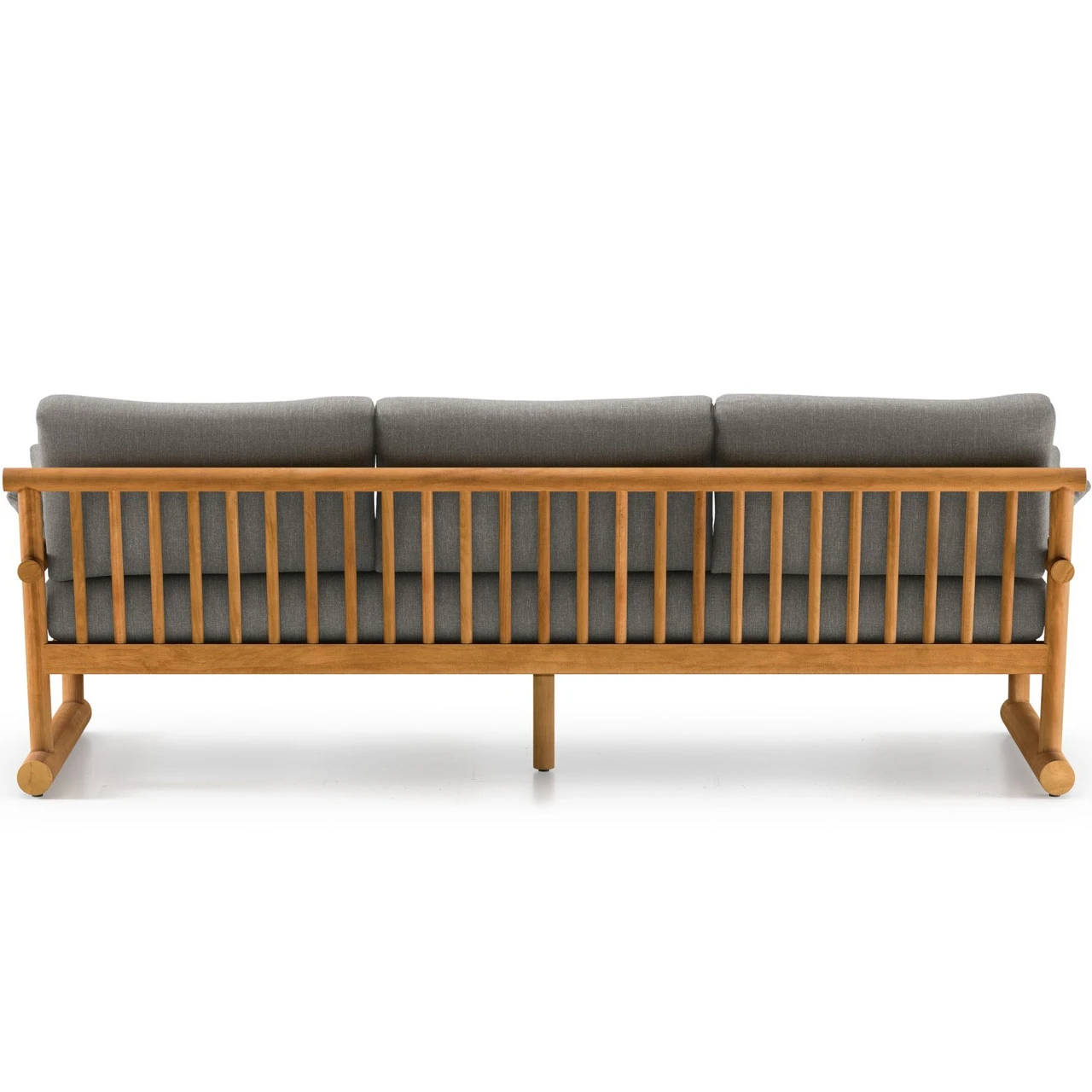 A touch of tradition brings a sense of calm and comfort to this outdoor sofa. Inspired by the simple and streamlined shapes found from traditional Shaker furniture for a benchmade feel. Rounded legs and matching spindles on back are crafted from FSC-certified teak. Cushioning and arm pillows are covered in 100% Olefin, known for its UV-resistant, water-repellent and quick-drying abilities. Cover or store indoors during inclement weather and when not in use.