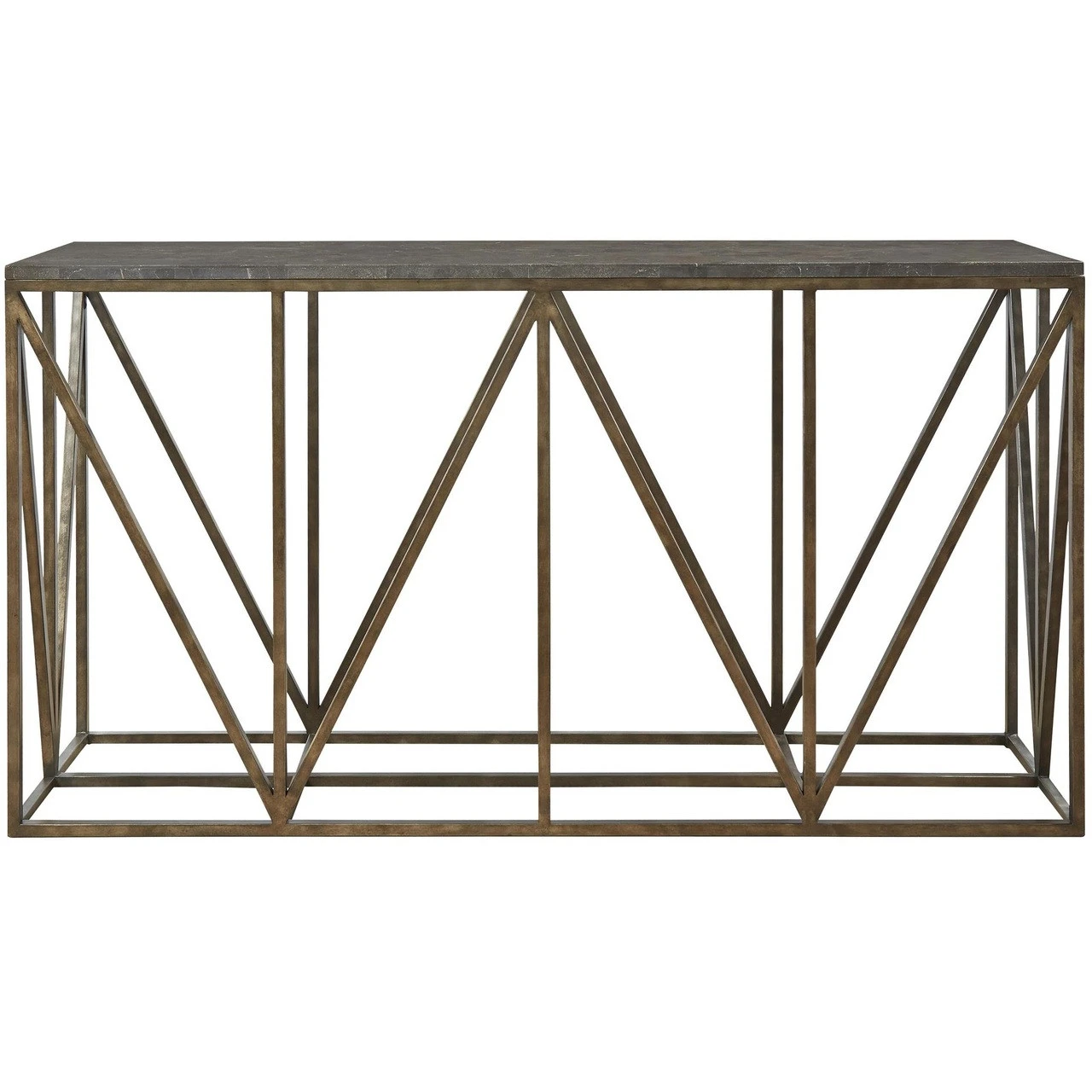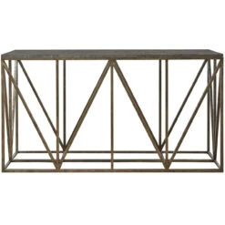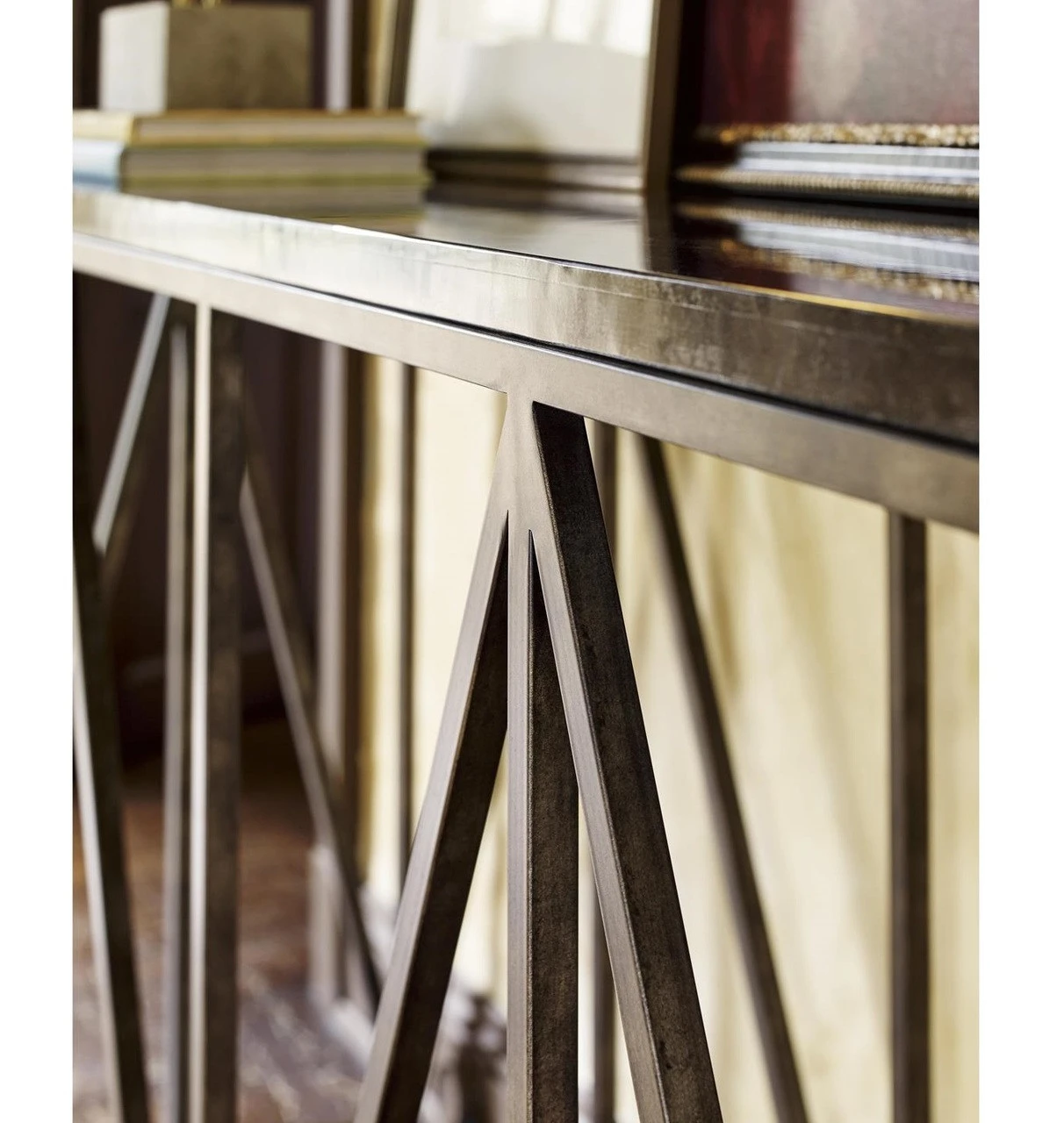 Our French Industrial inspired metal console table feature geometric design made with interlacing oiled bronze metal framework that supports a unique bluestone table top. This functional console table blends easily in any living space including entryway, dining space, or entertaining area.