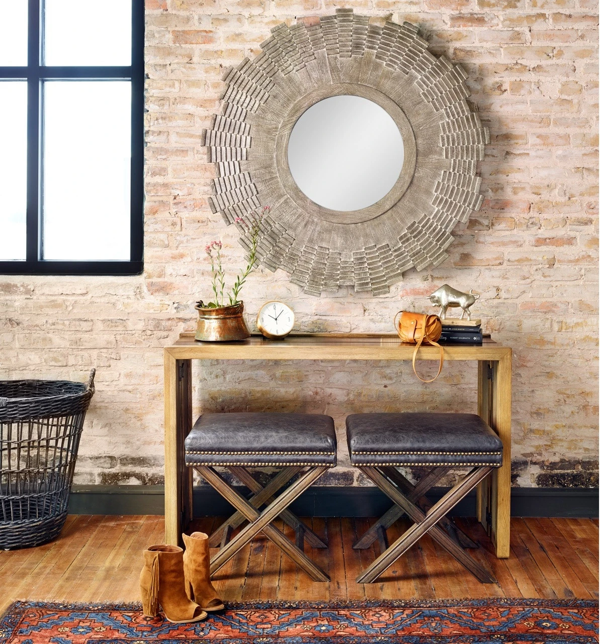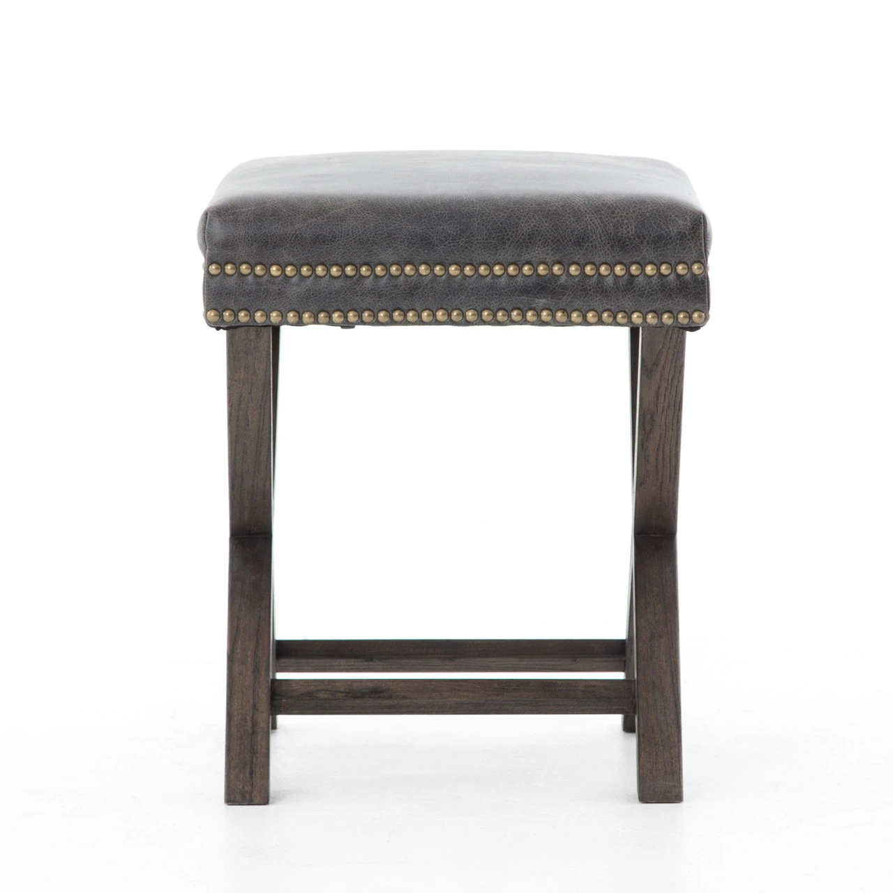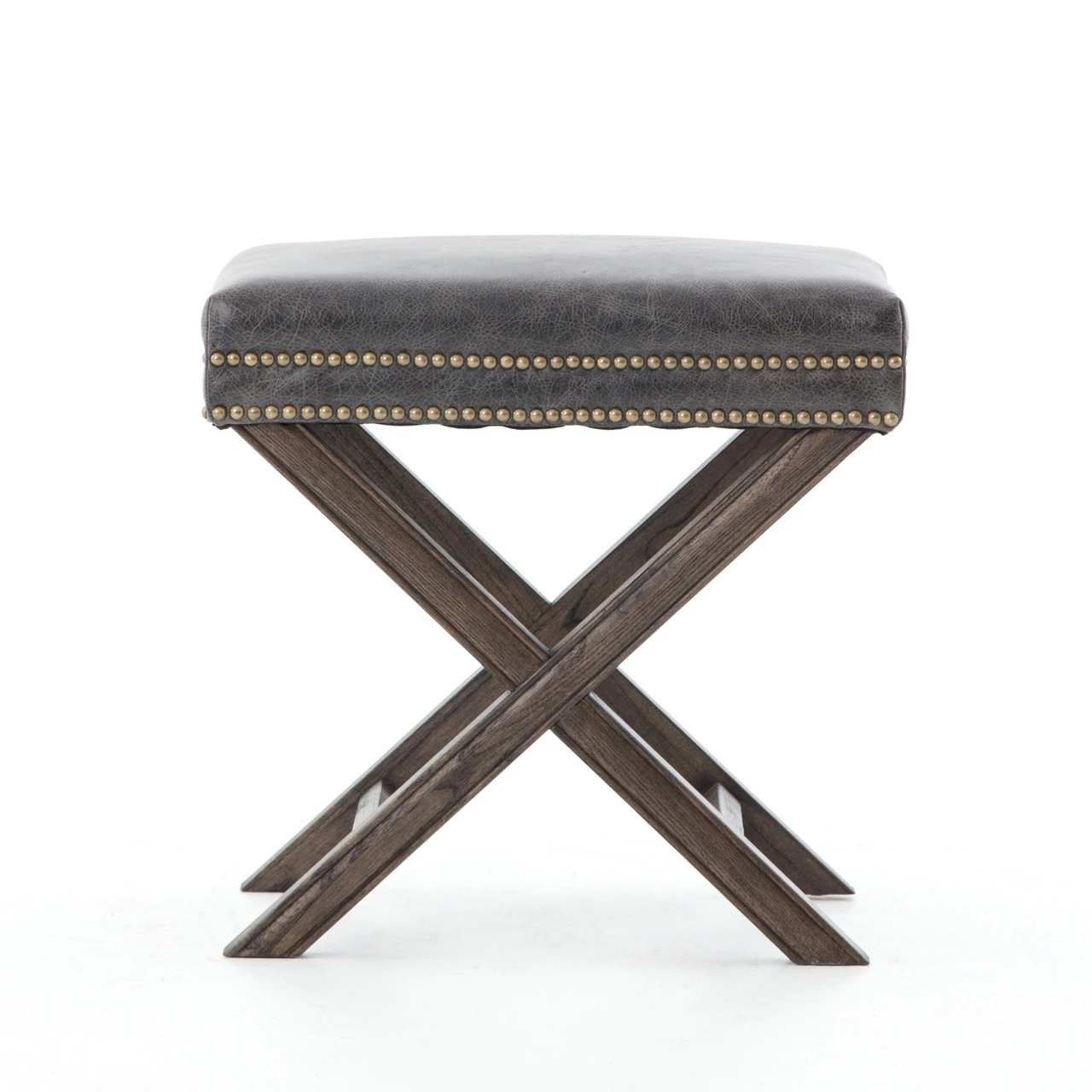 Airy, light, and sized just right. An open, X-framed base is topped in soft, top-grain leather accented by a double row of brass-finished nail heads.
