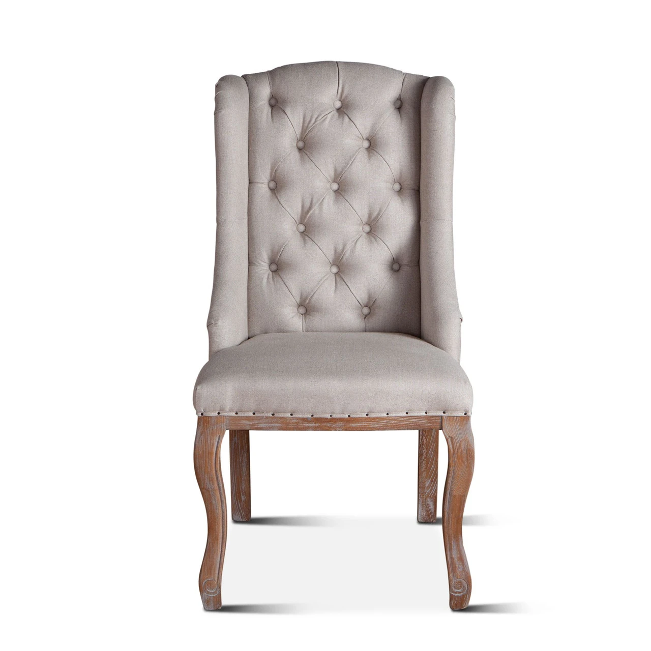 This chair boasts a real oak hardwood frame upholstered in a linen and jute blend fabric with tufted seat back and framed side panels. The off-white linen upholstery with the pickled oak finish of the wood frame and legs provides a distinguished touch to any classic, traditional decor style. This beautiful French Tufted Wingback Dining Chair includes diamond-shaped button detailing along the seat back. No assembly required.