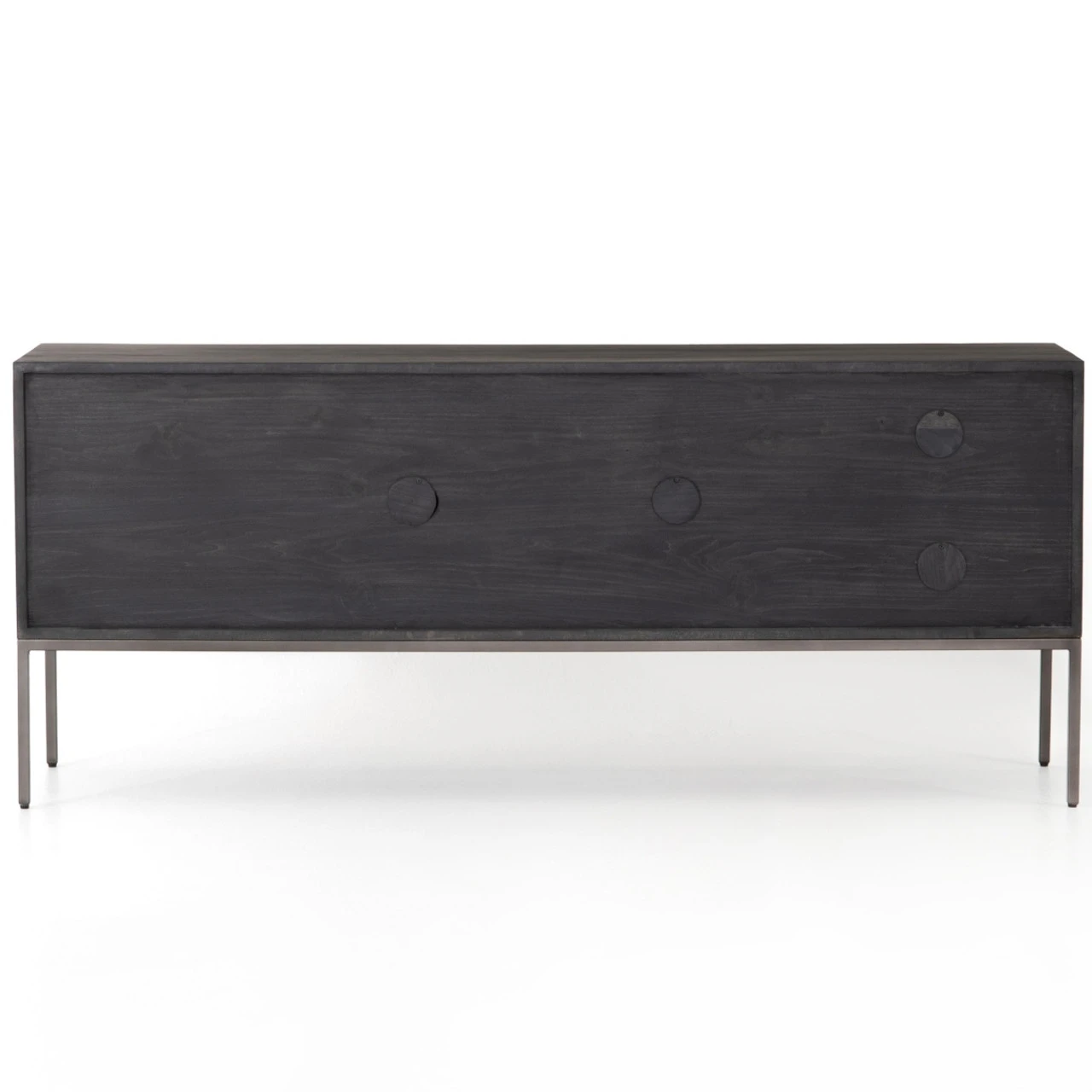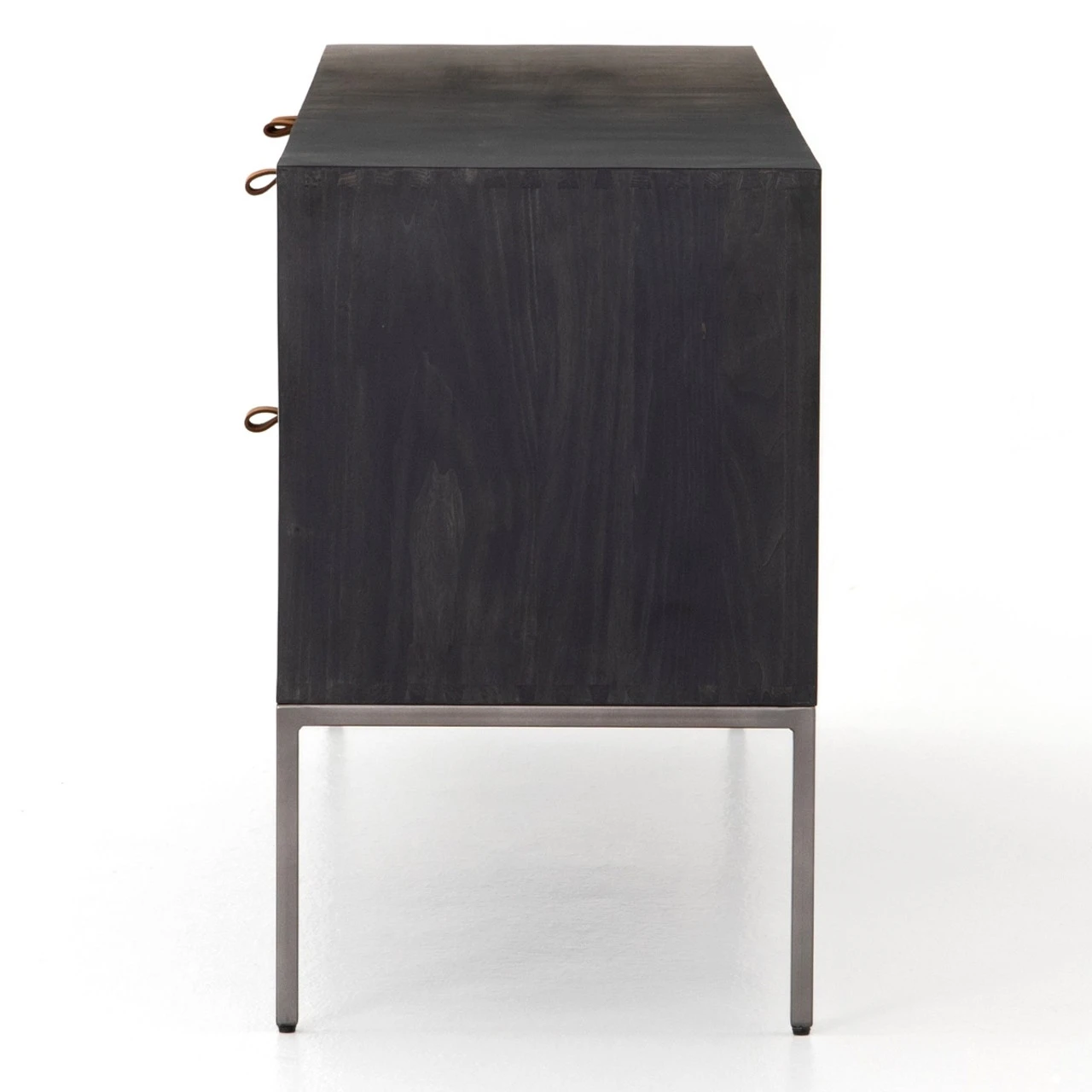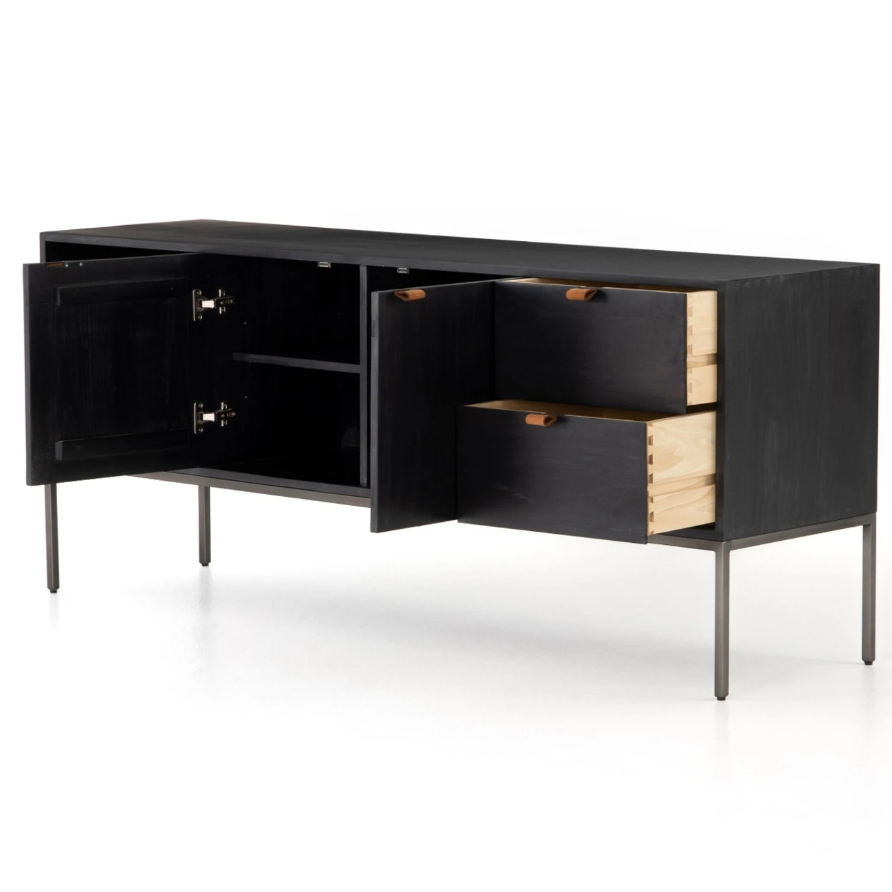Asymmetry creates a dynamic, modern aesthetic. Impulses from mid-century are reinvented with a mix of warm woods and hard iron. Character walnut and untouched oak reveal knots and natural beauty marks. Exposed dovetail joinery and rubbed iron finishes add another layer of interest and the appearance of age.