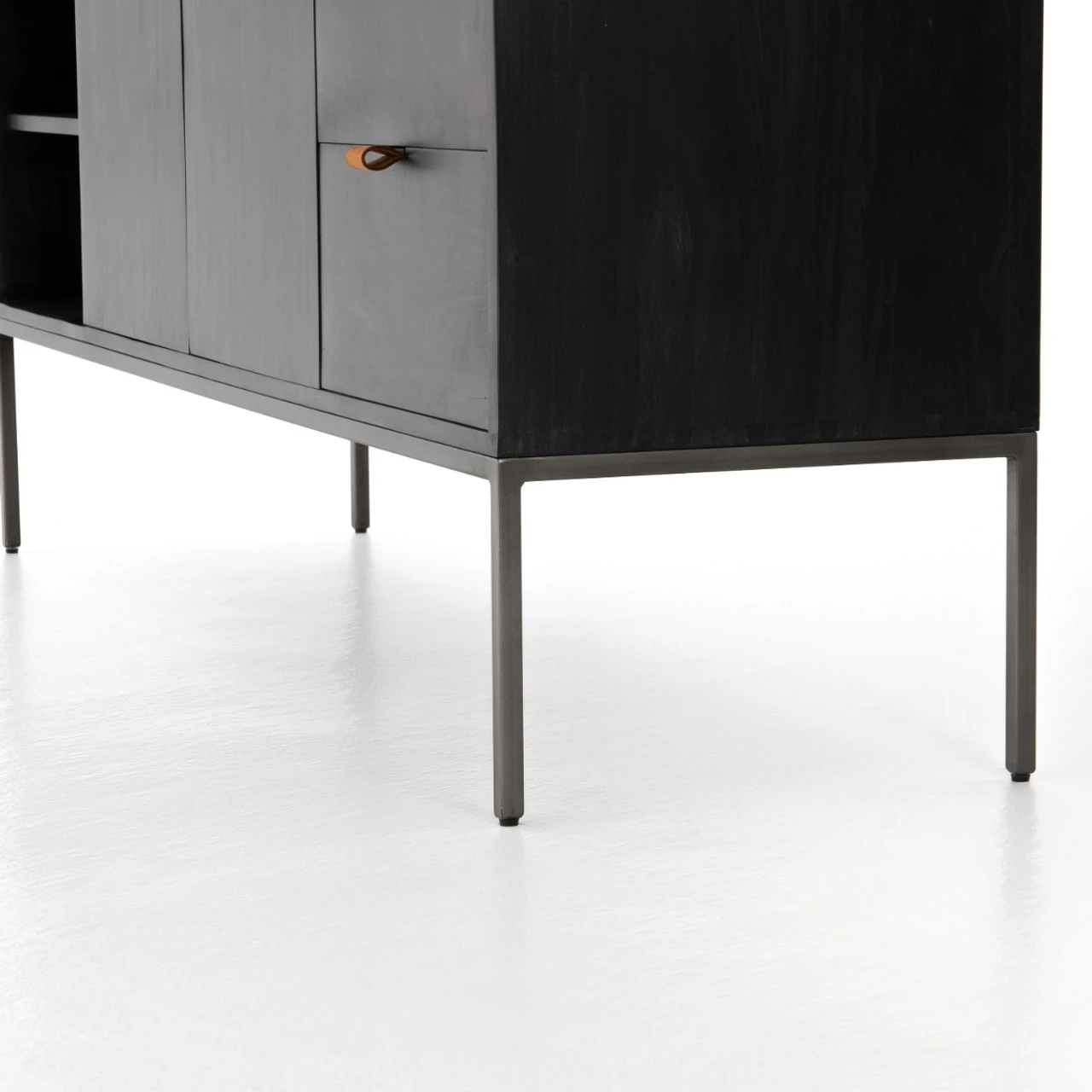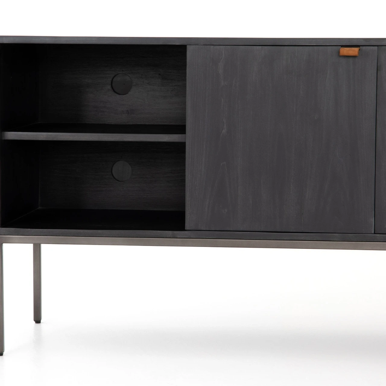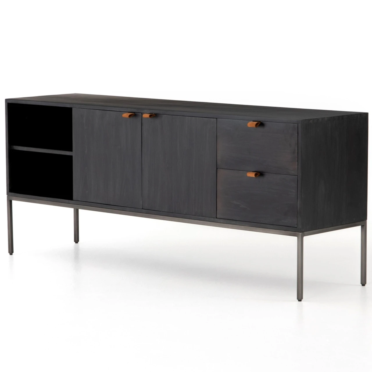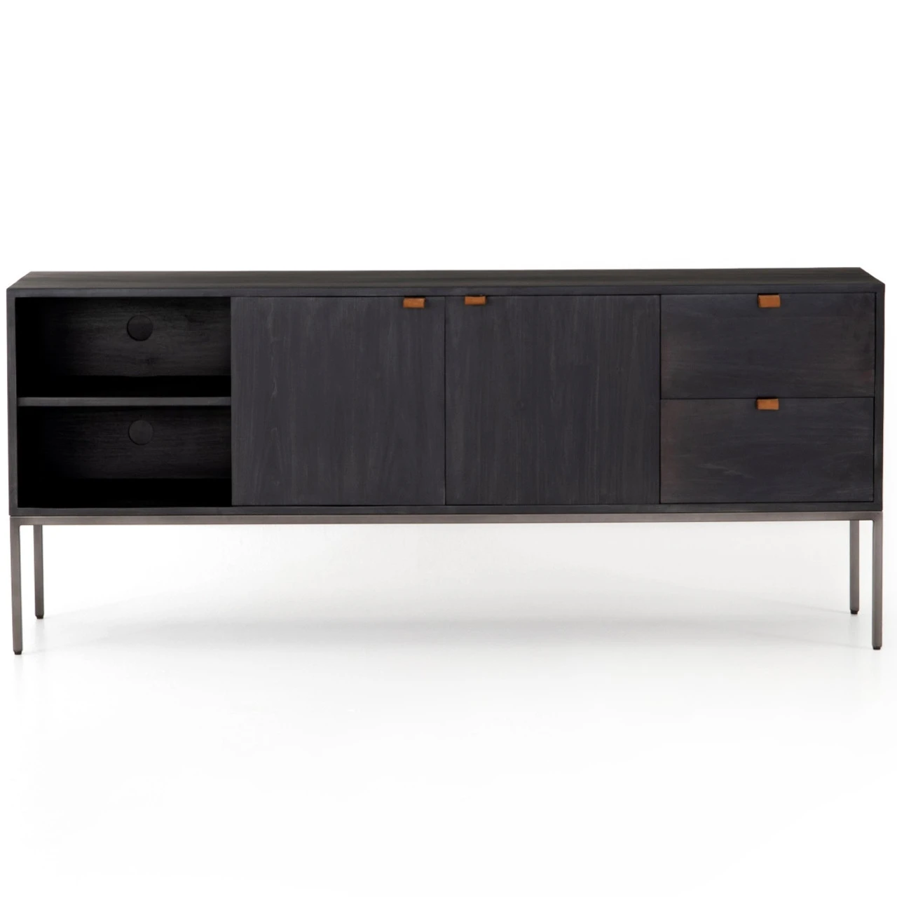 Inspired by clean industrial mid-century modern design, black wash poplar wood offers plenty of media storage space by way of open shelving, front-open doors and dual drawers. Metal-secured pulls of toffee top-grain leather add a textural element of surprise. Great solo or paired with matching bookcases. Our Fulton Industrial Modular Media Console Cabinet combines form, function and versatility. Its freestanding design means that you can easily pair it with the matching pieces in the collection to create a TV Media Storage that’s right for your living room.