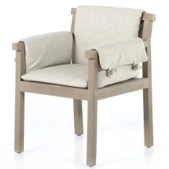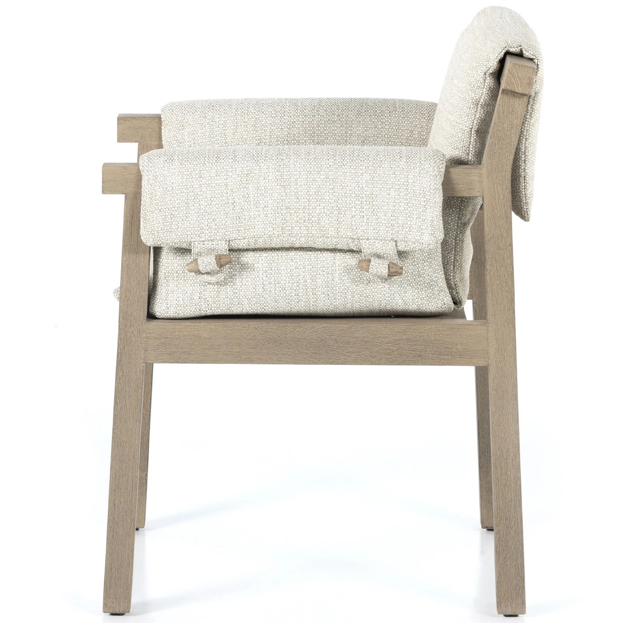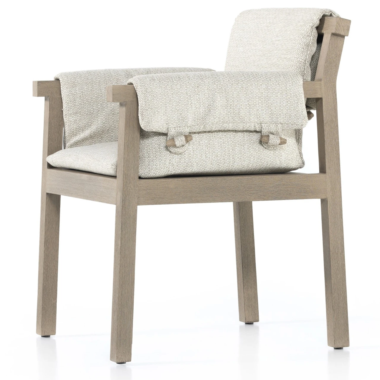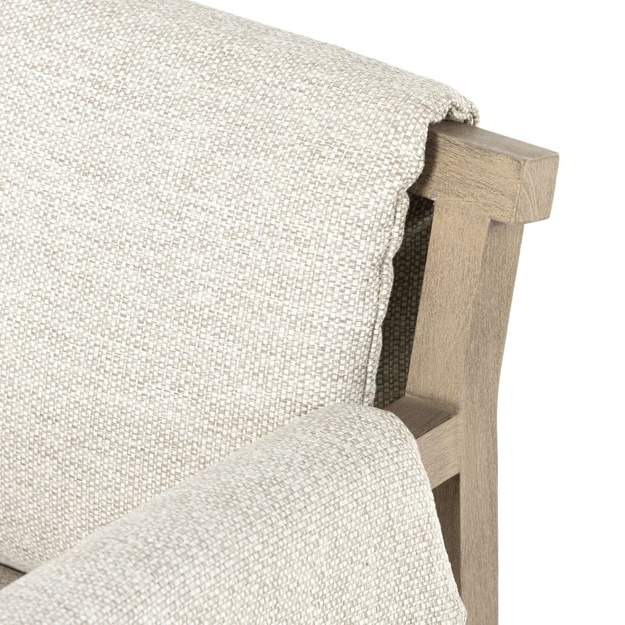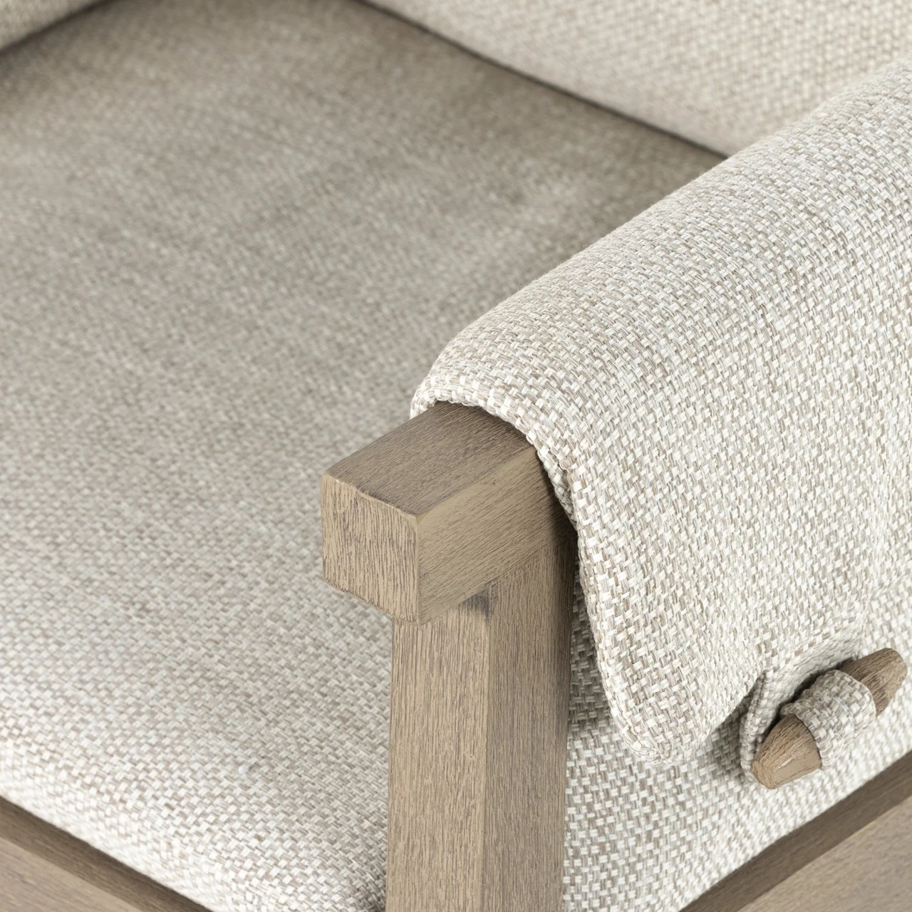A softer take on a modern silhouette. Light cushioning is upholstered in UV-resistant, water-repellent, quick-drying fabric. Unique foldover arm and back details are fastened to the frame with toggles. Frame is crafted from FSC-certified teak with a craftsmen, bench-made feel. Cover or store inside during inclement weather and when not in use.