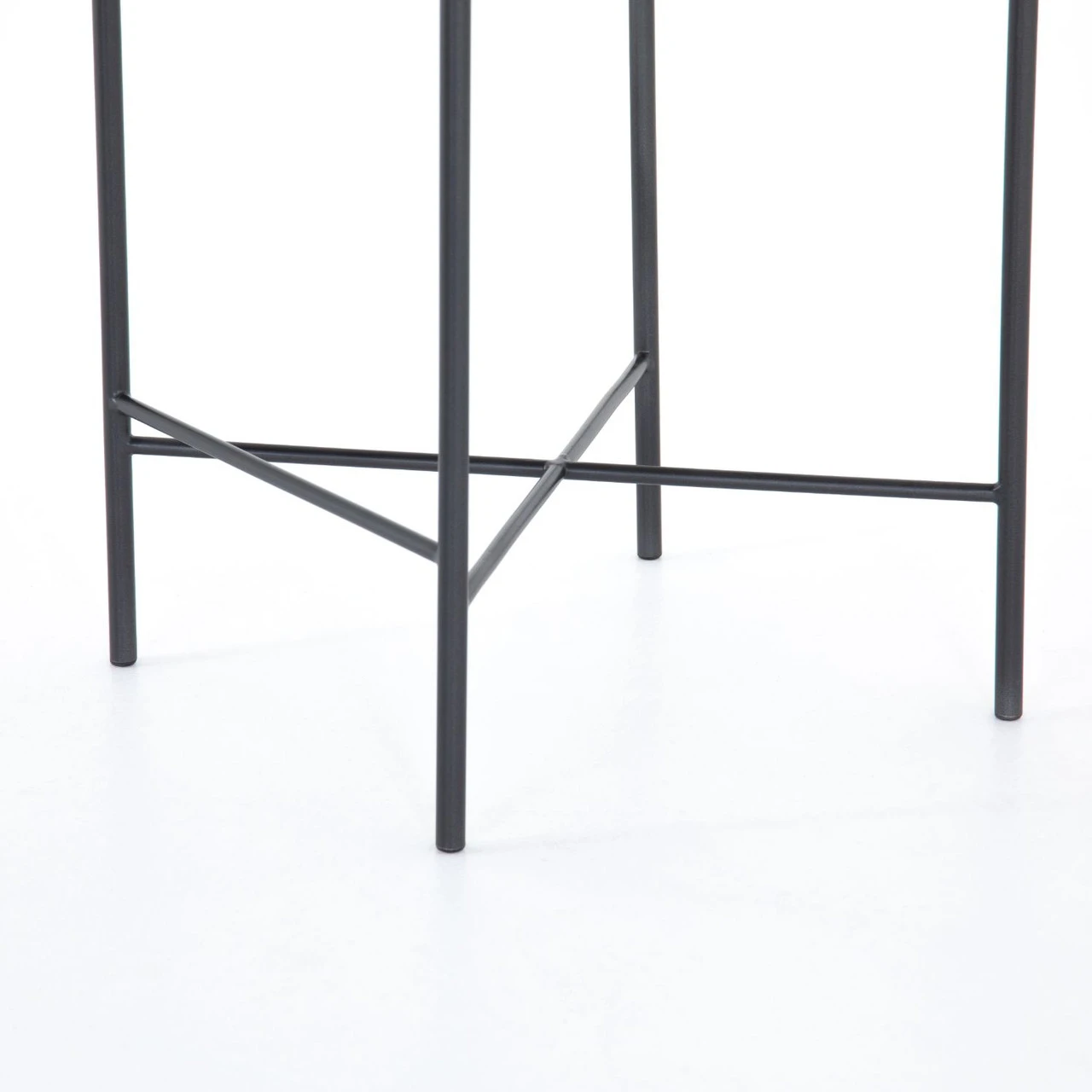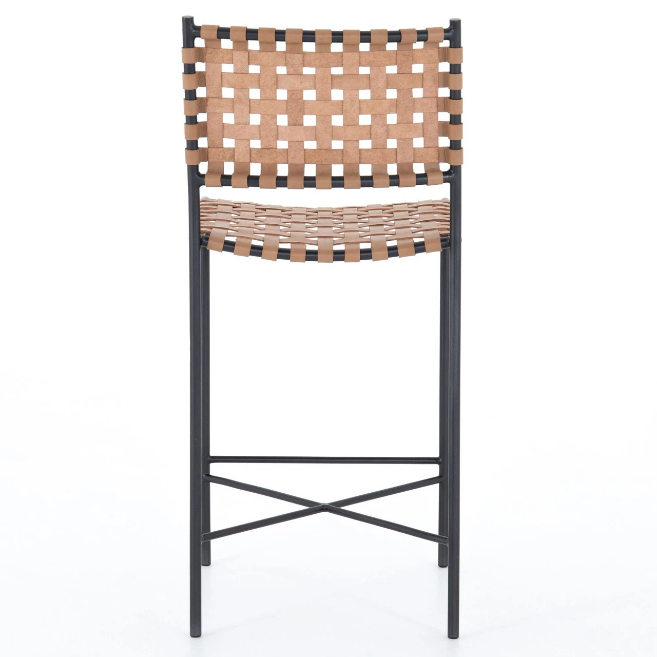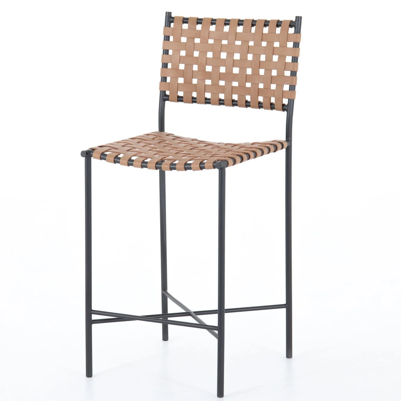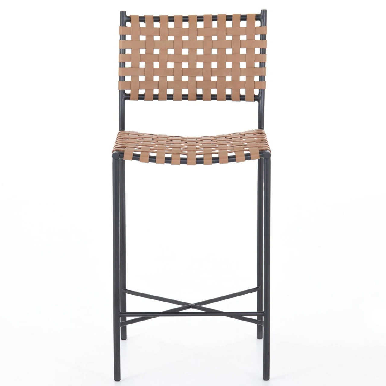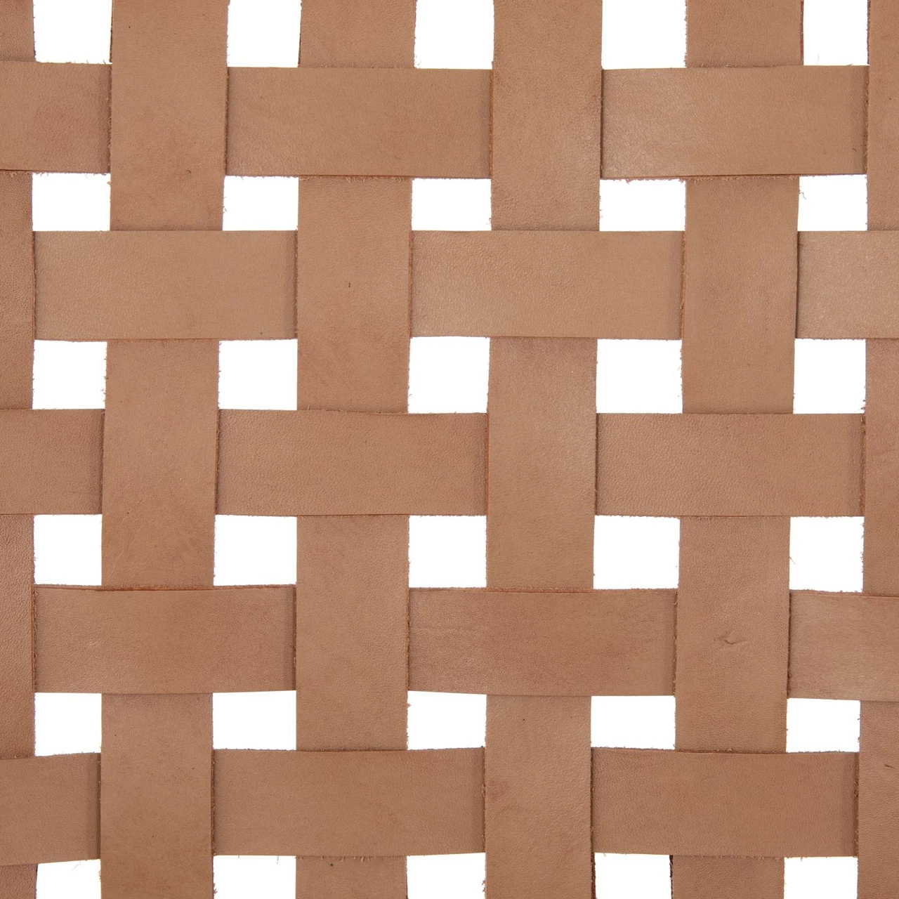 In its beautifully versatile natural hue (stone grey), hand-cut top-grain leather weaves to fashion a modern farmhouse look, with slim, black-finished iron framing for lightness.