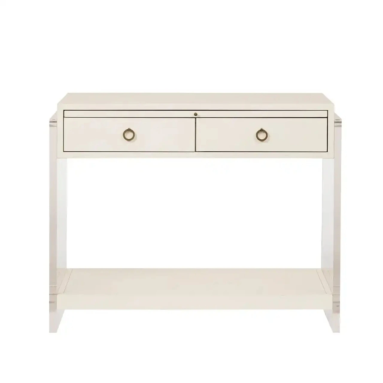 Showcasing classic coastal style with a modern twist, the Belize Nightstand brings a lightness to spaces with two drawers, open-air storage, bronze ring pulls, and as-sleek-as-can-be acrylic ends complemented by a white finish
