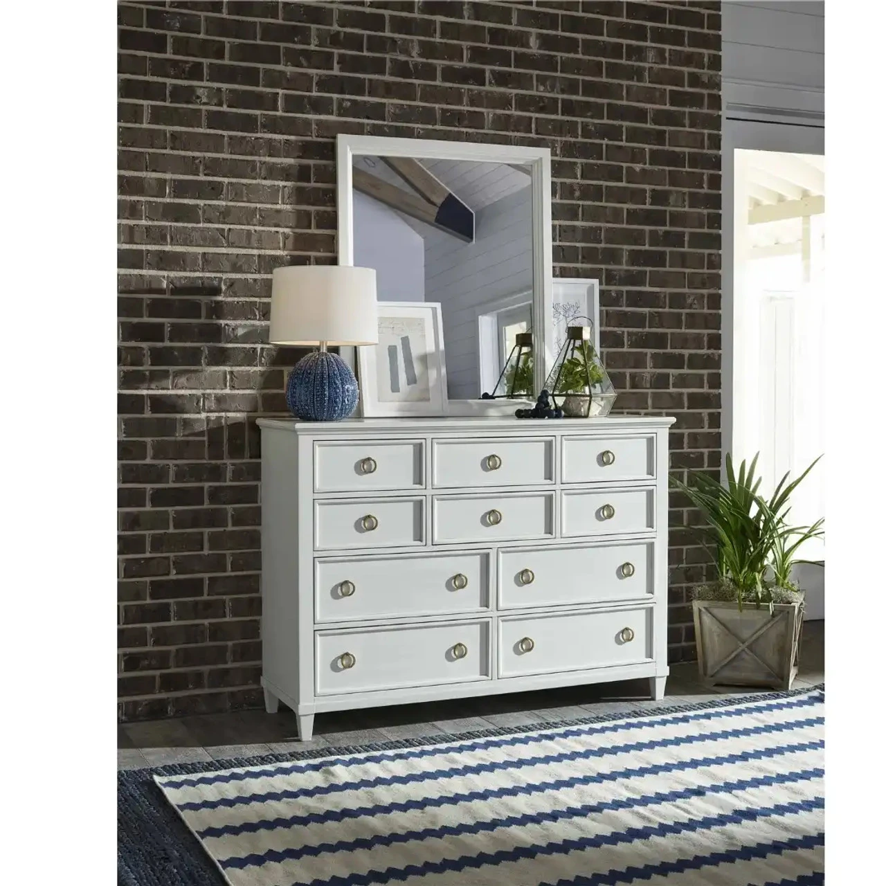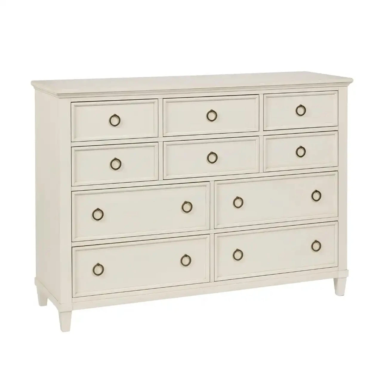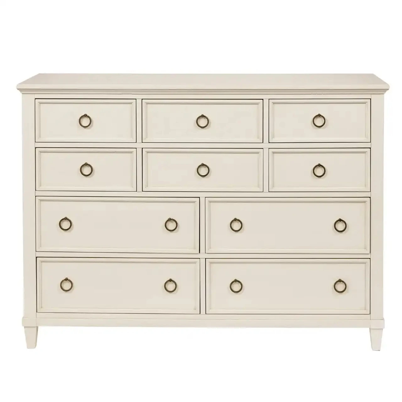 Brighten bedroom spaces with the Bondi Beach Dresser, a classic storage piece built with ten drawers featuring sleek bronze ring pull hardware and tapered legs.