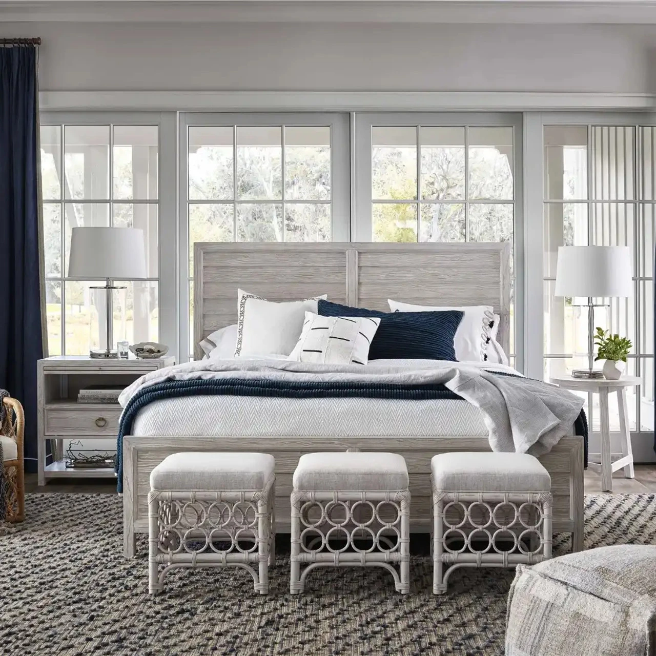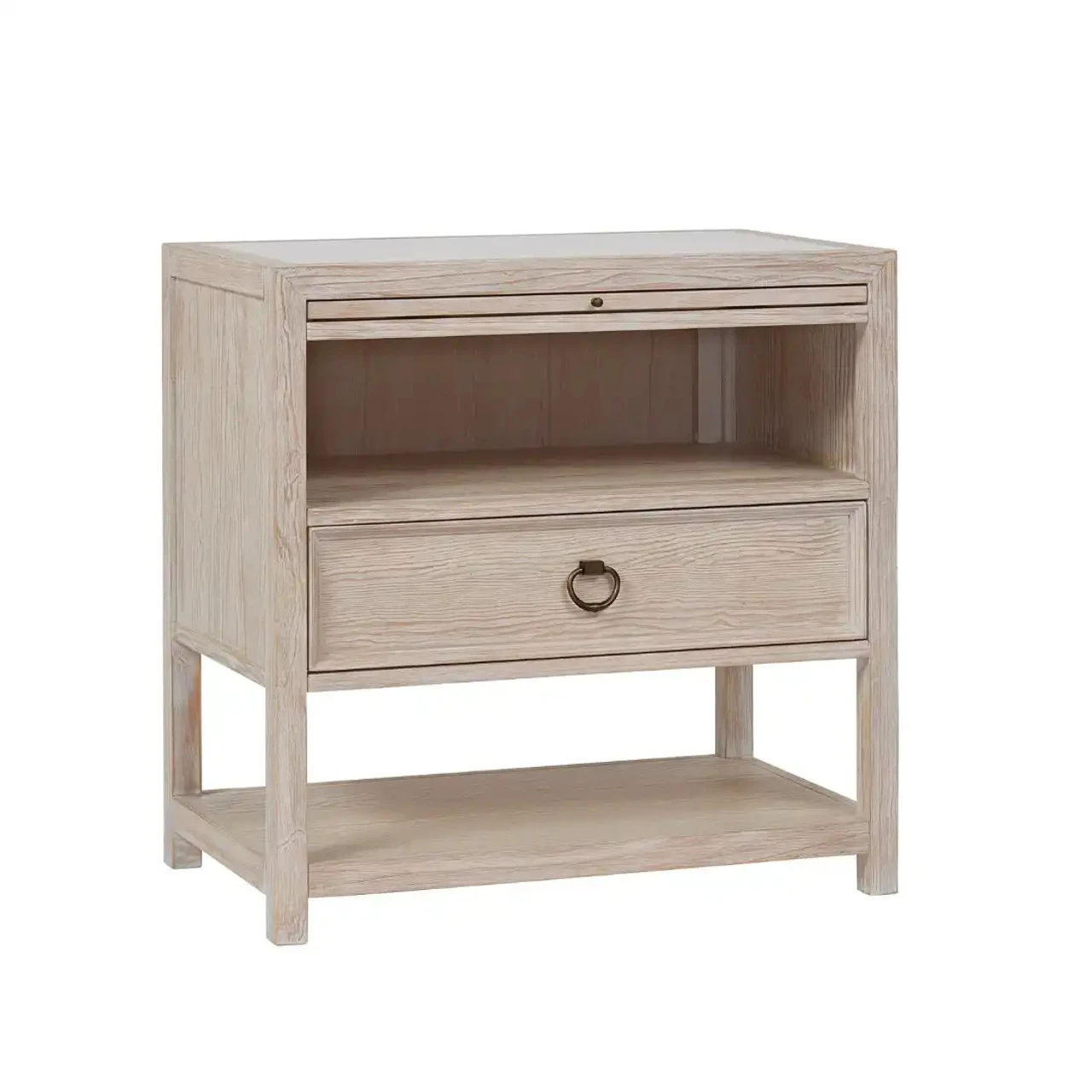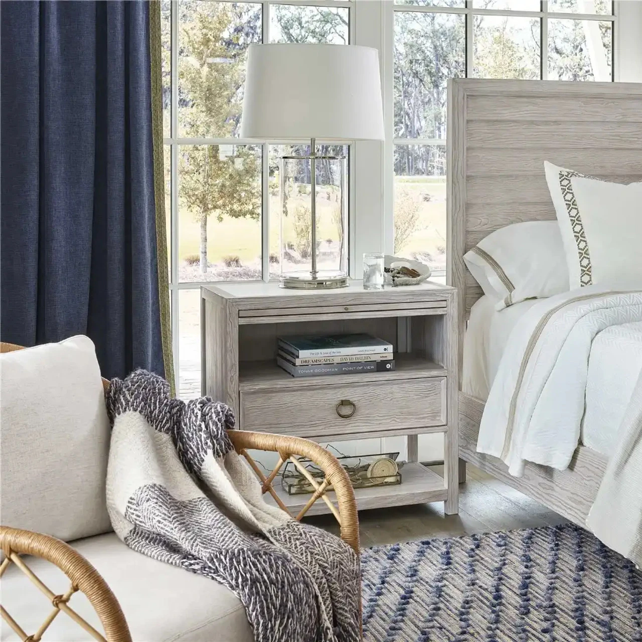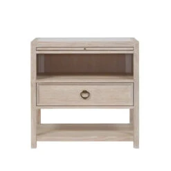 The perfect bedside companion, the Getaway Drawer Nightstand marries the best of function and coastal style with open-air storage, a spacious drawer, smooth stone inset top, pull-out shelf and bronze ring pull hardware