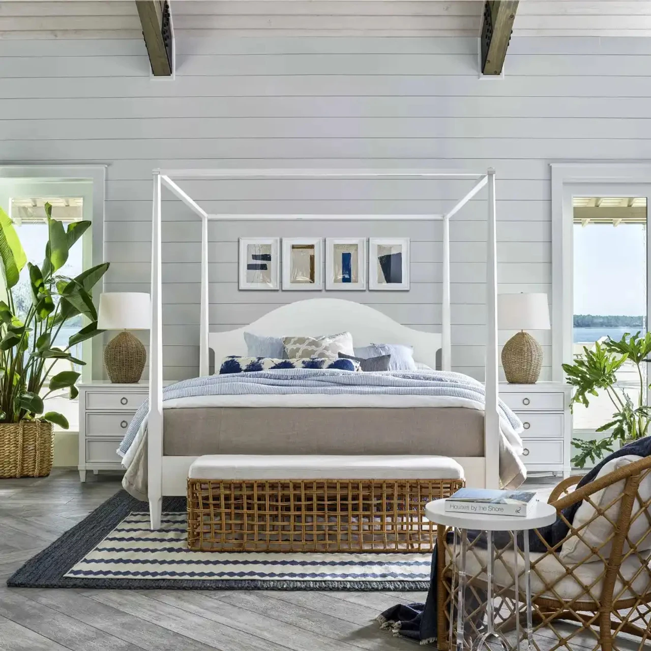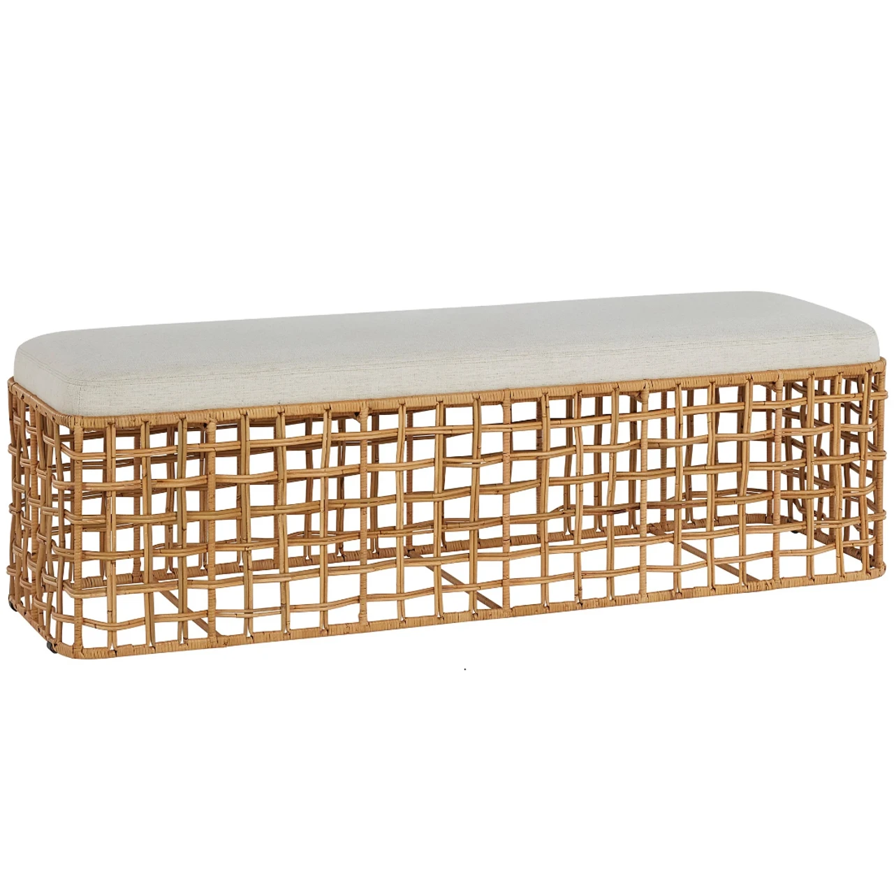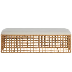 A full-bodied texture piece, the Rattan Bench features an interlaced wicker body with an upholstered seat, making it the perfect accent piece for bed-ends, hallways, and more.