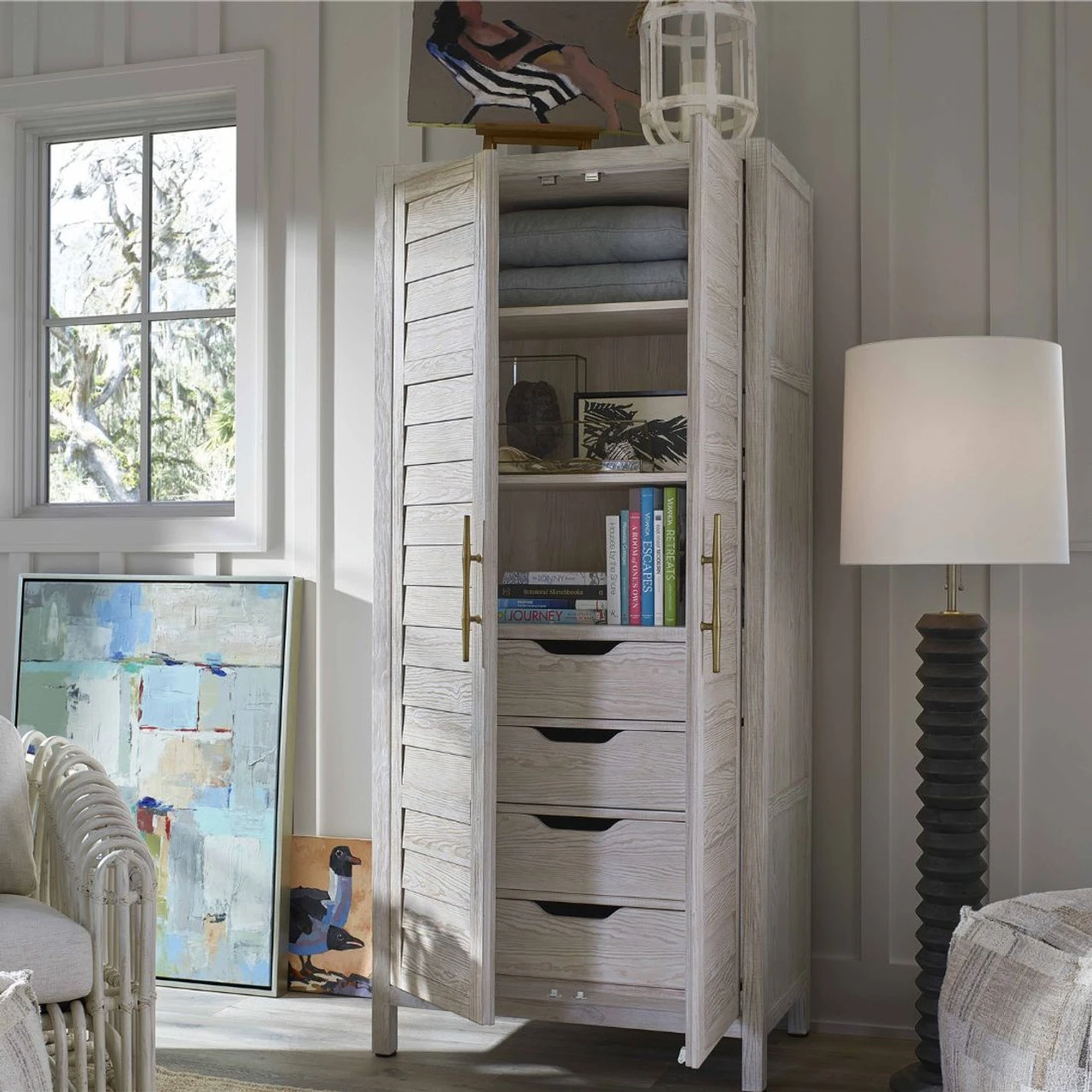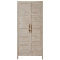 A stunning natural finish, perfectly paneled doors and sleek bronze bar hardware define the Getaway Utility Cabinet, an essential home storage piece.