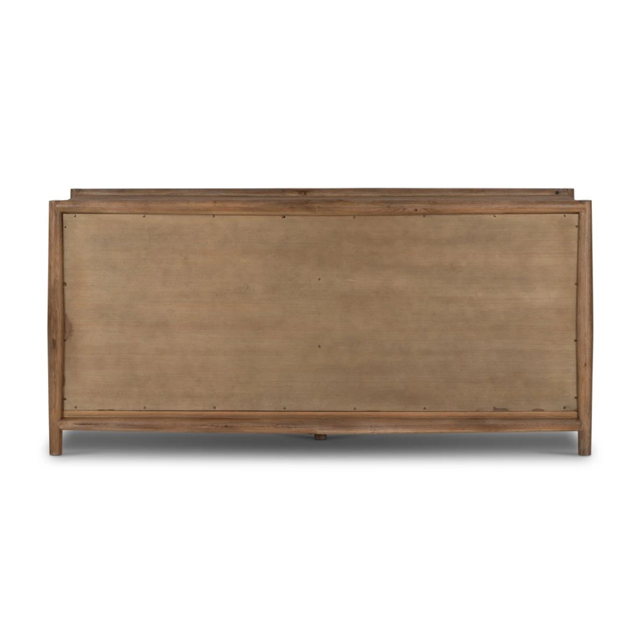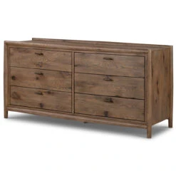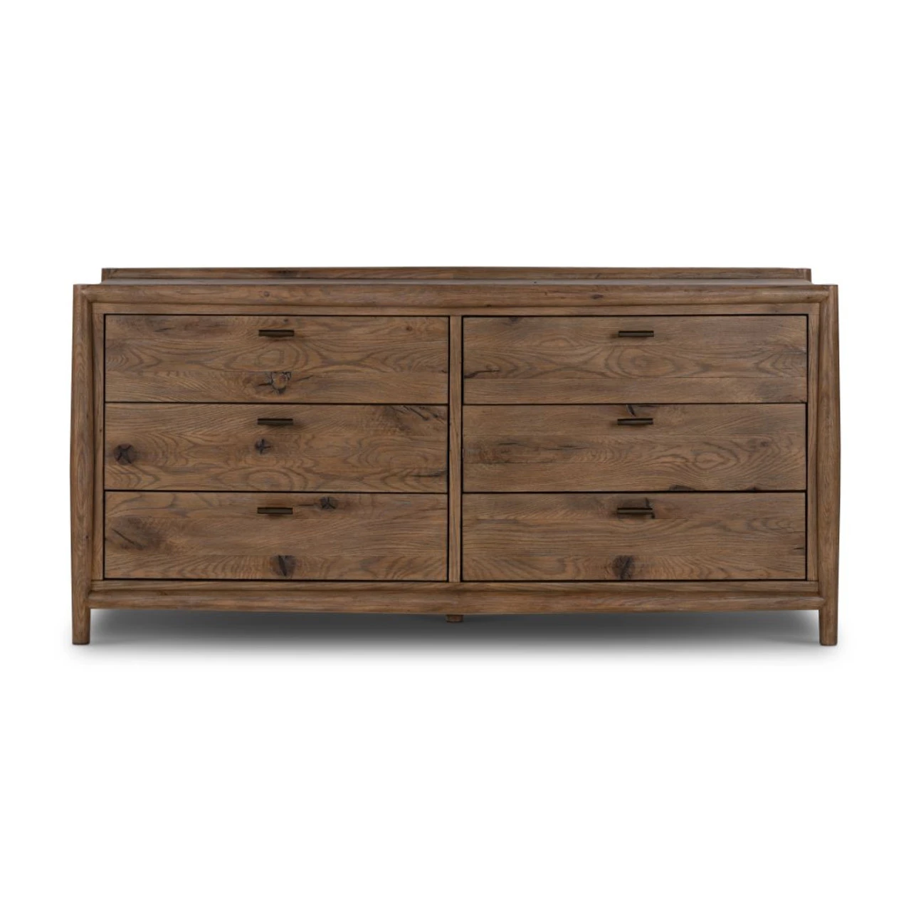The traditional spindle structure brought to modern speed. Made from weathered oak with a light, rustic finish, six spacious drawers bring generous storage space to the bedroom. Contemporary cylindrical hardware is finished in an aged bronze.