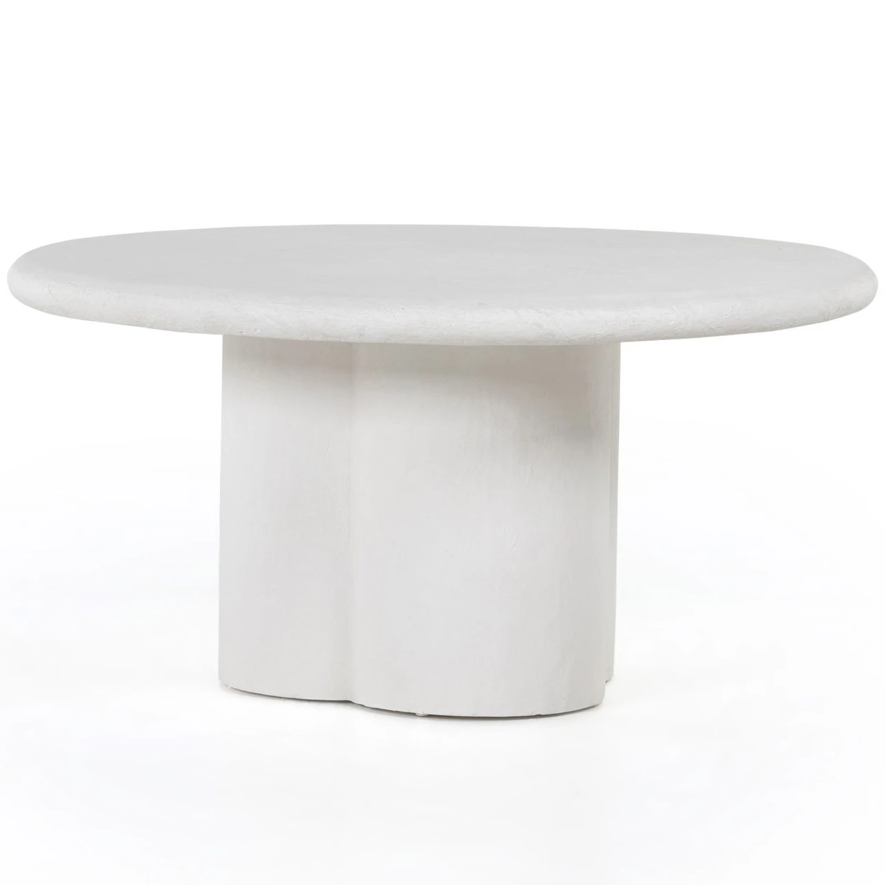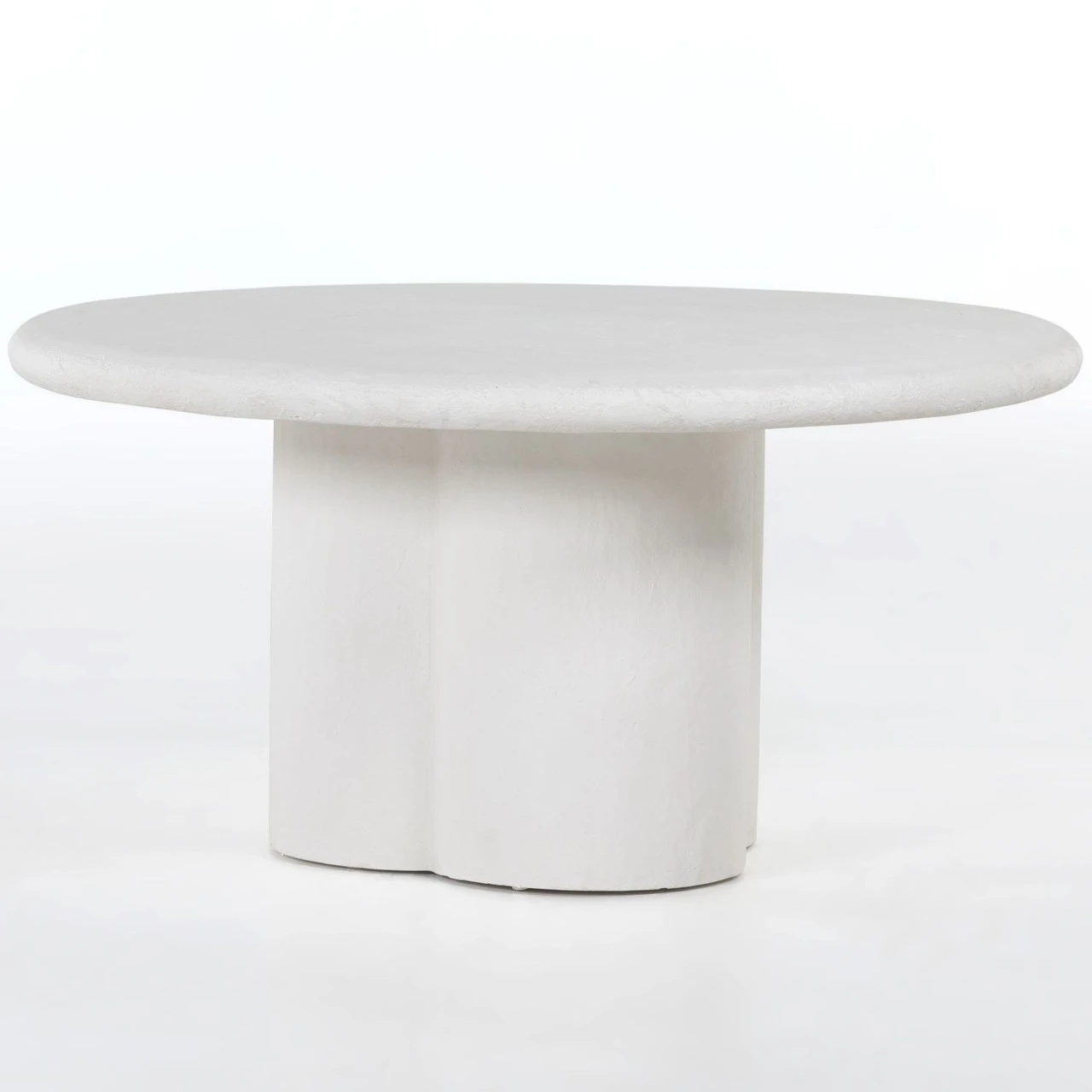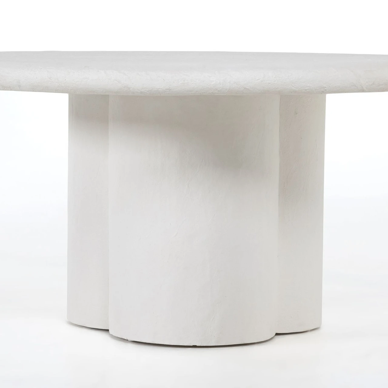 Crisp, clean adobe vibes. Made from white-finished concrete, a voluminous clover-shaped base supports a thick-rounded tabletop for dramatic scale. Soft yet textured look pairs with a wide range of seating, from natural woods to leather, and more.
