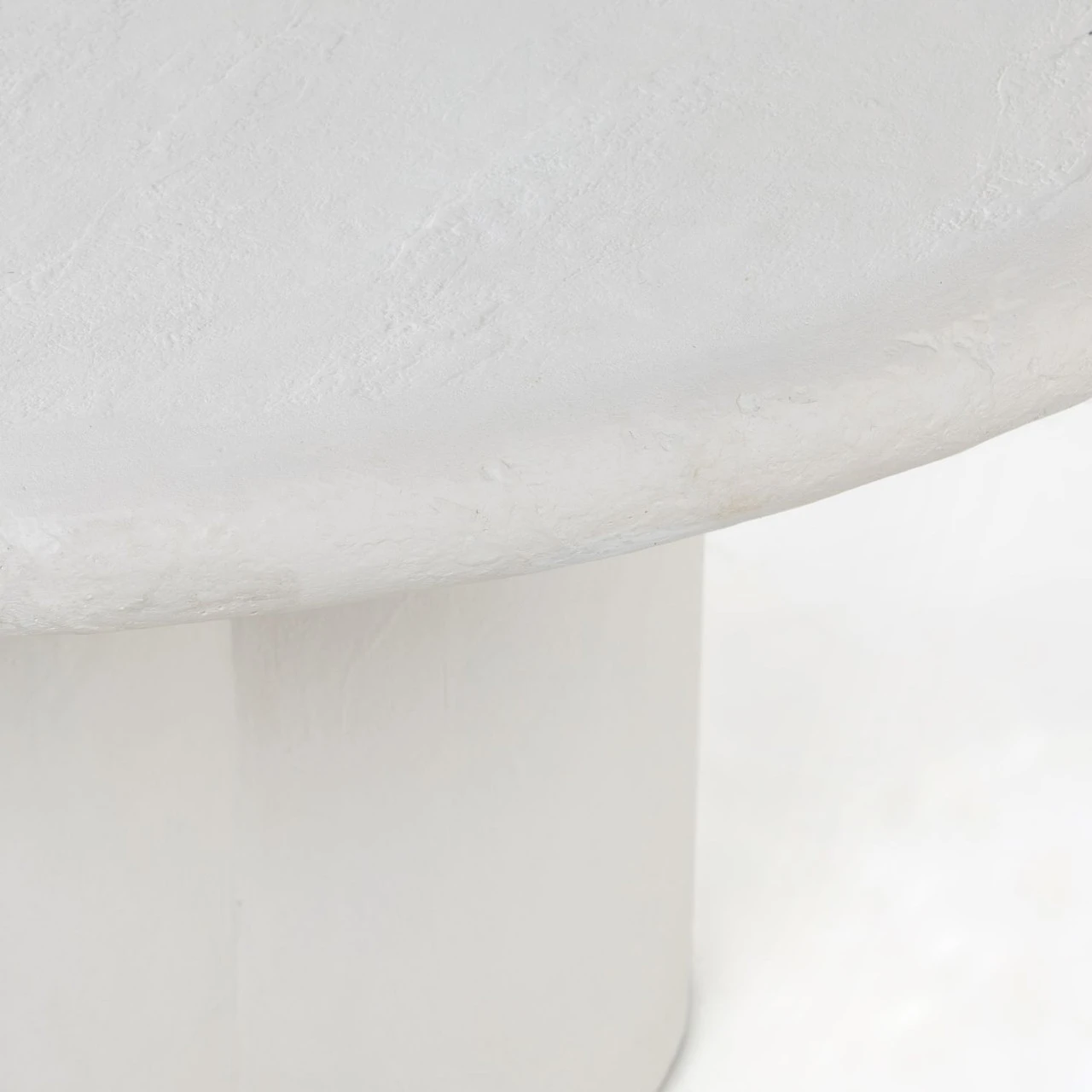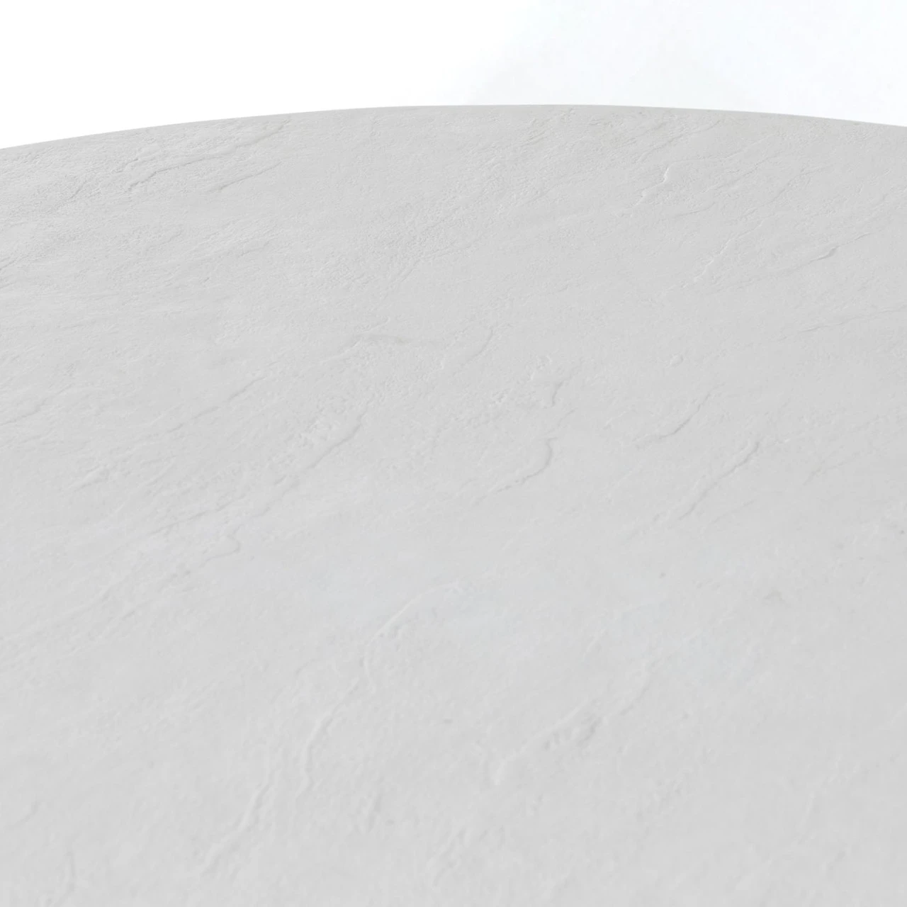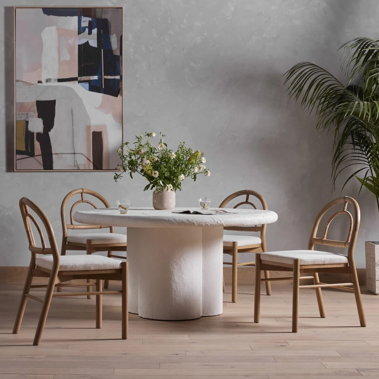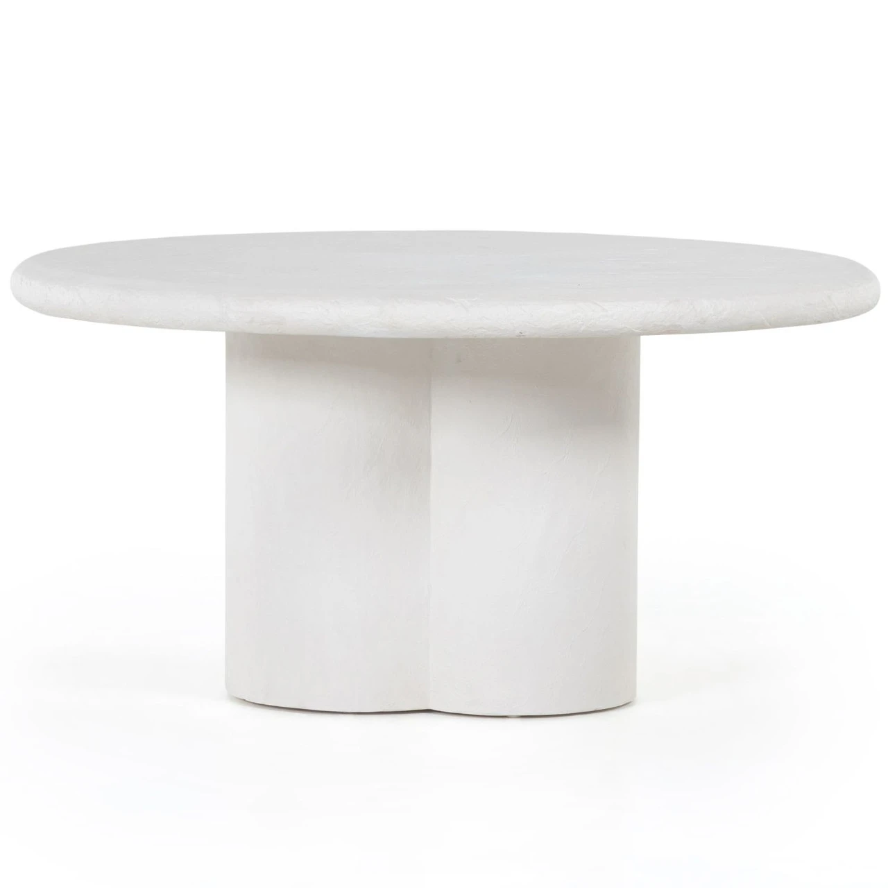 Crisp, clean adobe vibes. Made from white-finished concrete, a voluminous clover-shaped base supports a thick-rounded tabletop for dramatic scale. Soft yet textured look pairs with a wide range of seating, from natural woods to leather, and more.