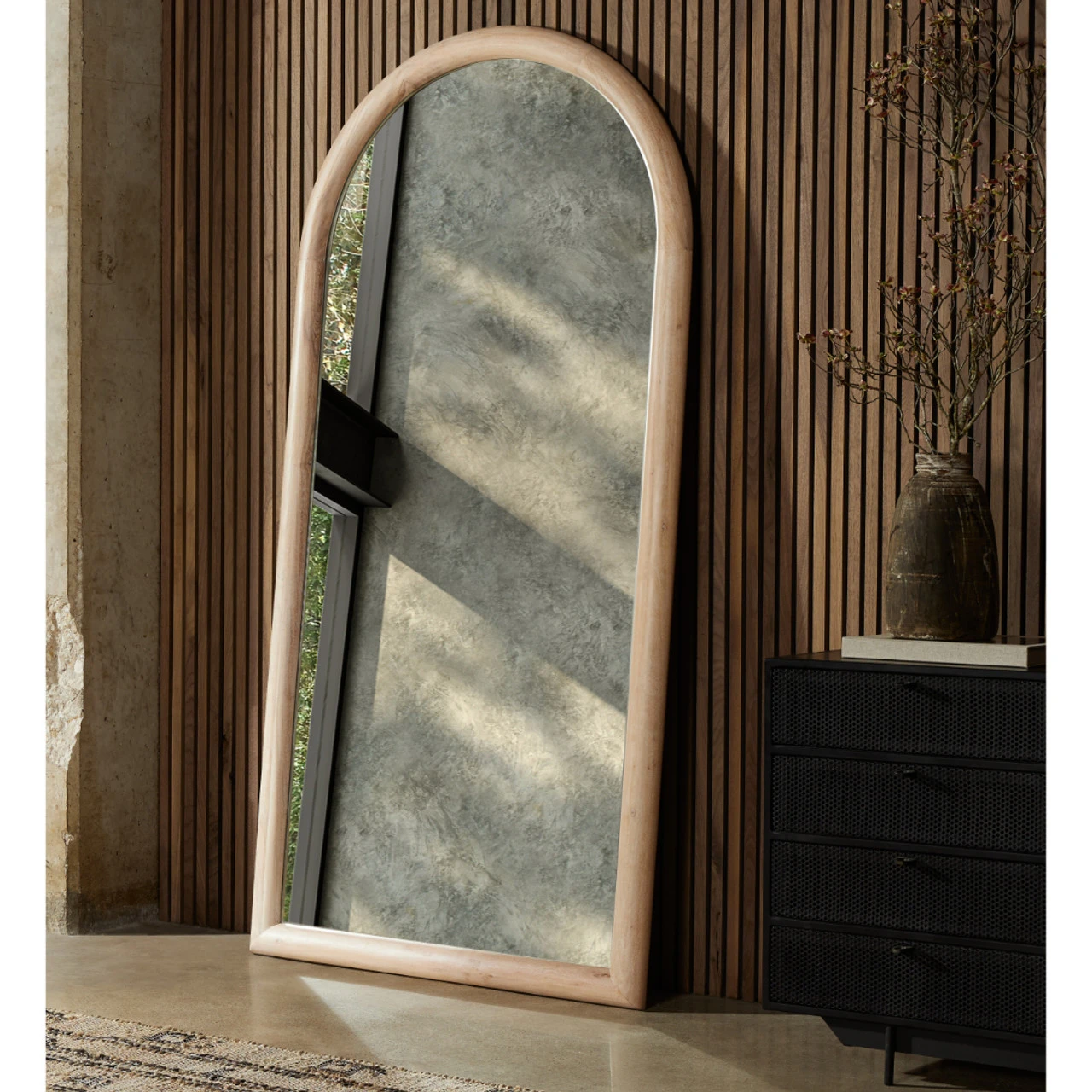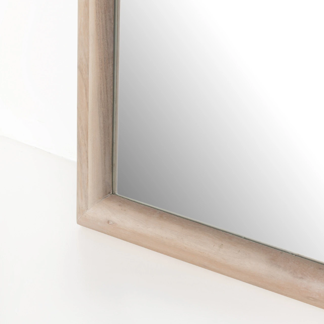 Solid acacia is shaped and smoothed with a whitewash finish to bring a vintage art deco-inspired frame to this mirror.