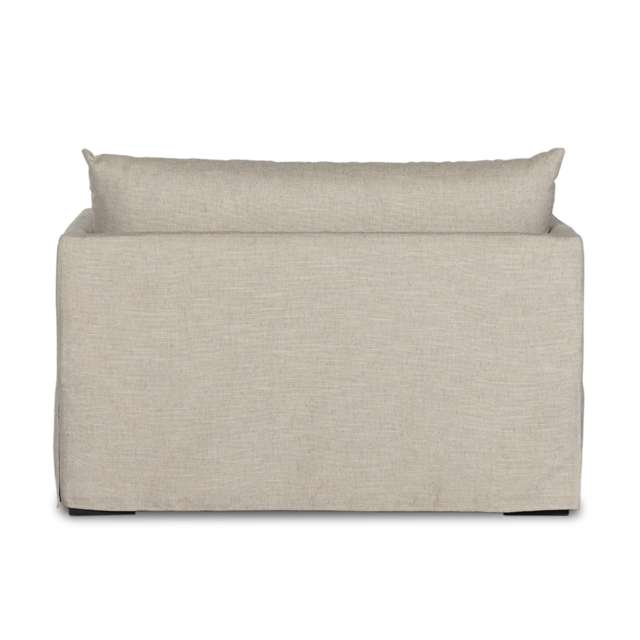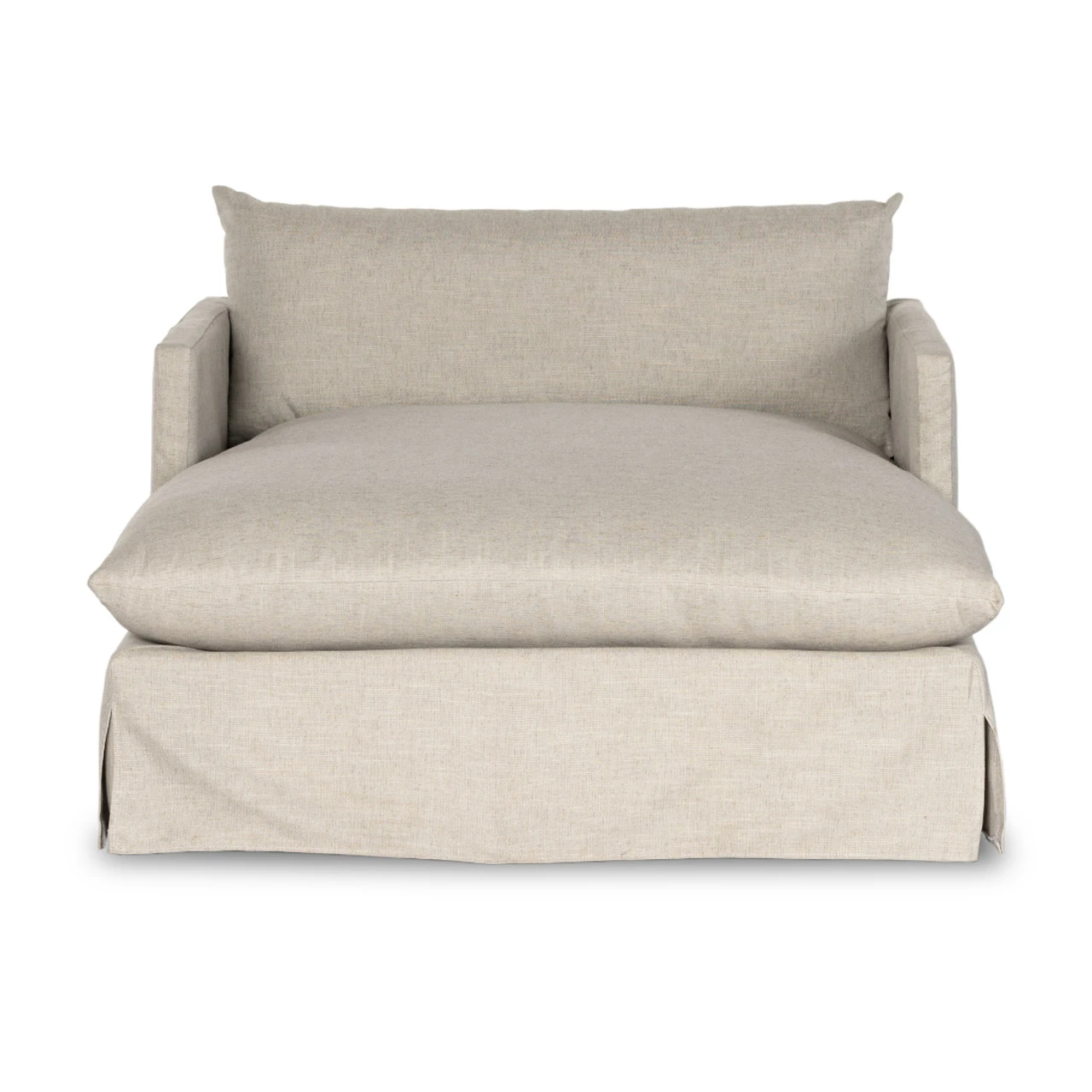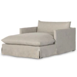 Chaise-style lounging, made for modern living. Neutral-toned upholstery covers shelter arms and oversize pillow-inspired cushion. Performance fabrics are specially created to withstand spills, stains, high traffic and wear, ensuring long-term comfort and unmatched durability.