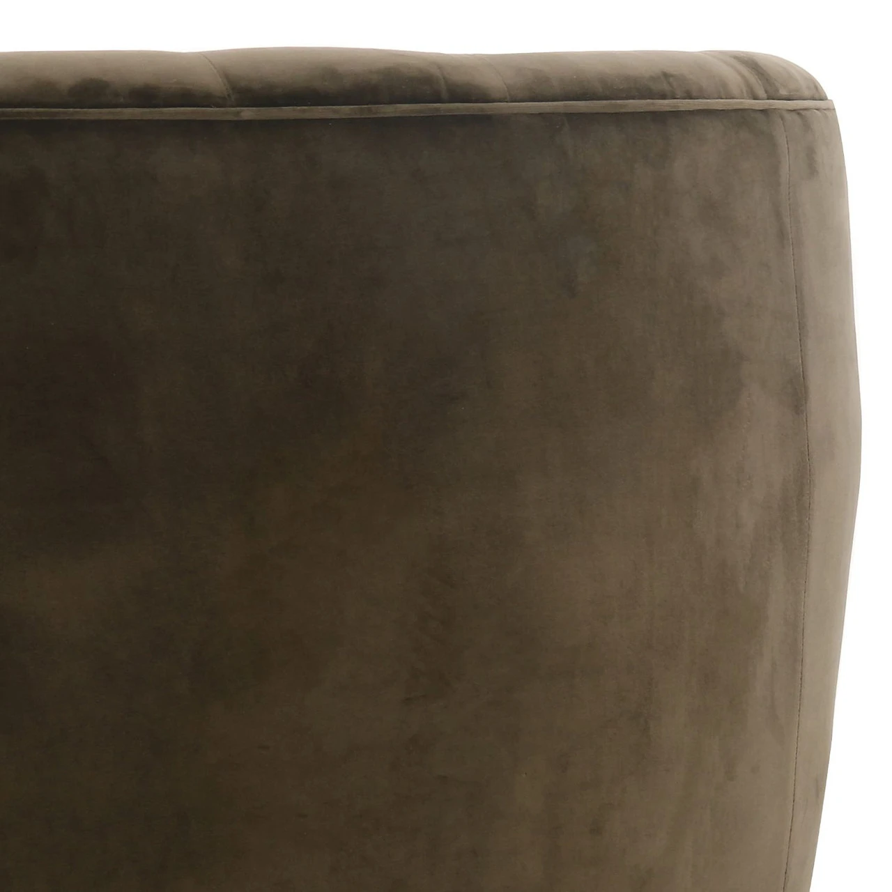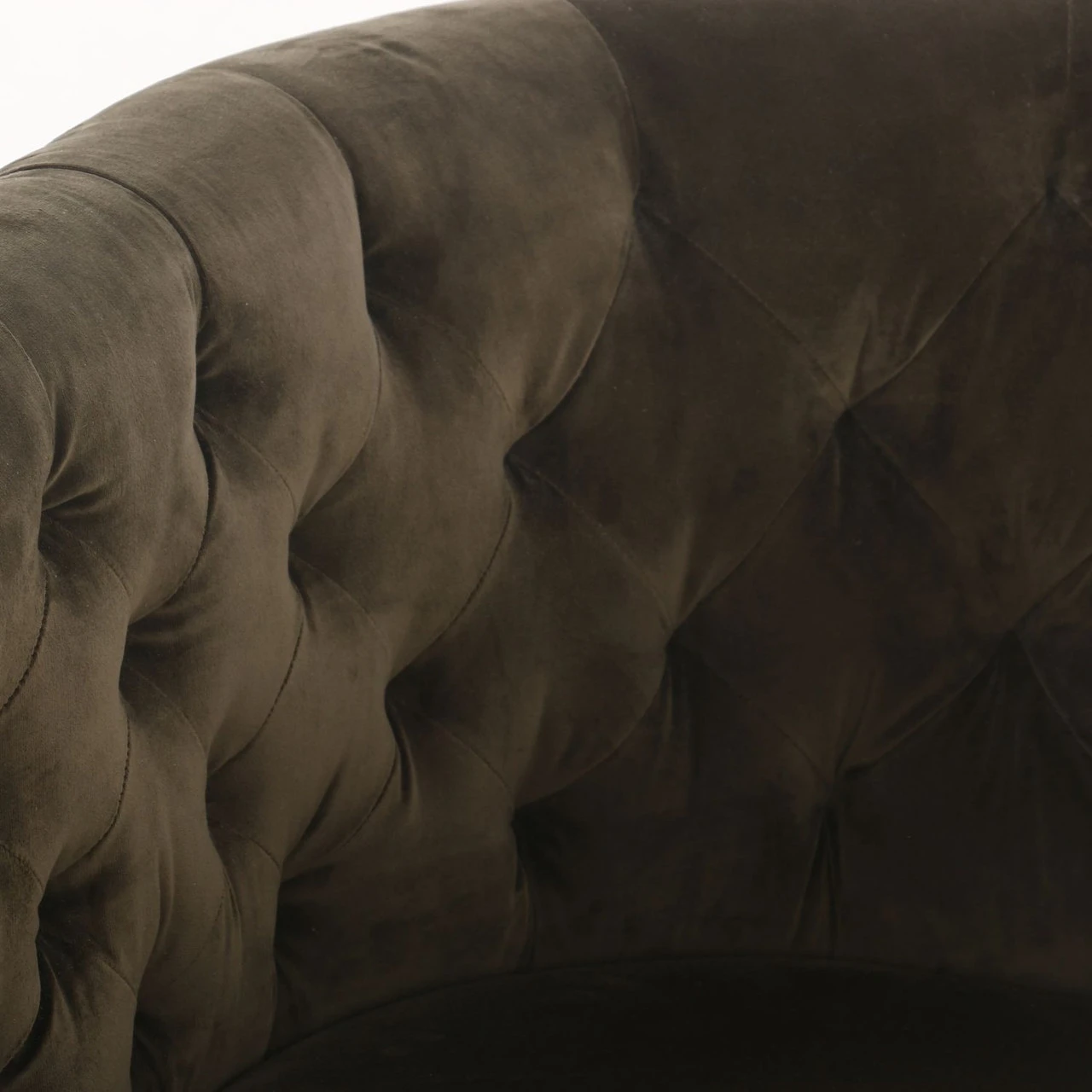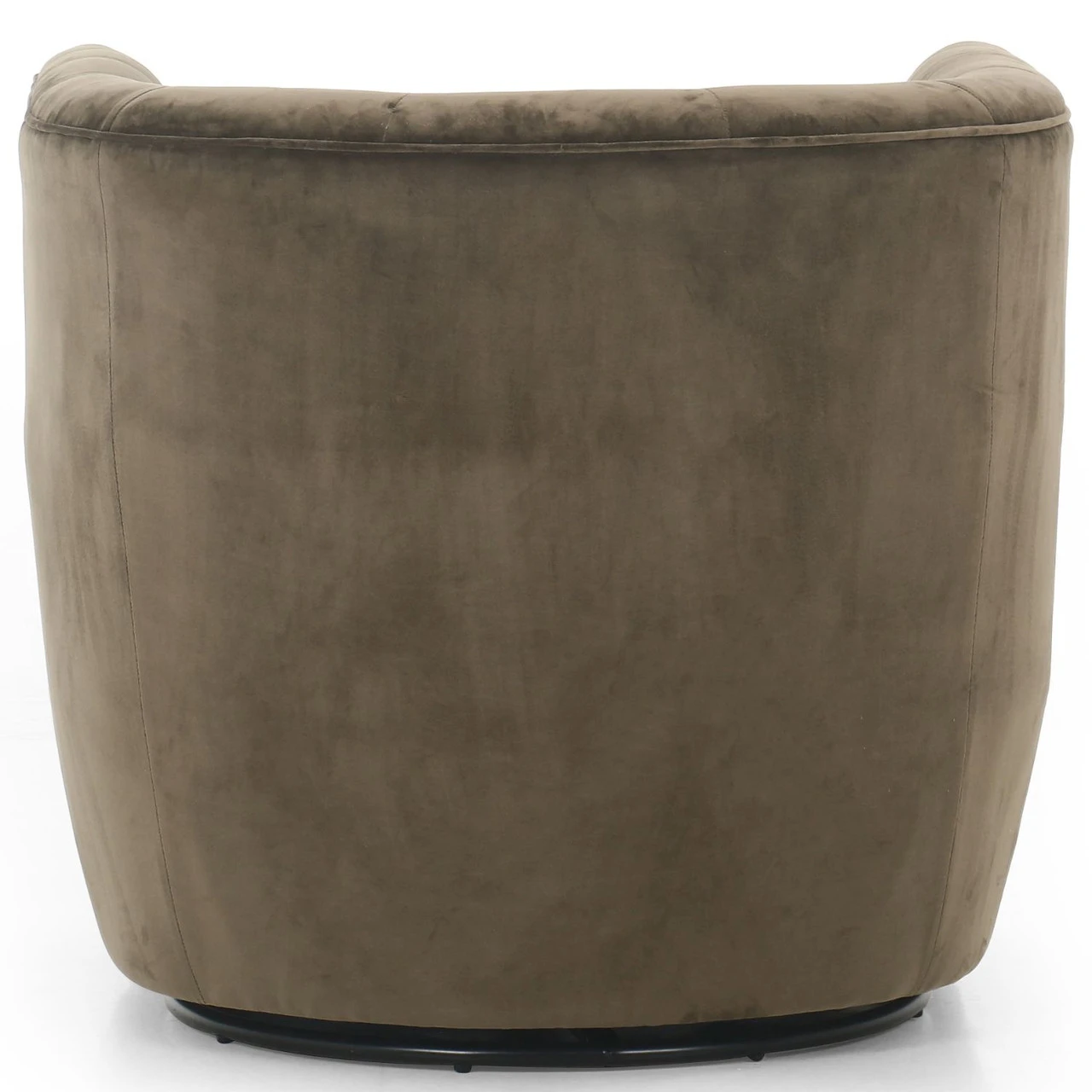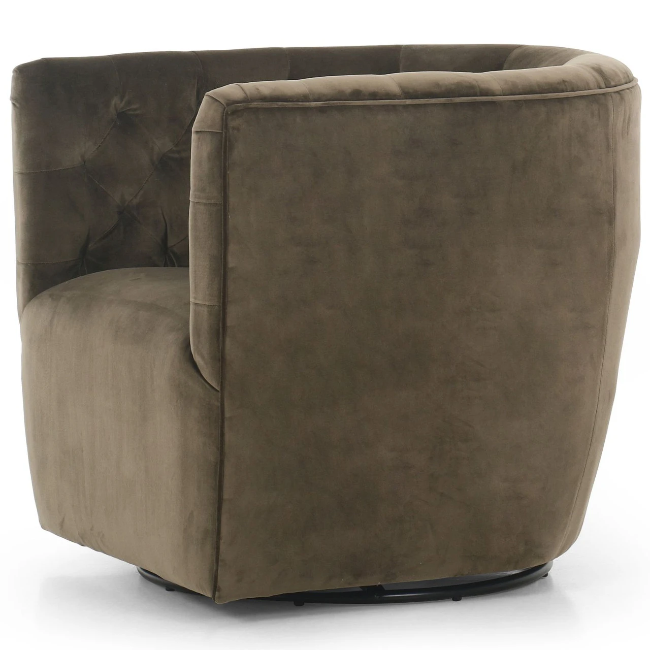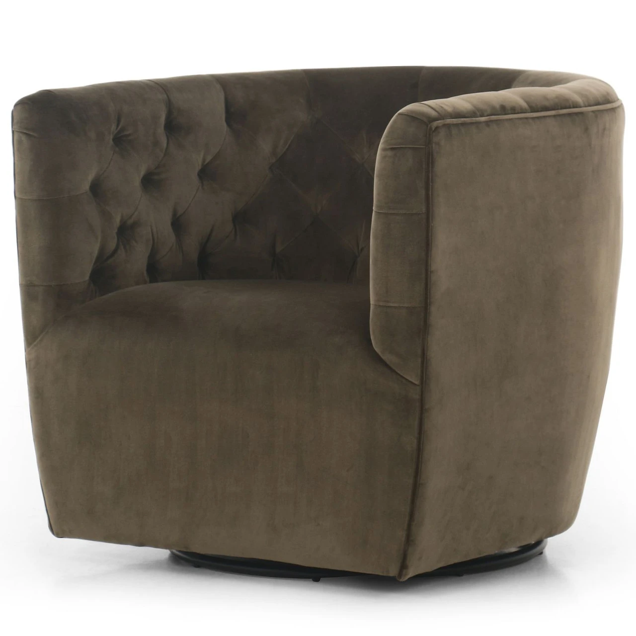 A perfectly curved statement on a swivel. Velvety olive-colored upholstery is pristinely tailored, with dramatic blind tufting and high, shapely arms.