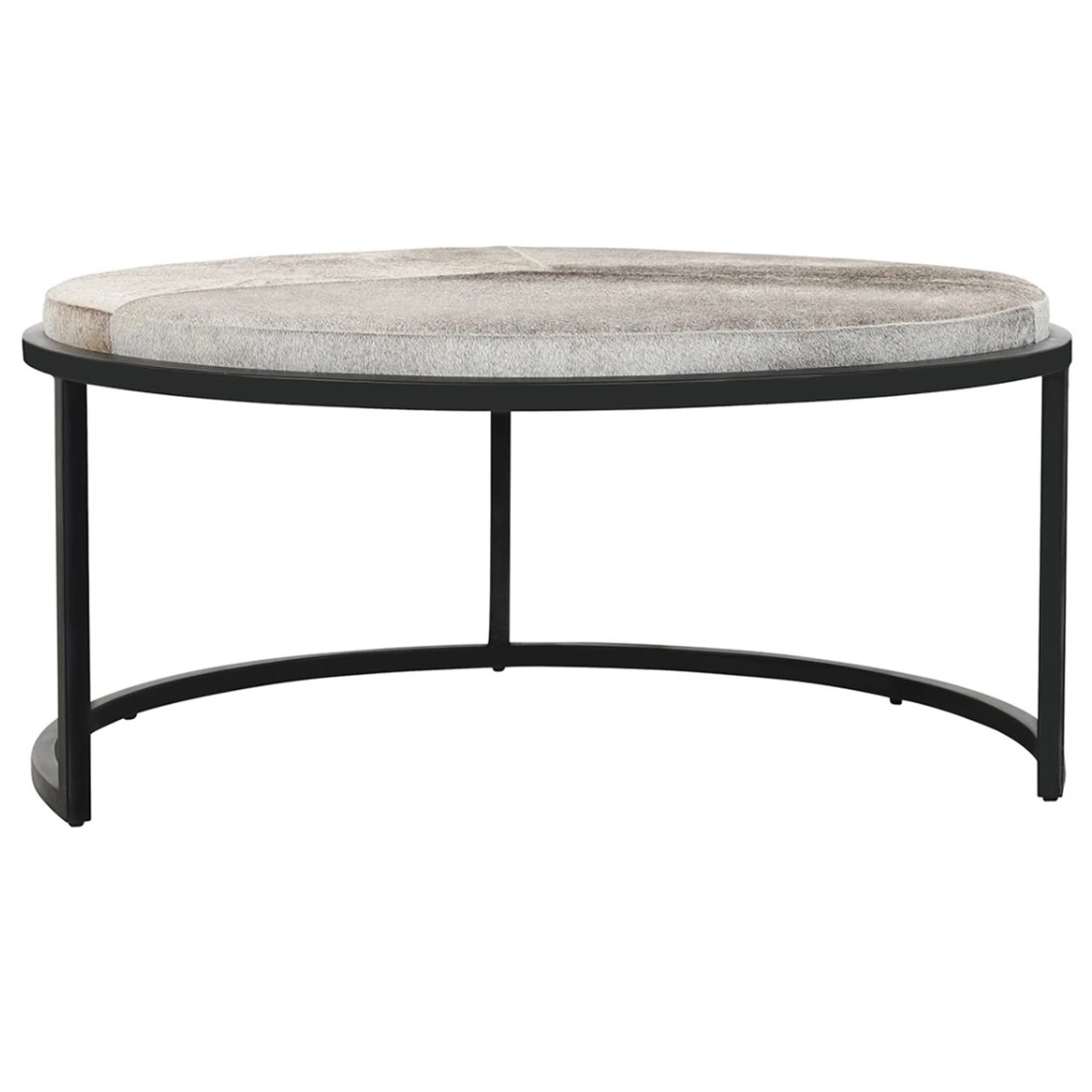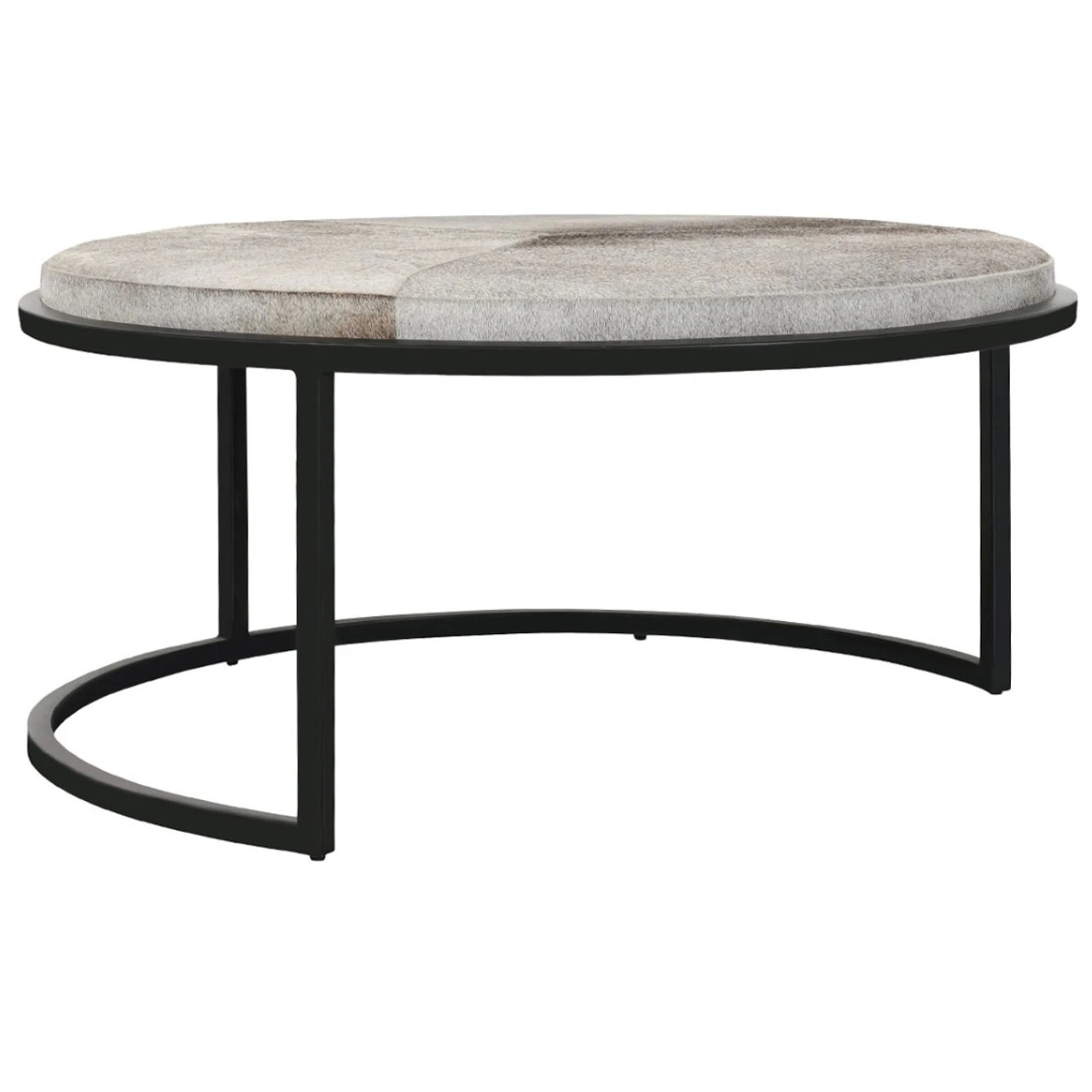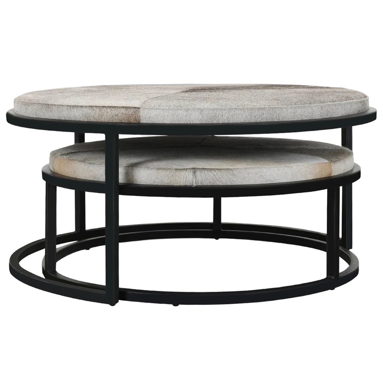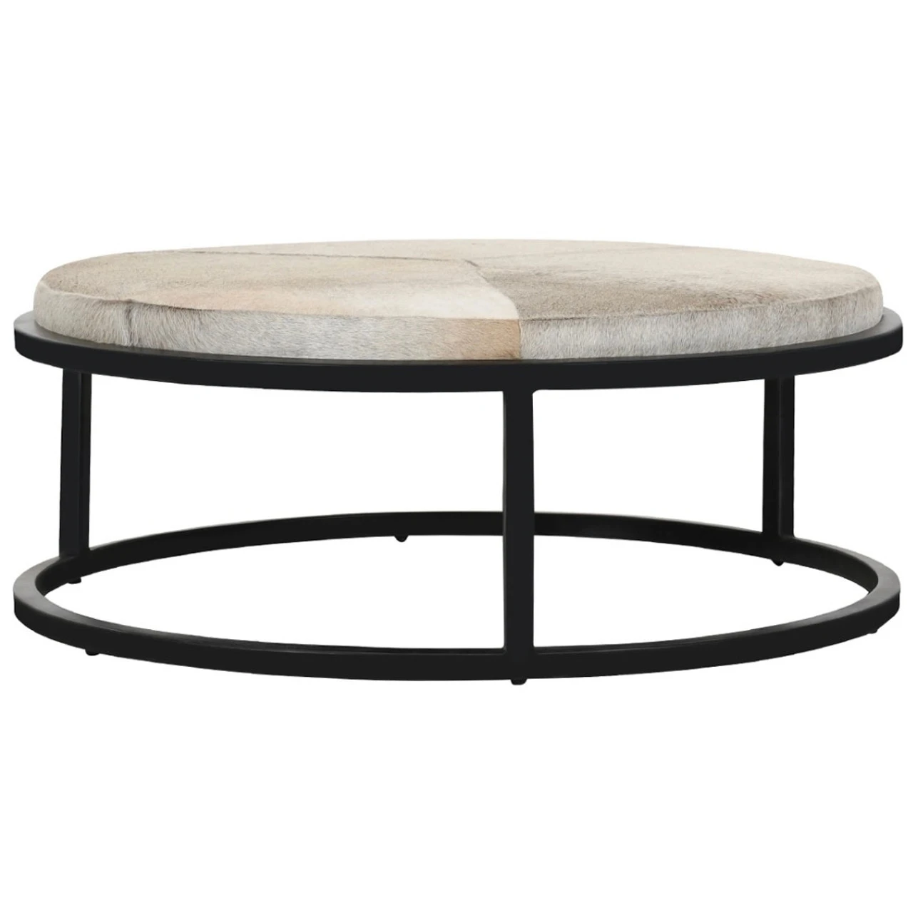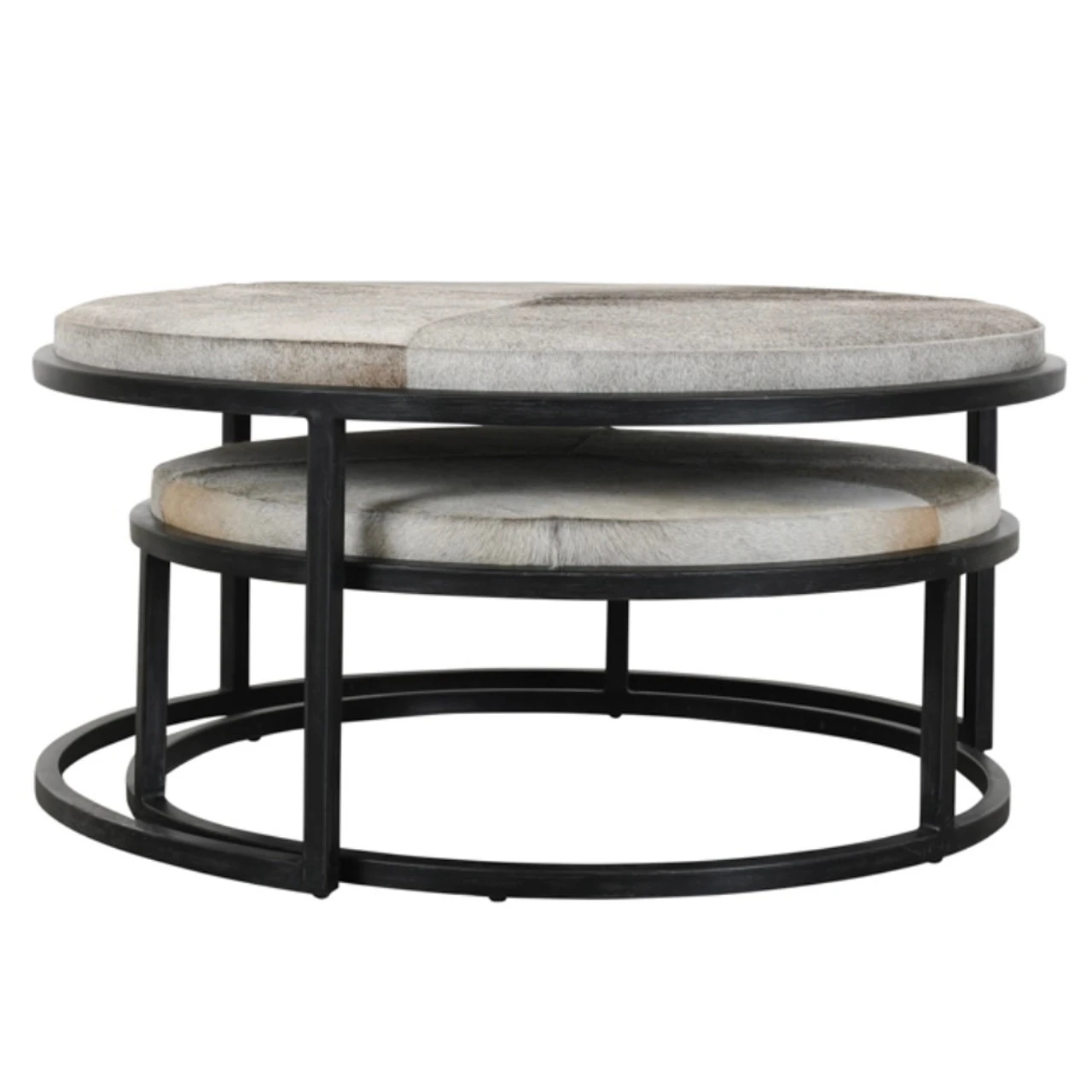 - Upholstered genuine hair-on-hide patchwork tables with foam cushions.