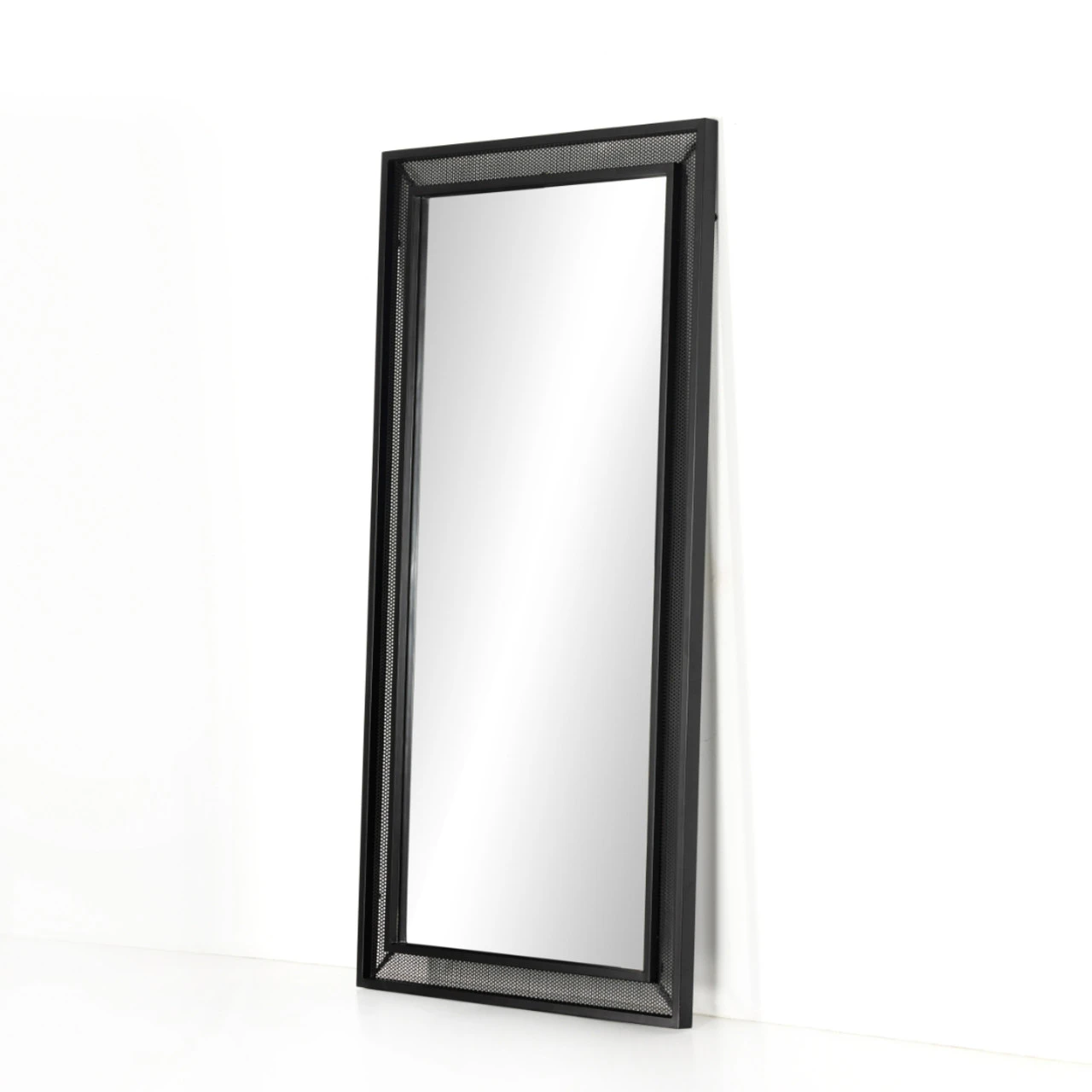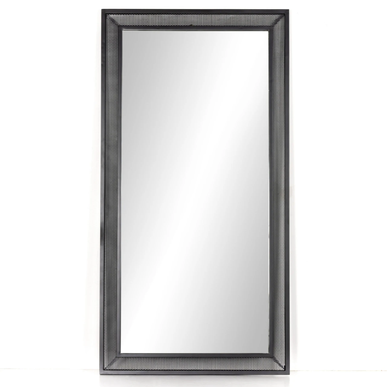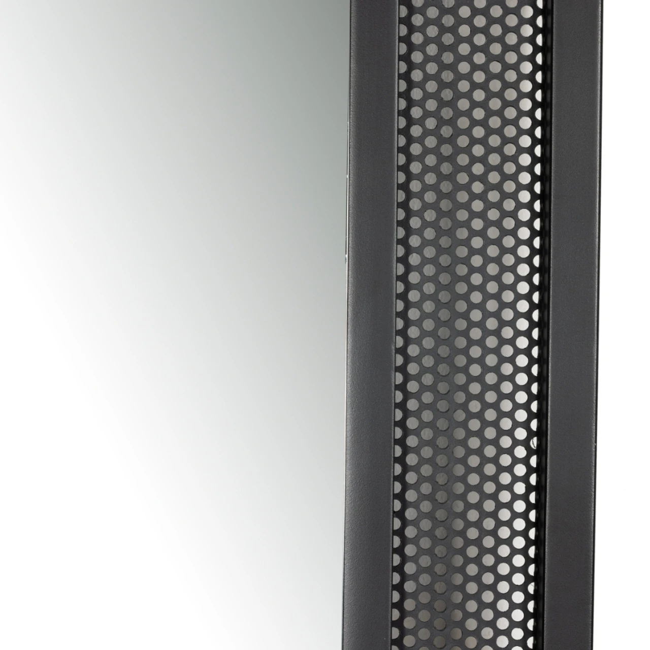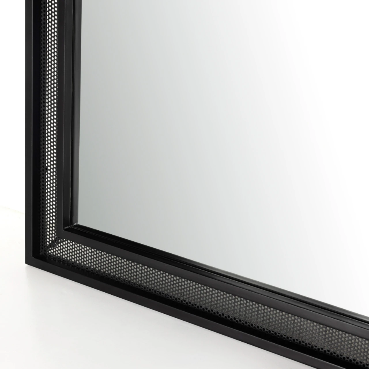 Gunmetal-finished iron forms a clean rectangle to frame mirrored glass. Perforated brass adds an edgy, textural touch.
