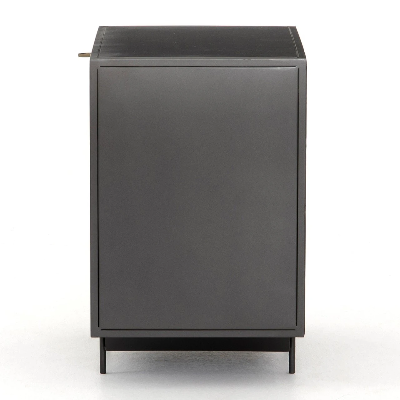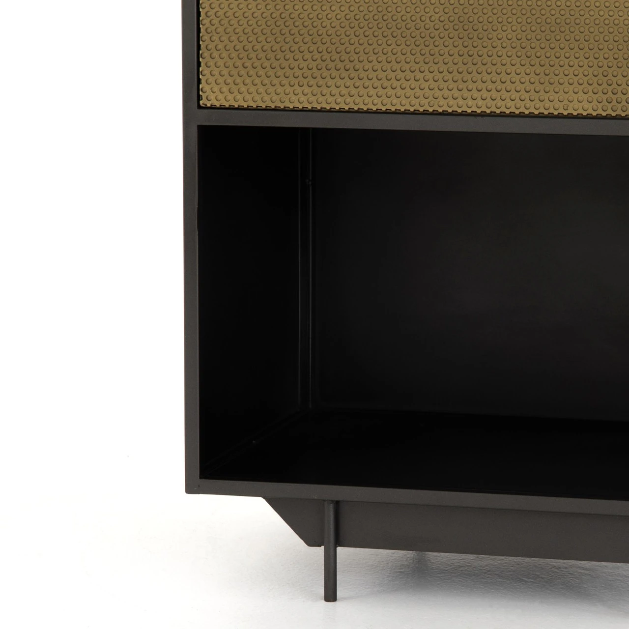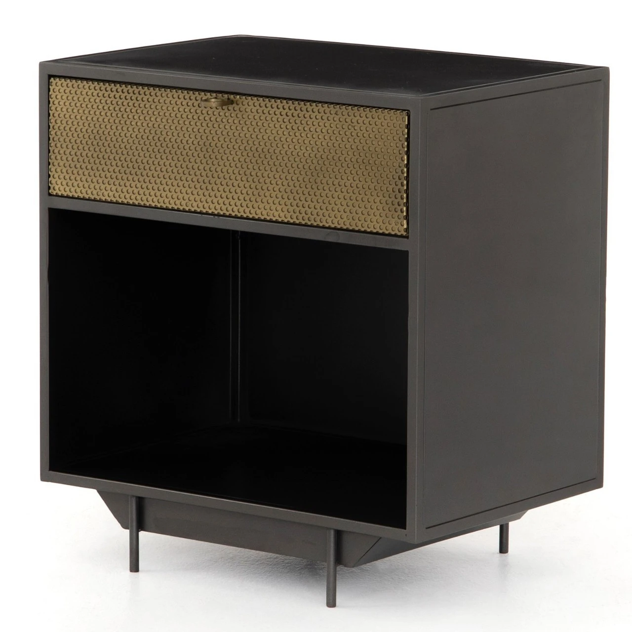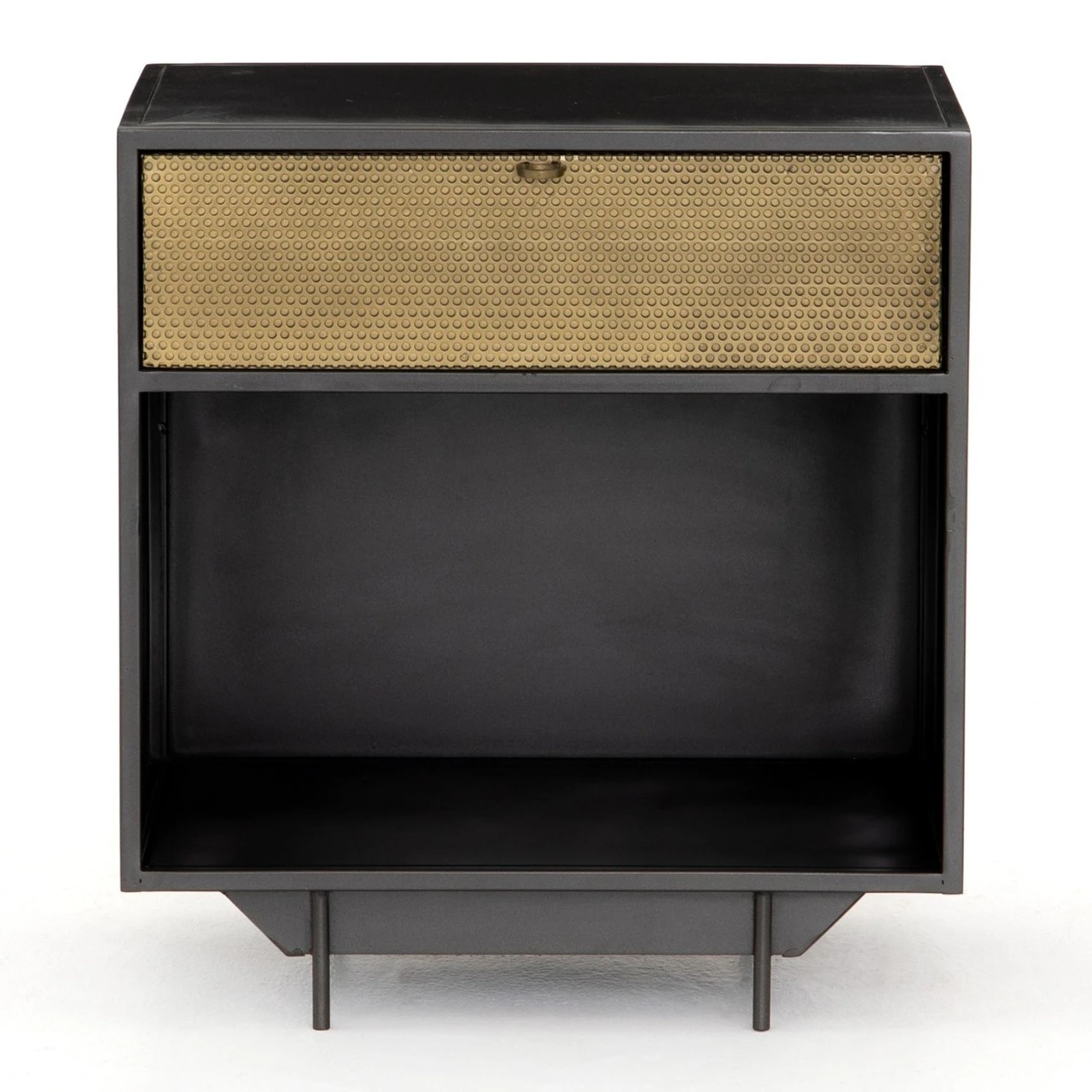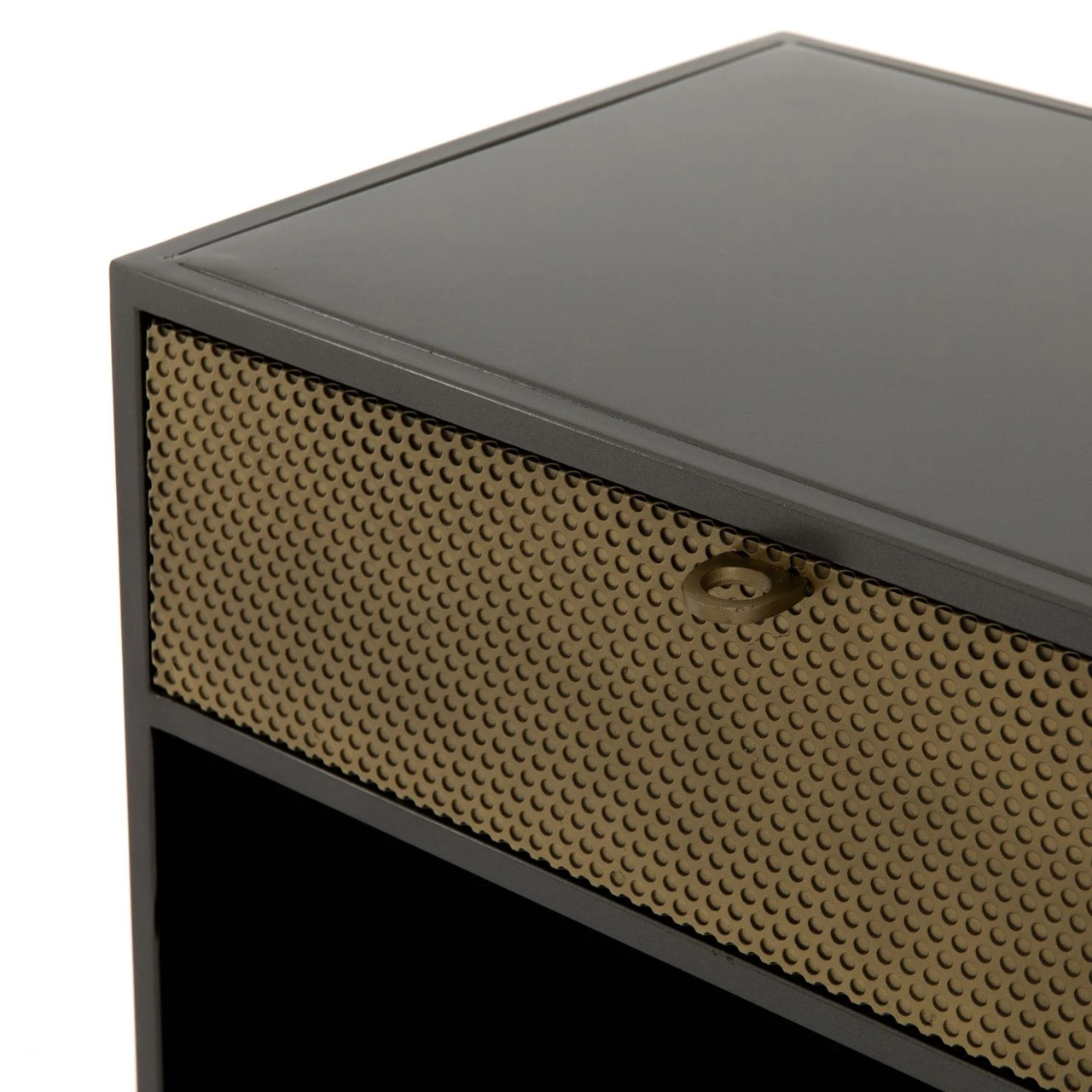 Taking inspiration from a vintage French automobile factory cabinetry, perfectly suited to life as a nightstand or side table. A mid-century form undergoes a modern, texture-rich refresh via cutting-edge materials. Cubed iron framing welcomes a single drawer of perforated brass, as ring-style hardware adds a unique finishing touch to bedside storage.