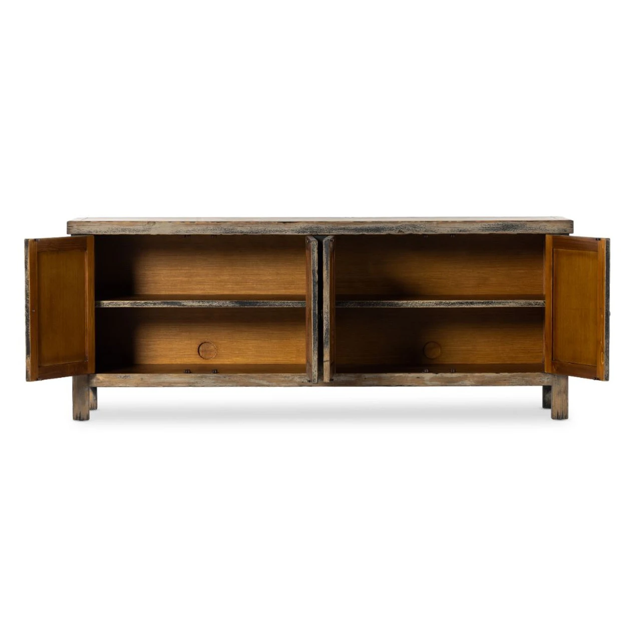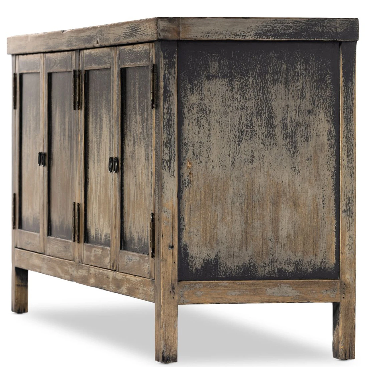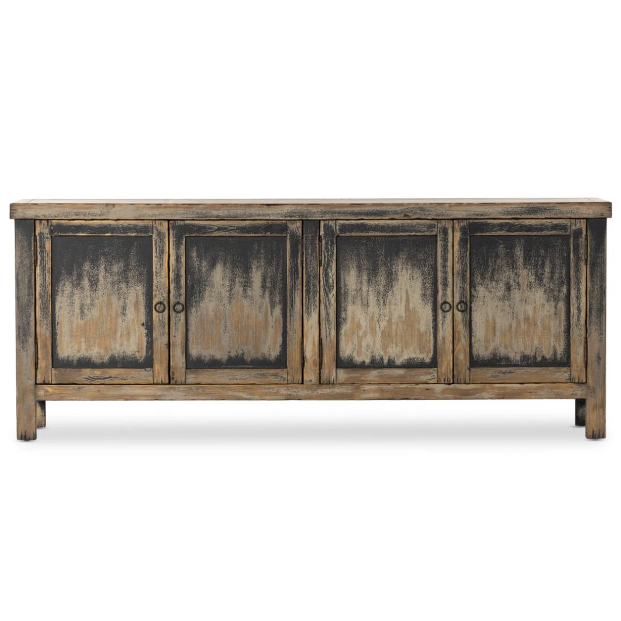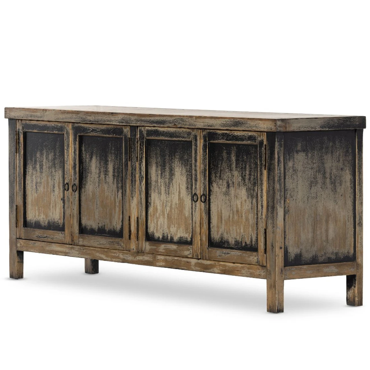 Inspired by European antiques, a distressed black finish and copper-clad hardware place a vintage twist on modern media storage. Versatile look makes this storage-heavy piece a key player in the living room, entryway, dining room and beyond.