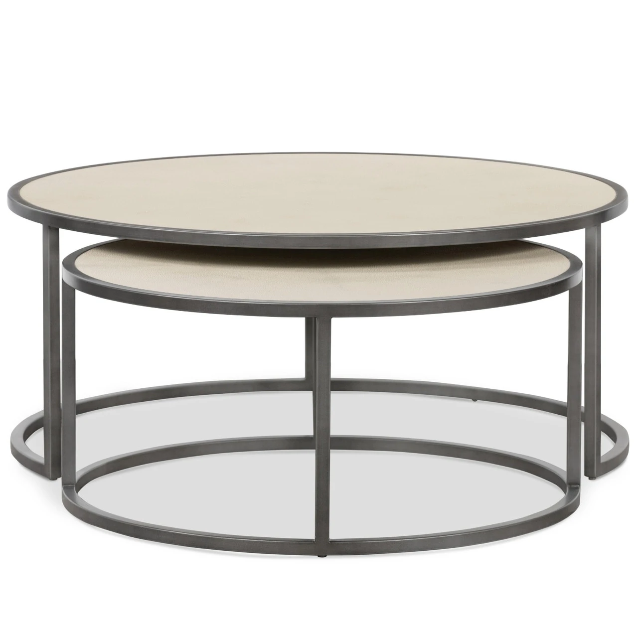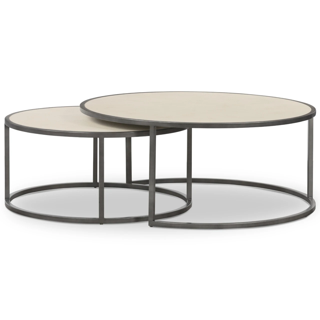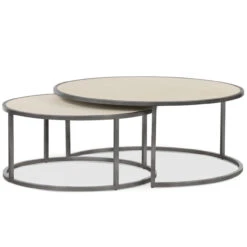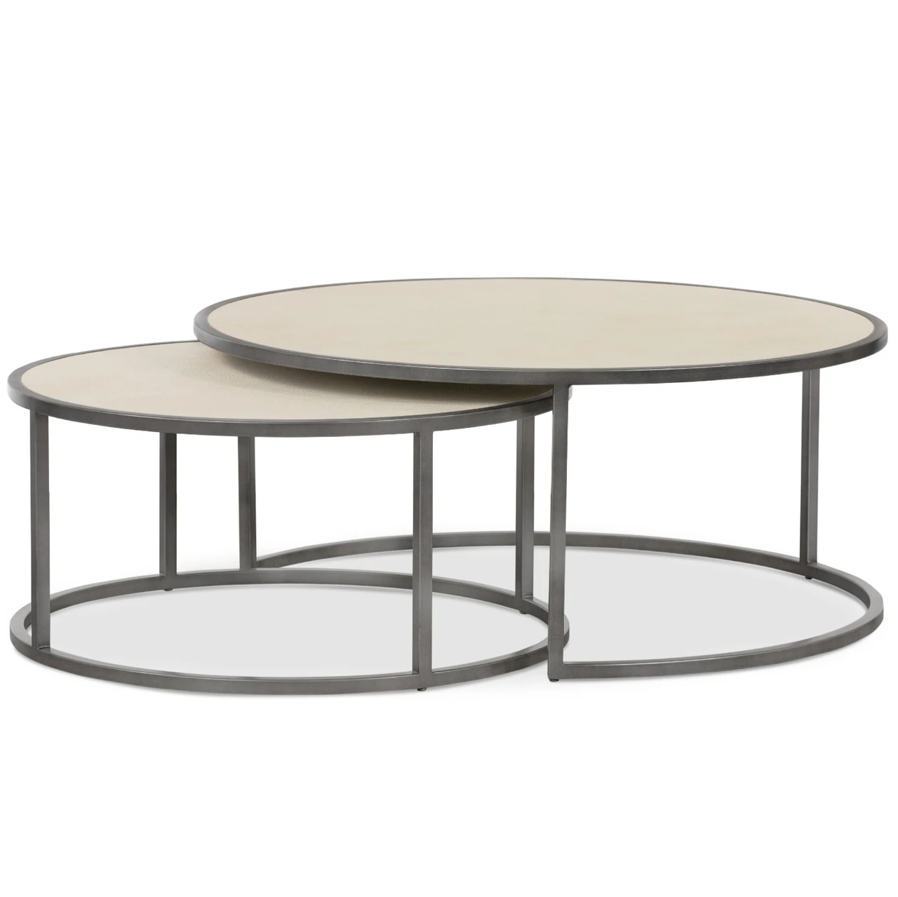 Brushed Gunmetal-finished iron curves like a crescent to welcome a nesting option for its smaller-scaled companion table. A faux shagreen table top in Ivory lends rich texture to clean, modern lines. Larger coffee table measures 38″ in diameter and 16″ in height. Smaller table measures 30″ in diameter and 14″ in height.