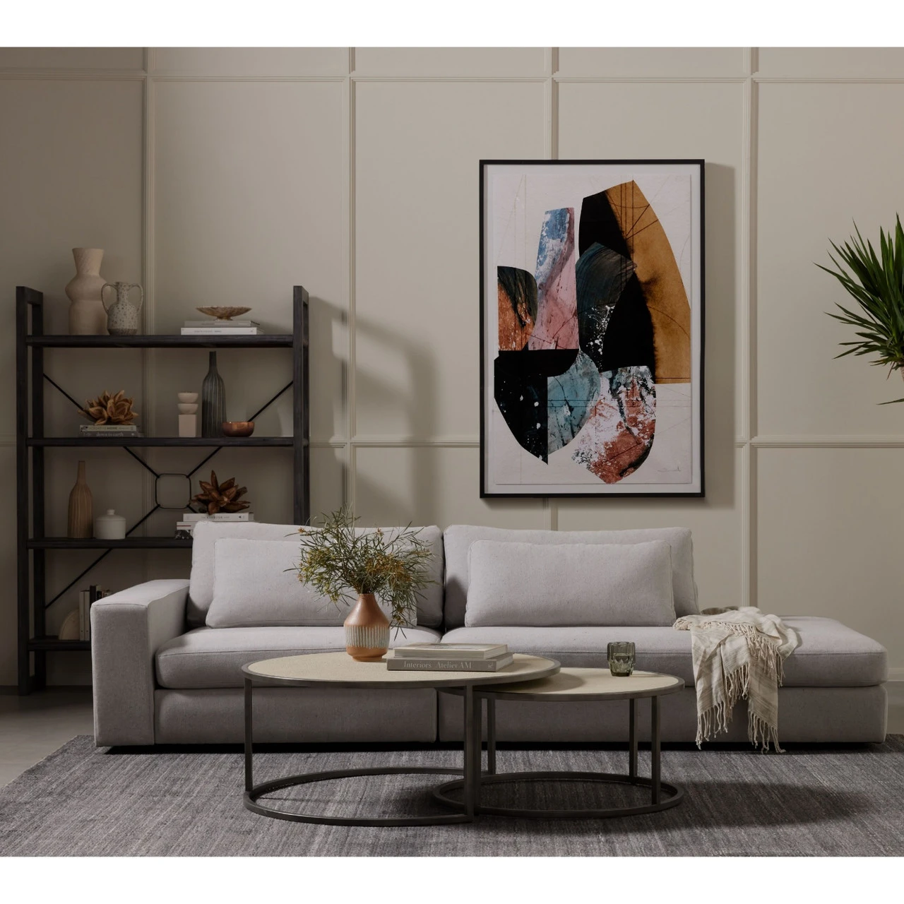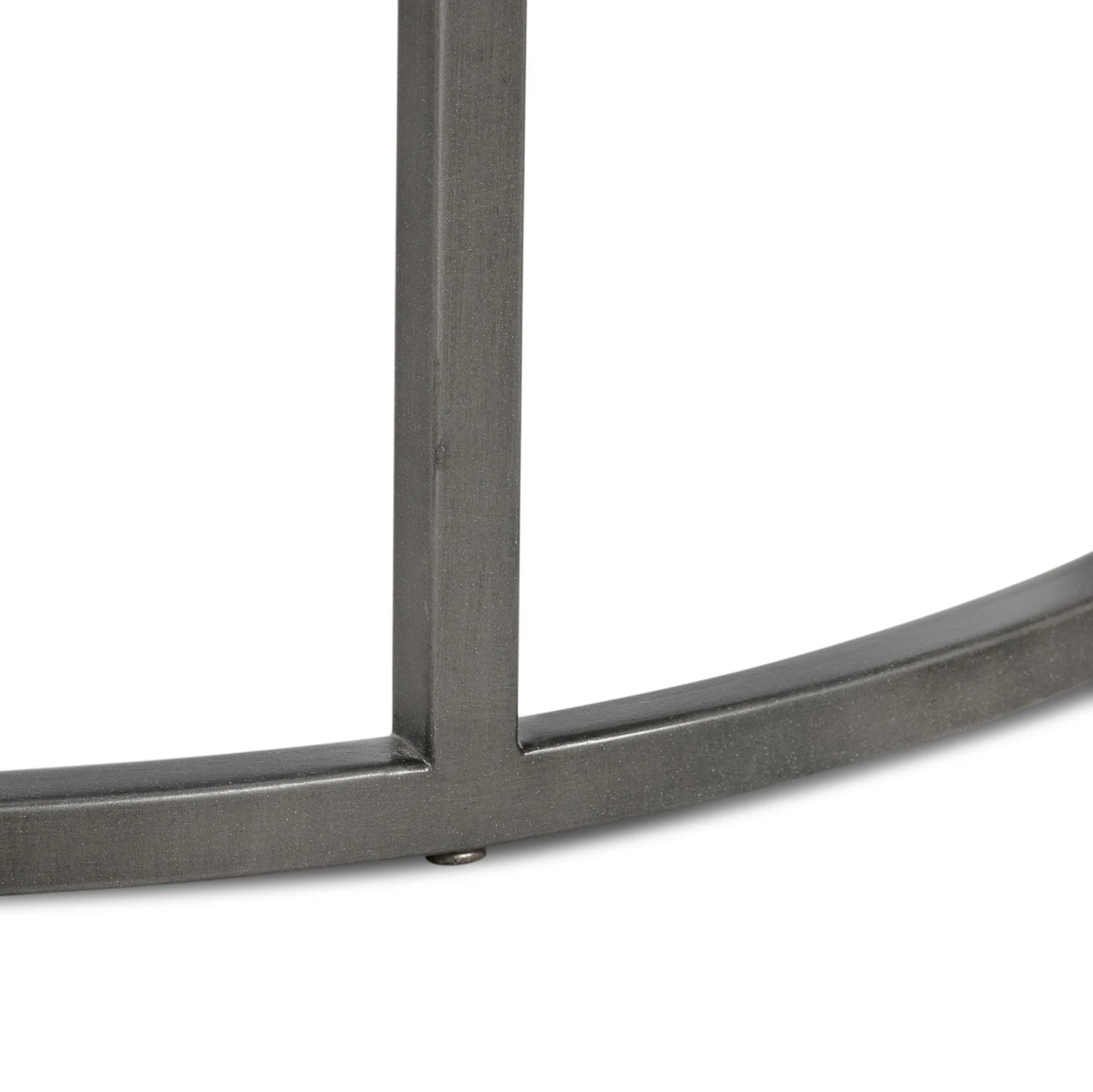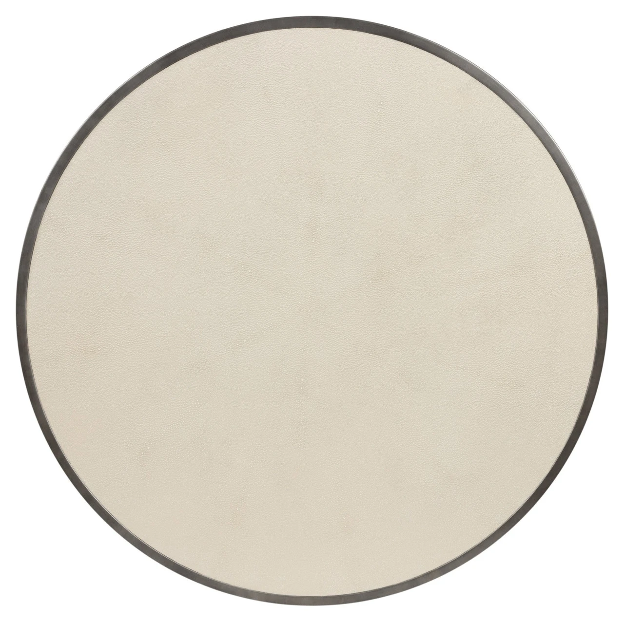 Brushed Gunmetal-finished iron curves like a crescent to welcome a nesting option for its smaller-scaled companion table. A faux shagreen table top in Ivory lends rich texture to clean, modern lines. Larger coffee table measures 38″ in diameter and 16″ in height. Smaller table measures 30″ in diameter and 14″ in height.