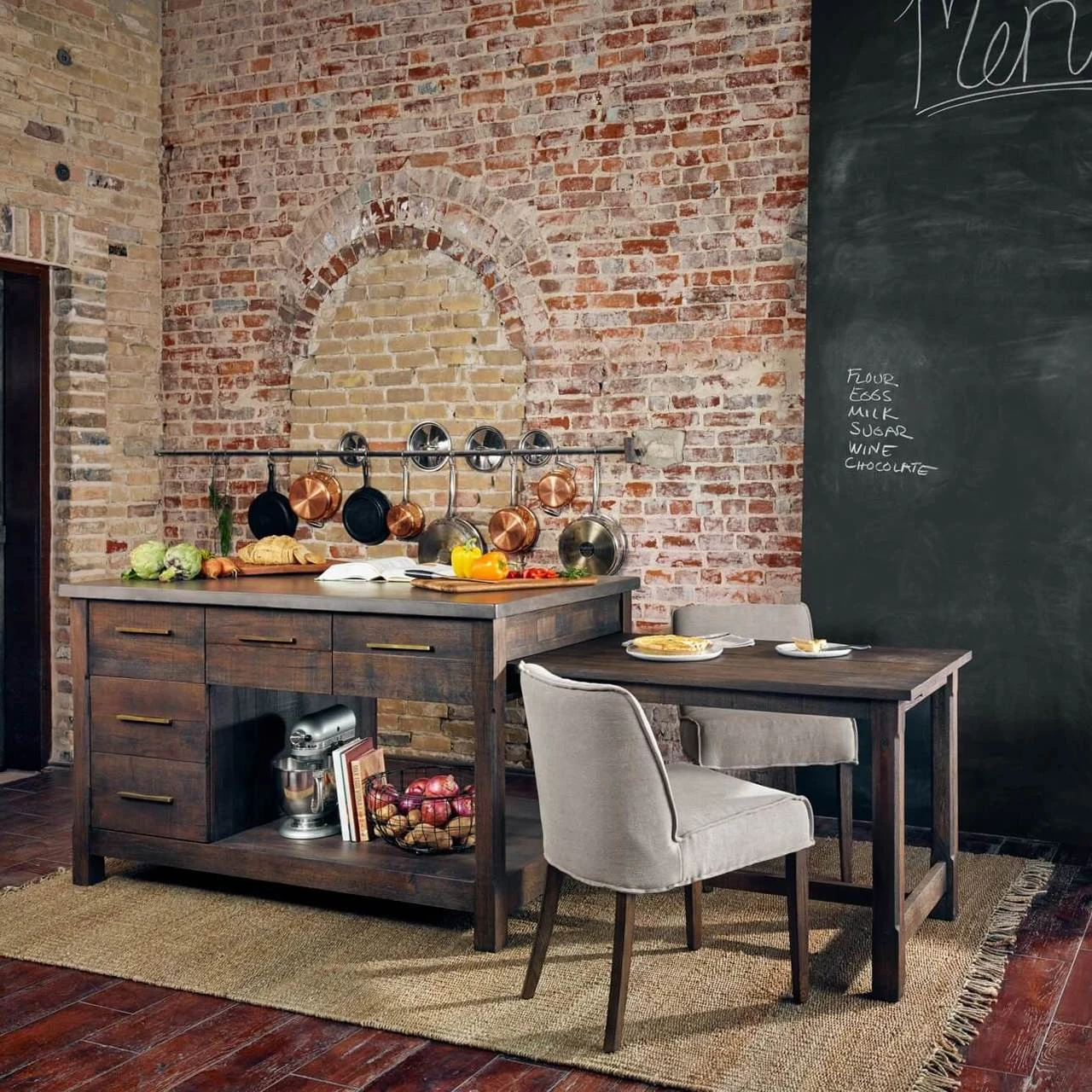 - Kitchen Island: 60″ wide x 36″ deep x 36″ high; extends to 102″ wide