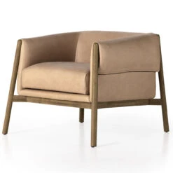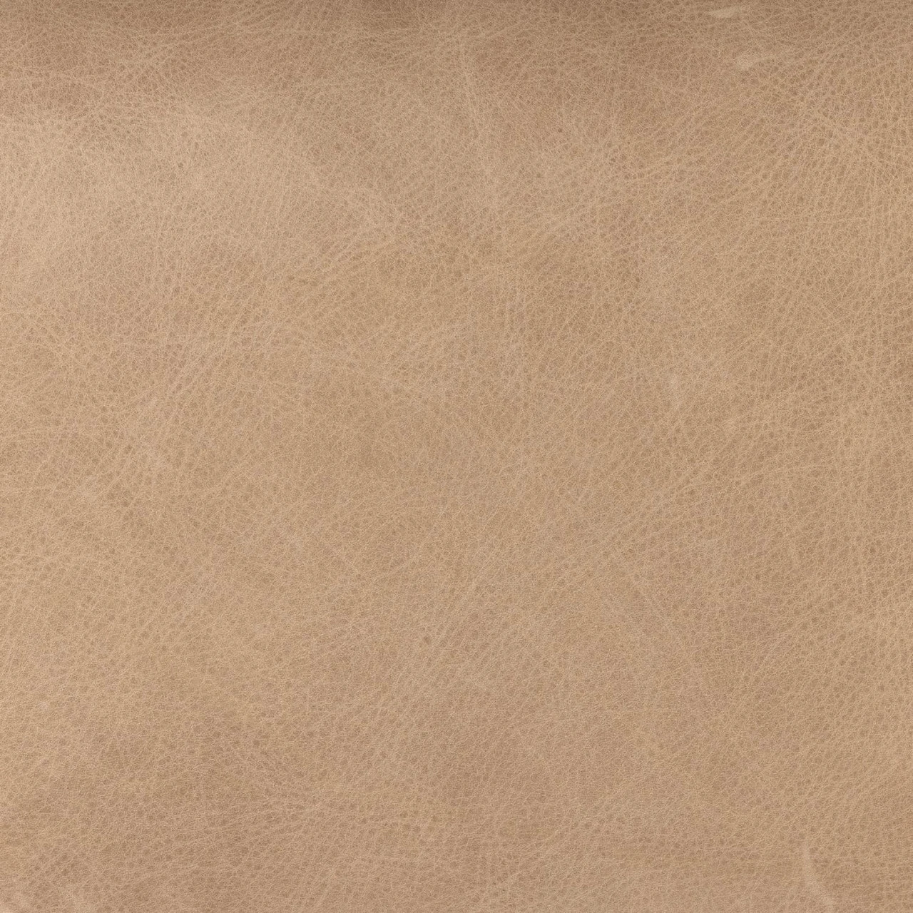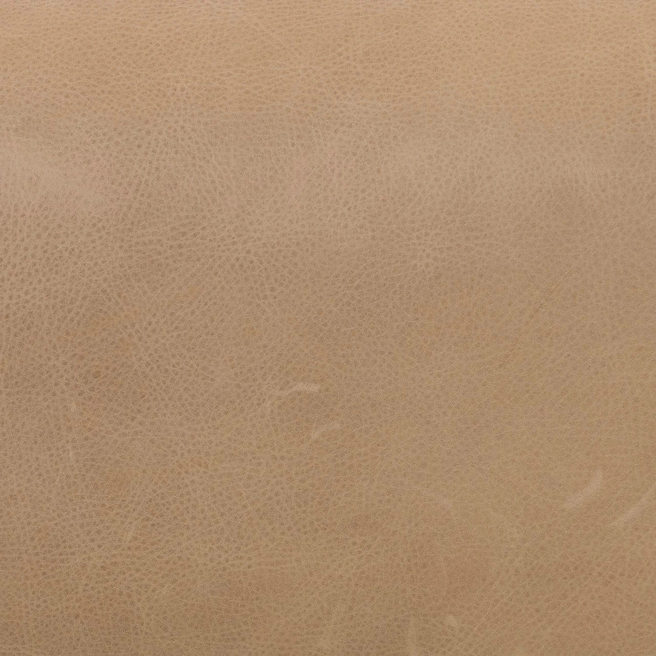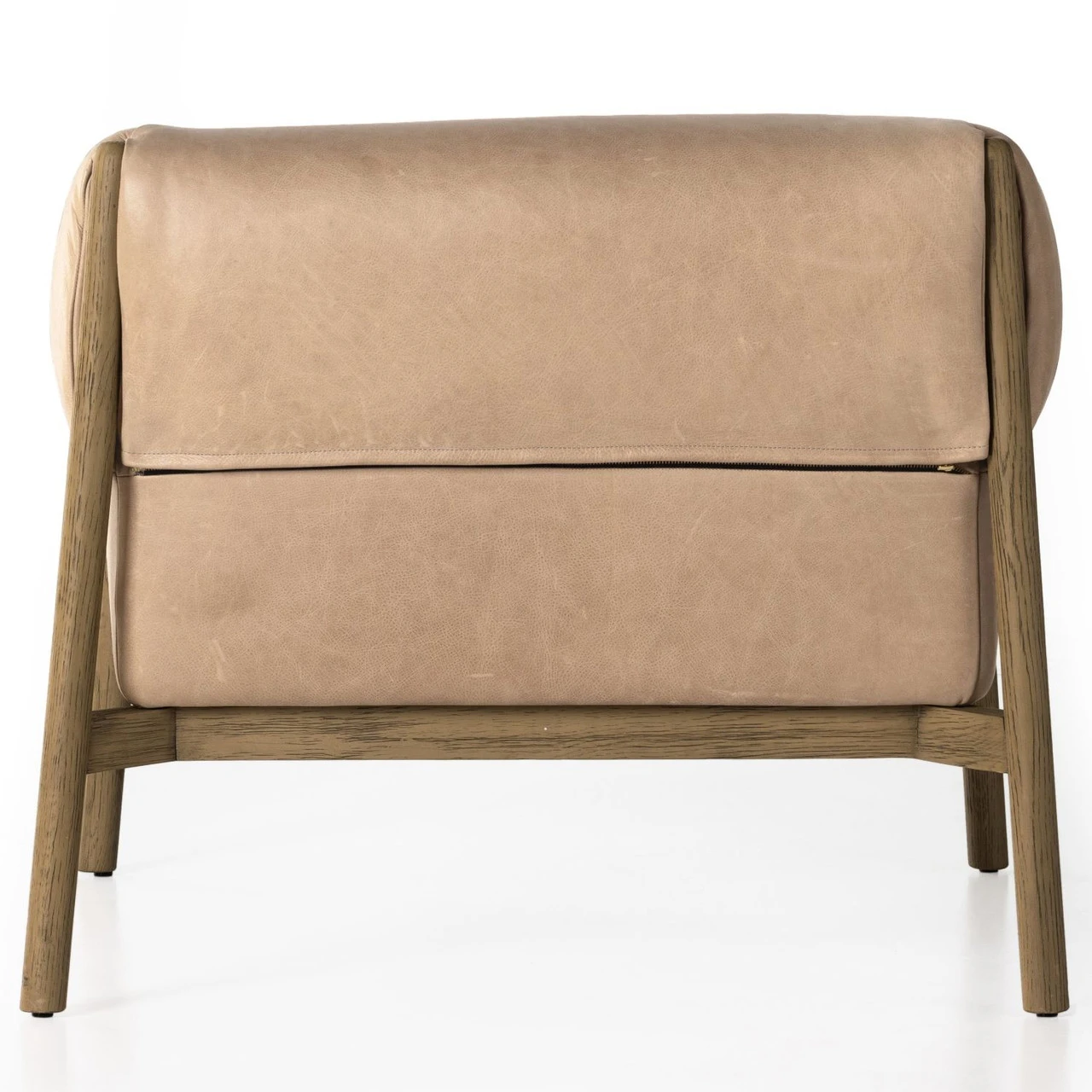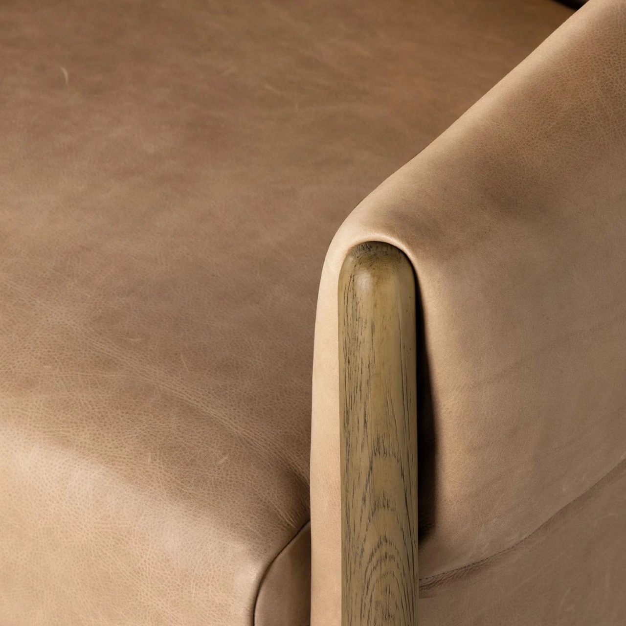 Sink right in. With slightly splayed legs for subtle intrigue, a tawny oak frame cradles comfy seating of top-grain leather in a nude hue, with wrapped arms for a cushioned look and feel.