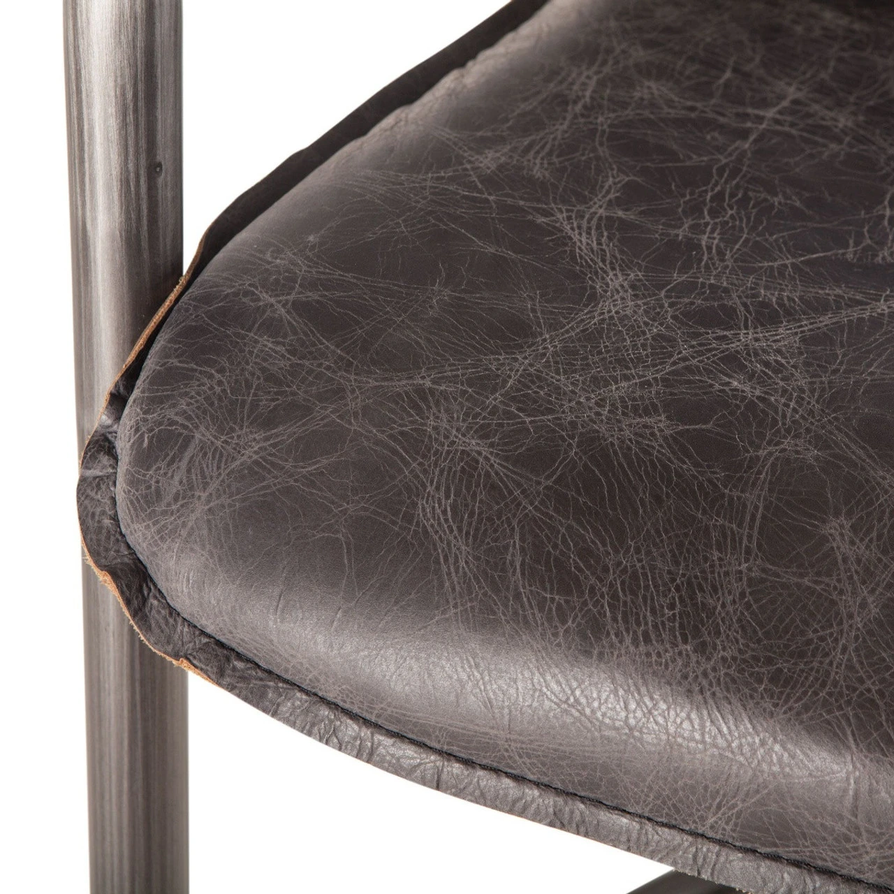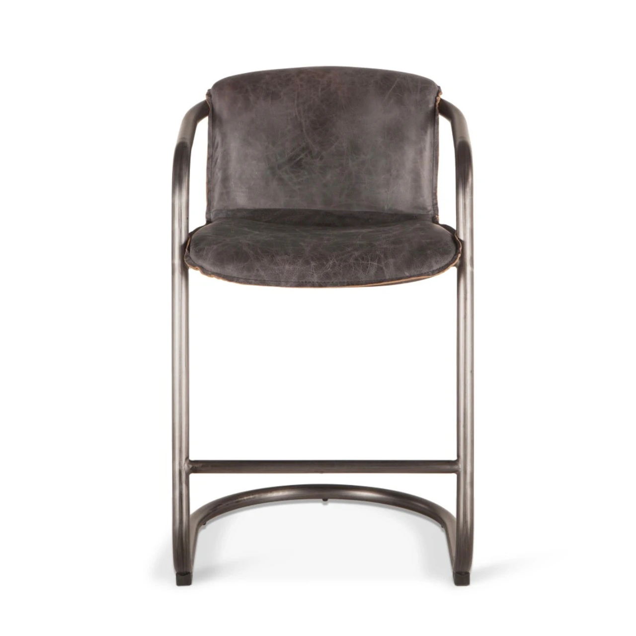 Modern, rustic and industrial. Our Industrial Loft Metal and Leather Counter Height Chair features sleek, modern Italian styling with a distinctly casual appeal. Upholstered in 100% top-grain in gently distressed leather. The U-shaped steel frame and legs in rustic brushed nickel and antique bronze finish include levelers with caps to protect the floors and a footrest.