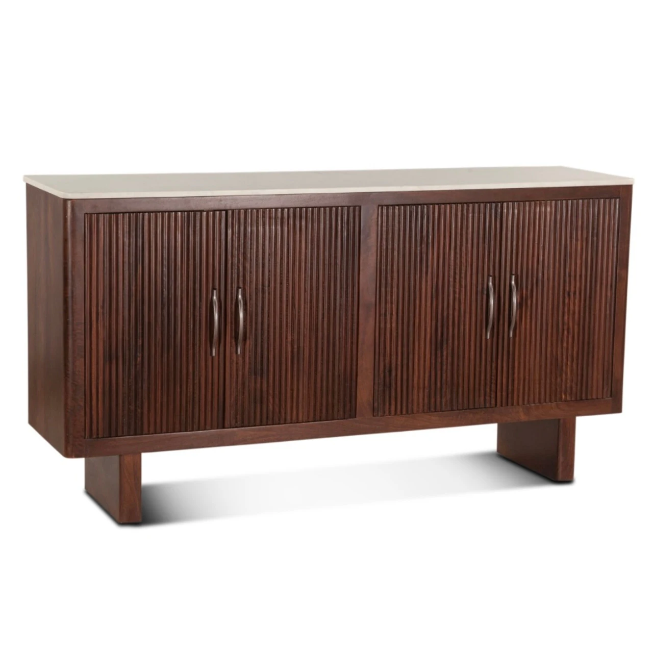 The Iris collection is crafted from exquisite white marble and solid mango wood, finished in a rich mahogany and adorned with a stunning fluting pattern, these pieces are sure to add sophistication and charm to any room.