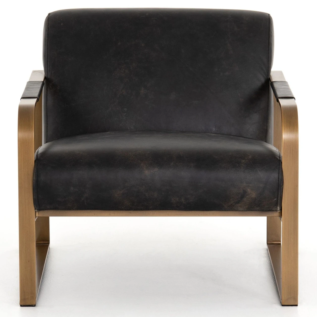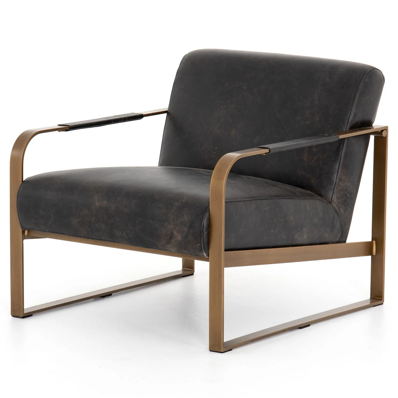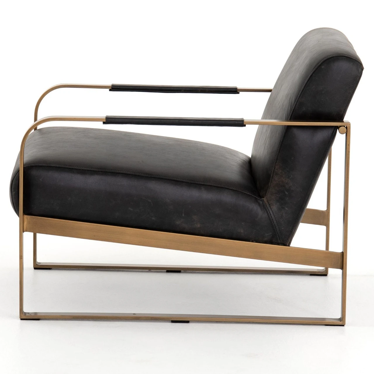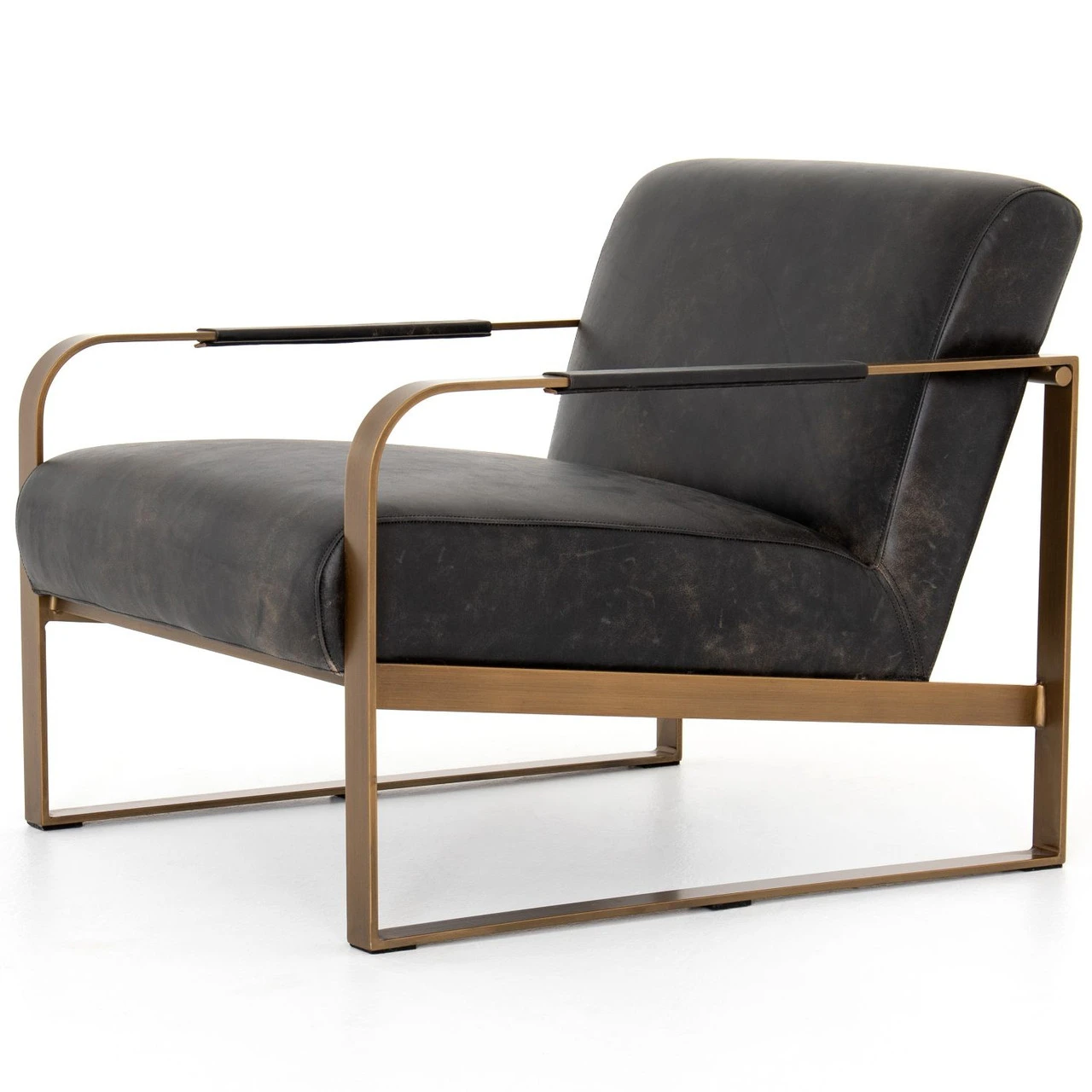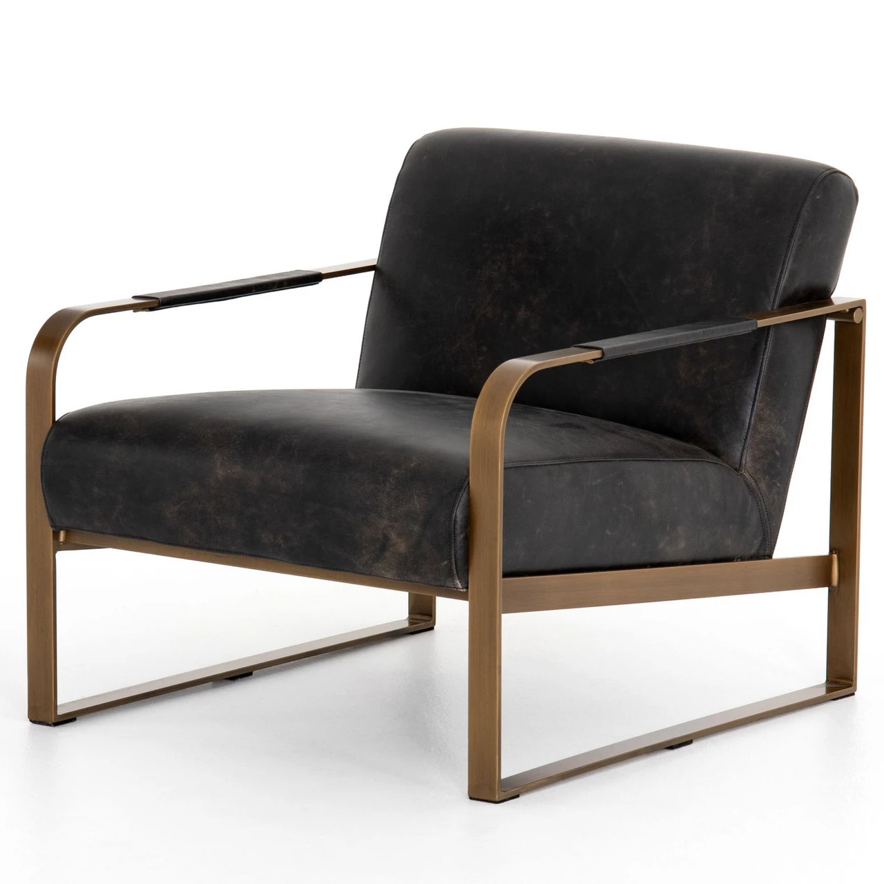 Streamlined design for true modern-minimalist attitude. Slim iron framing is finished in fashion-forward antique brass, bringing further warmth to this top-grain leather stunner.