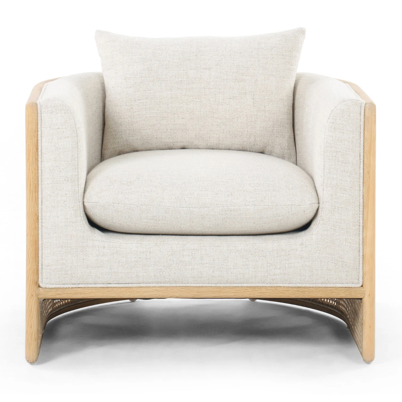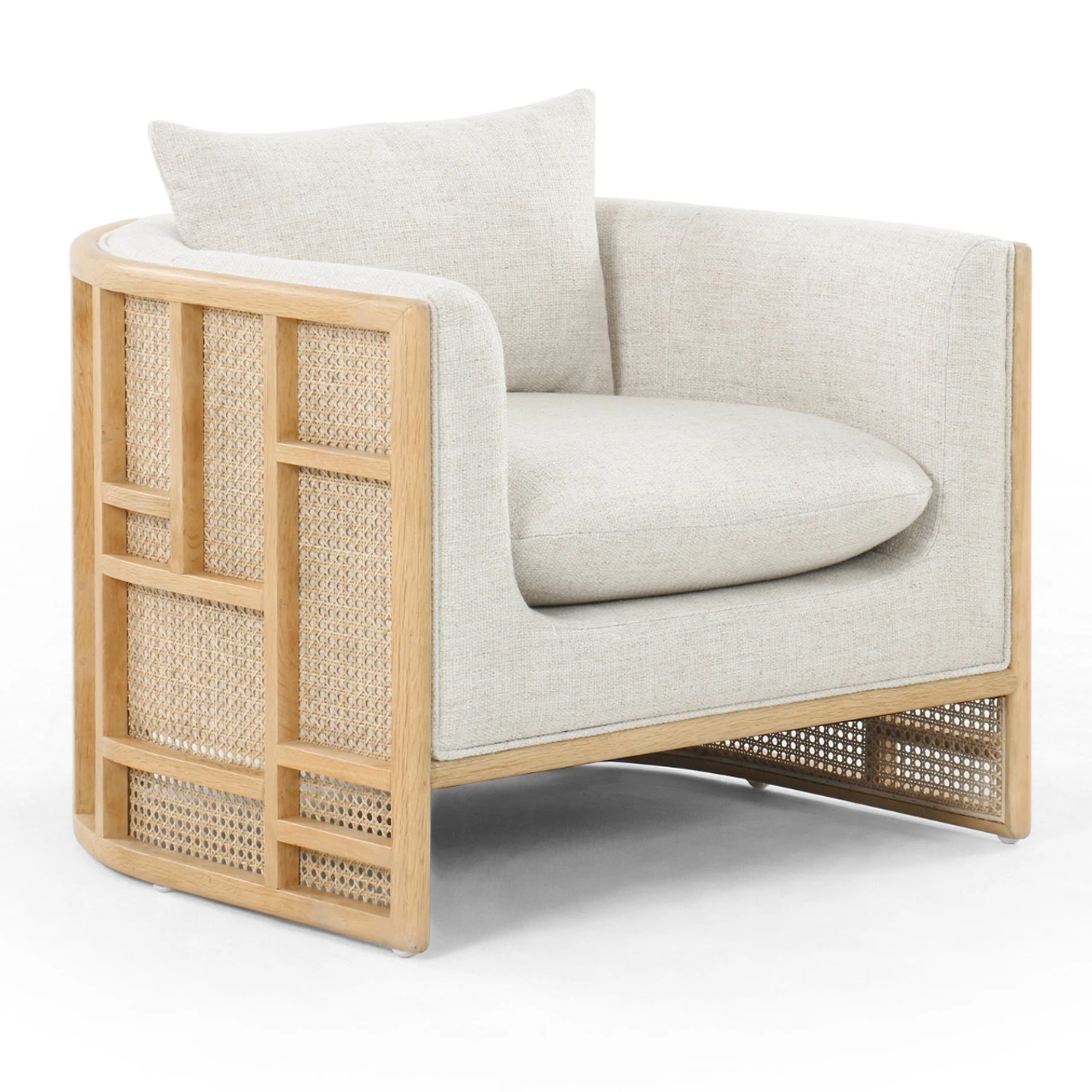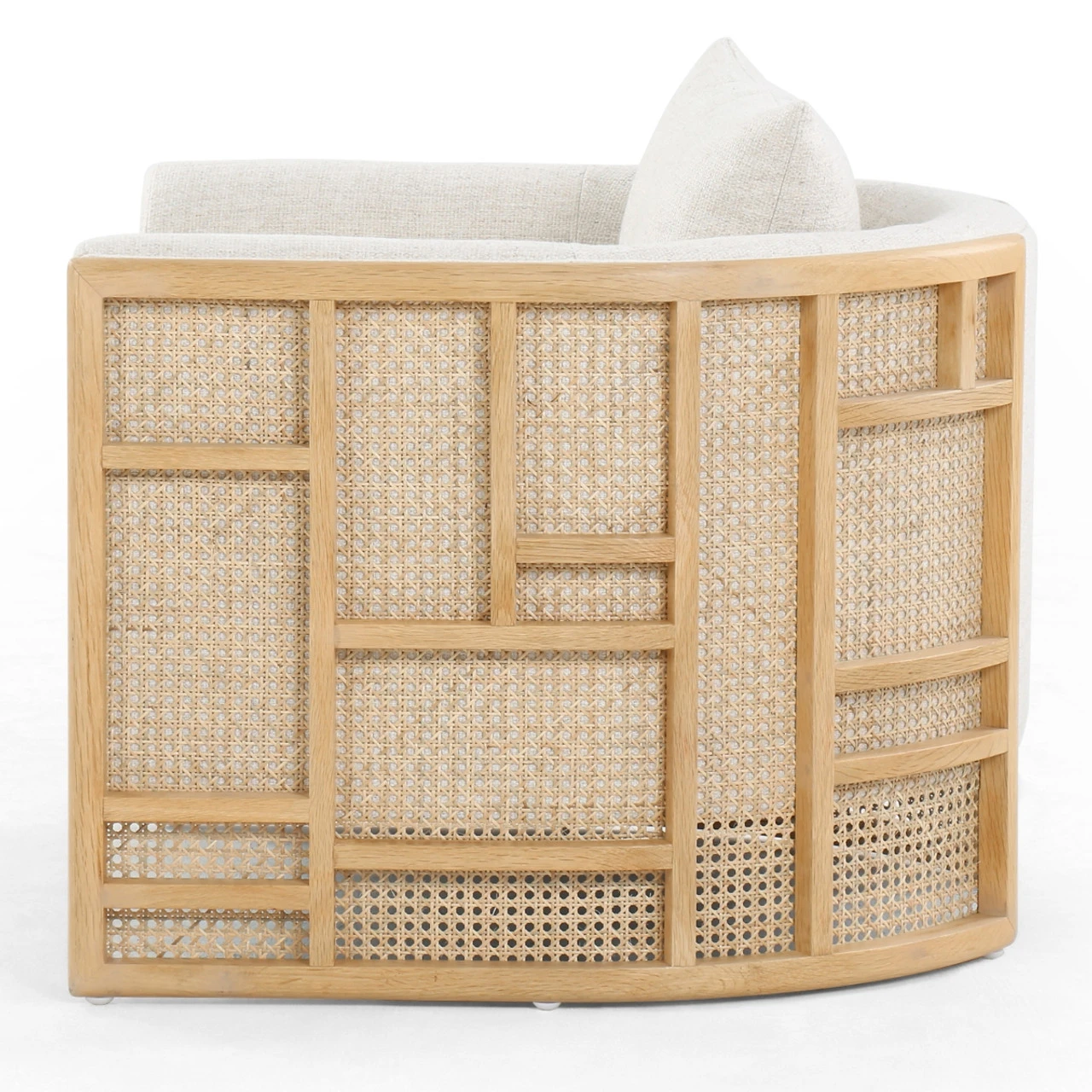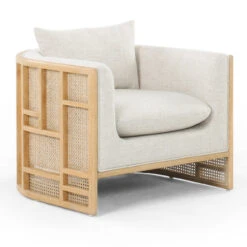 Textural and curve driven. Inspired by Japanese Tatamis, a cleverly constructed outer frame consists of rattan and natural cane paneling. Adding to that clean contrast sits cream linen-blend performance seating exclusive to Zin Home, with one knife-edge for added comfort.
