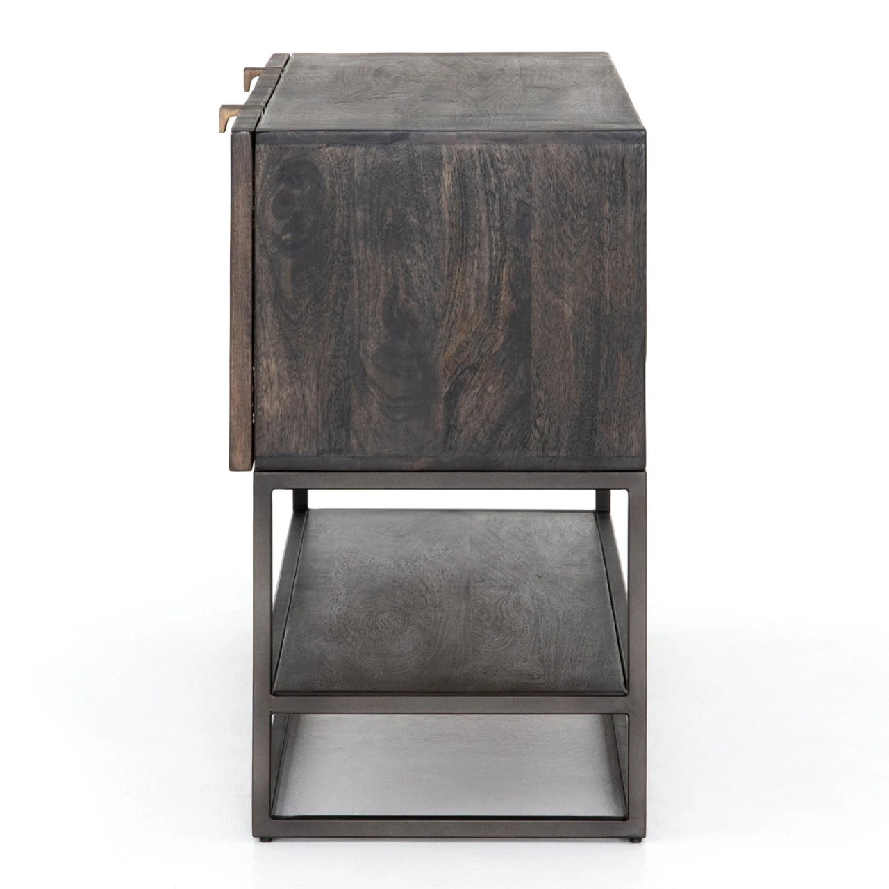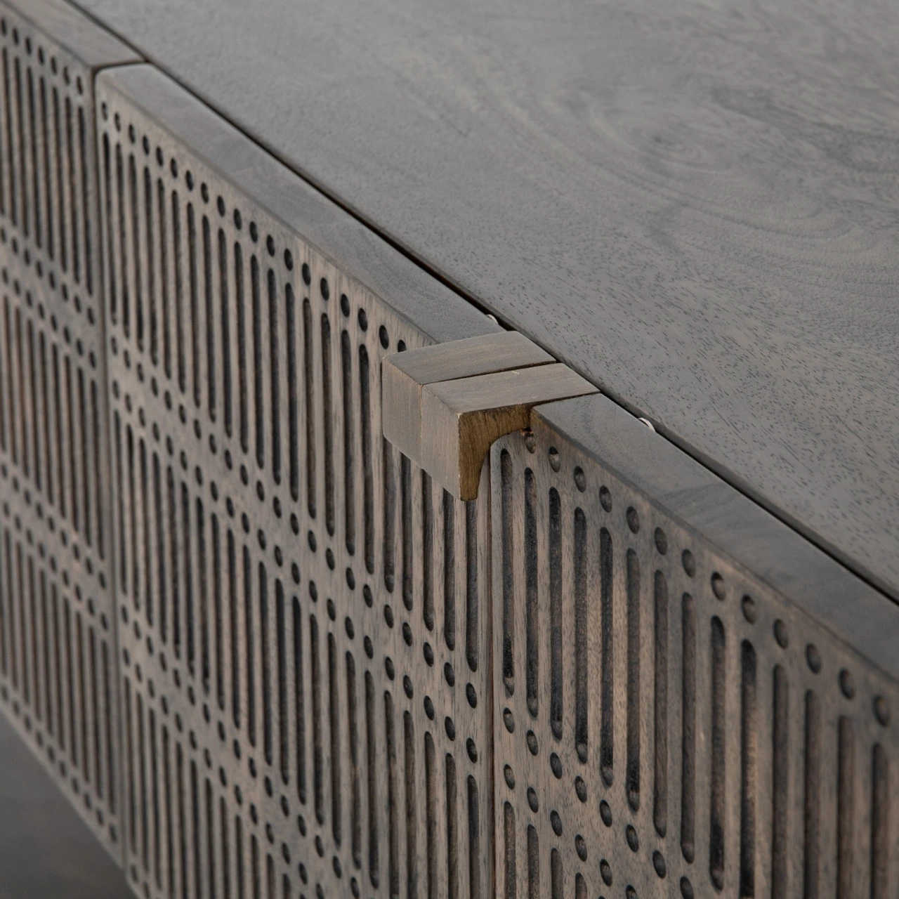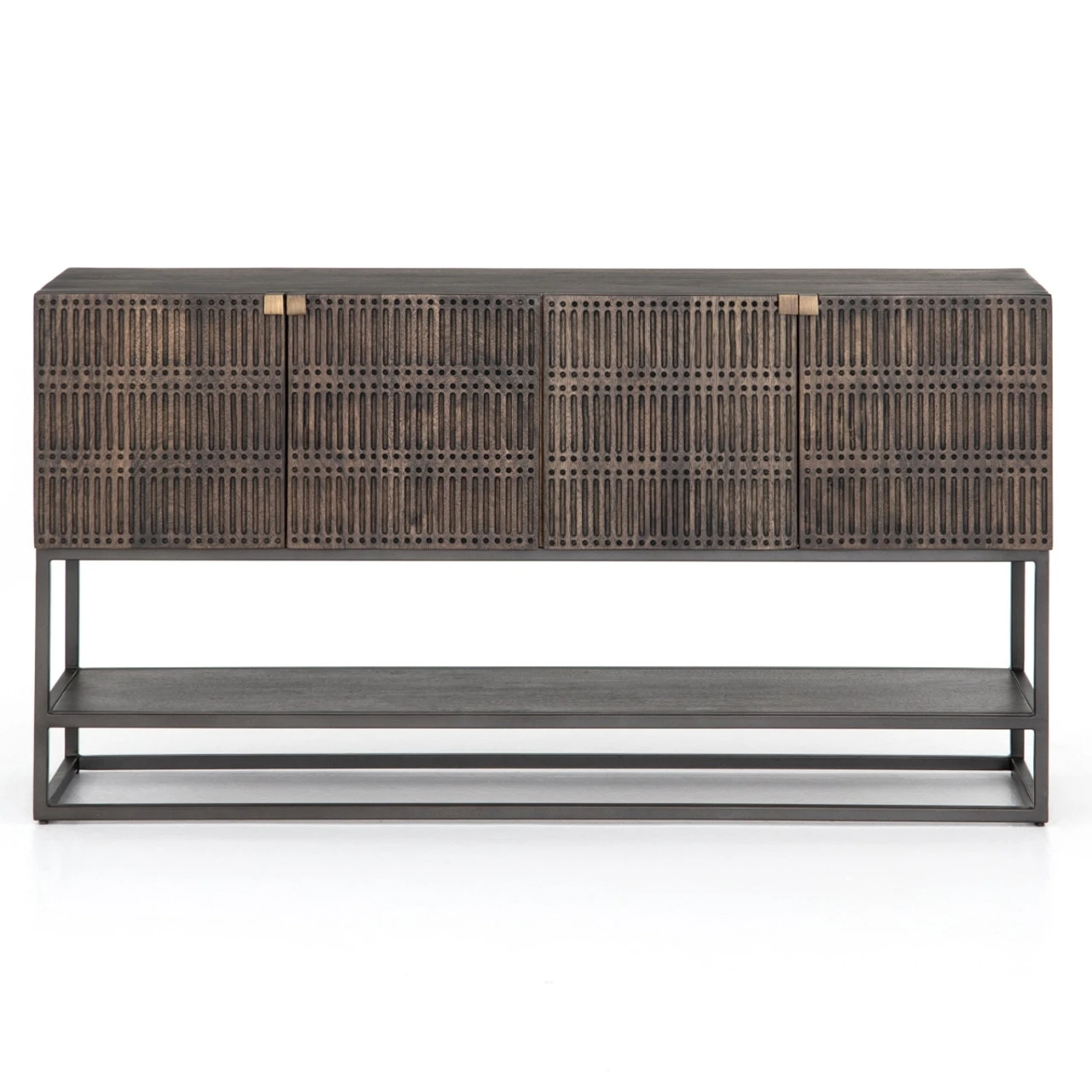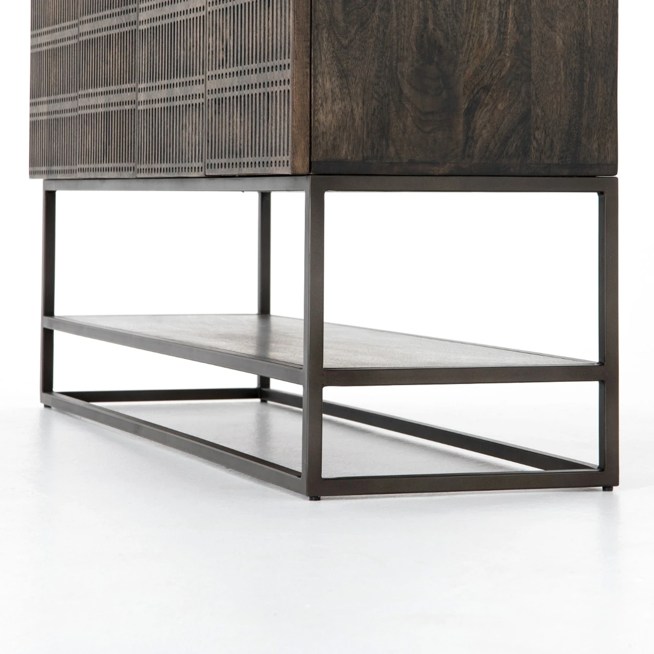 Unique linear carving meets new dimension with an artisan slant. Mango wood casing is finished in a vintage brown, highlighting texture and craftsmanship. A slim iron base adds an airy, cage-like look to small-scale media storage. Rear cutouts for cord management. This finely crafted mango wood TV-Stand reinterprets media storage with a global-meets-industrial attitude.