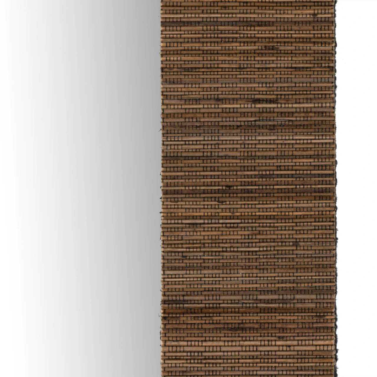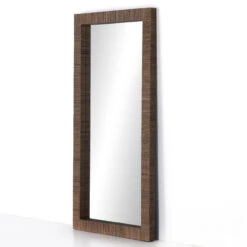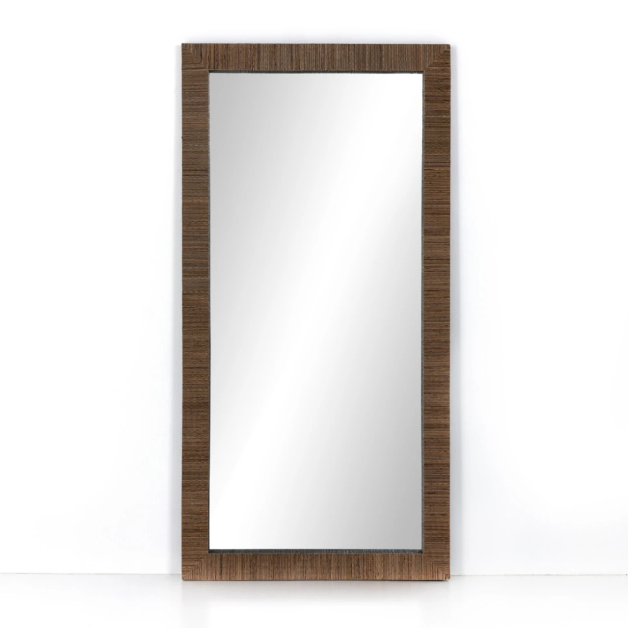 Reflect style in any space with a long, lean floor mirror made from cocoa-colored palm leaf and tempered glass.