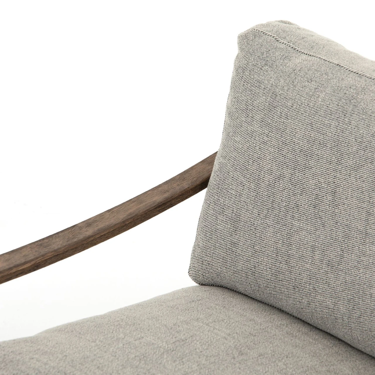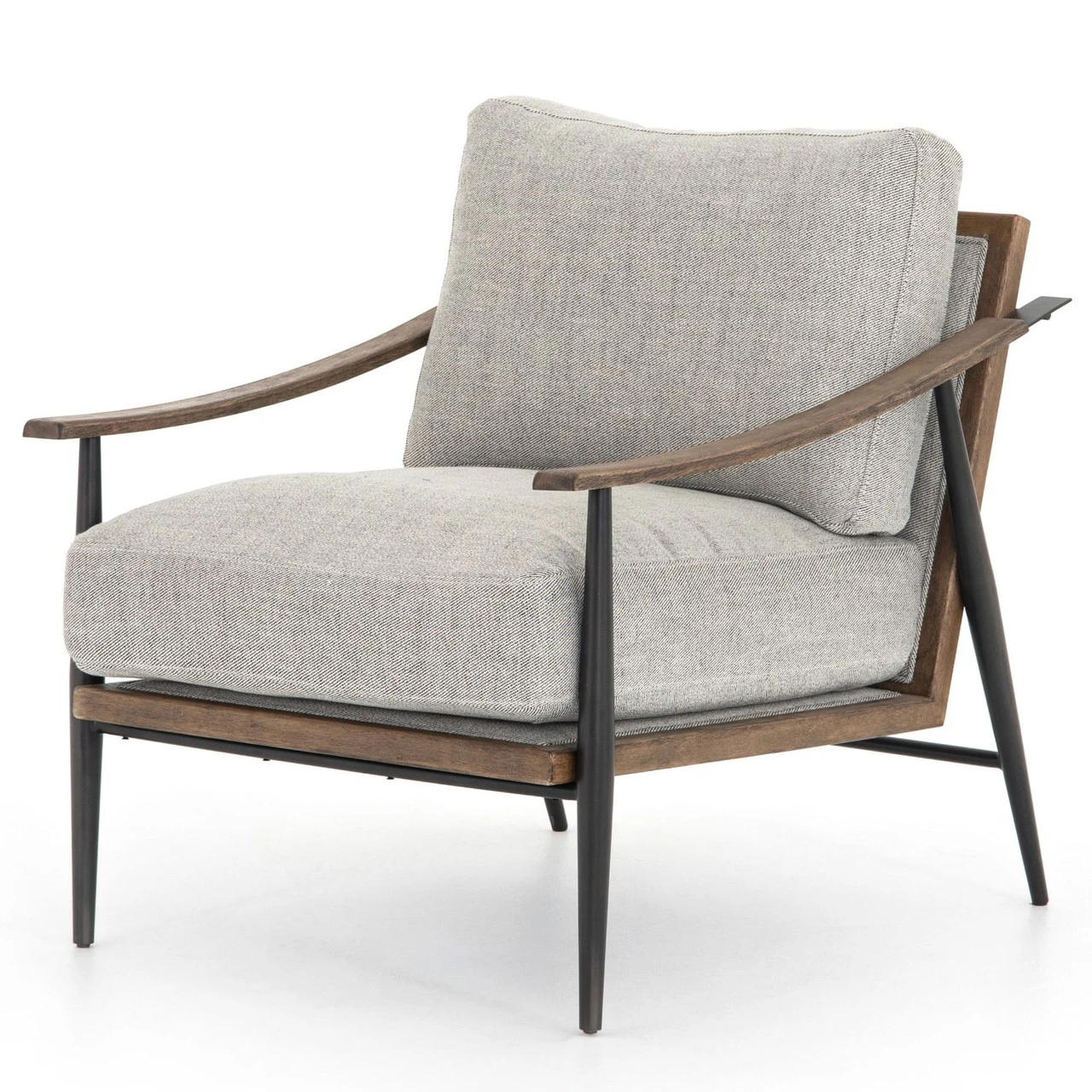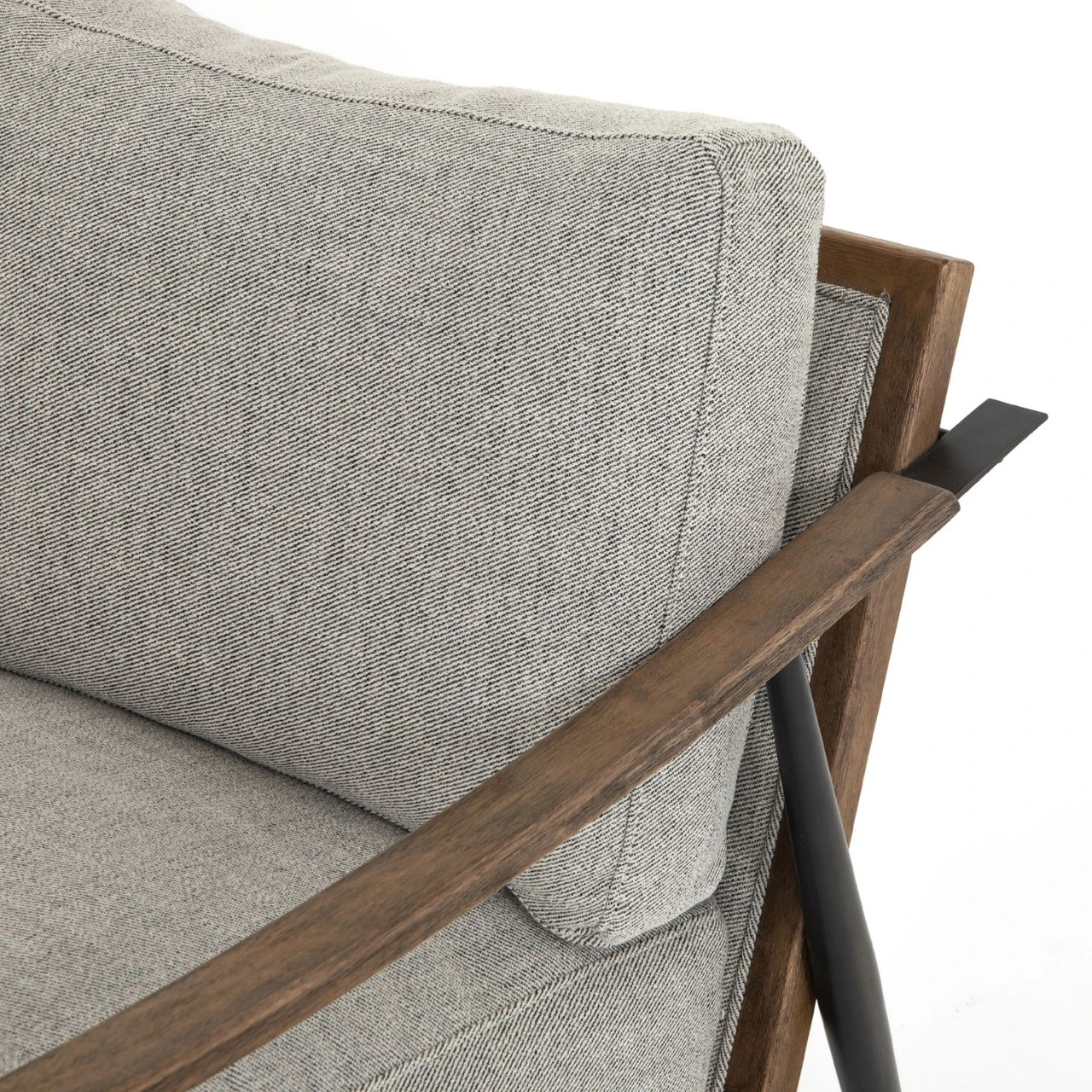 Comfort and class in one chic silhouette. Sloped wooden arms and forged, gunmetal-finished legs frame cushy feather-blend seating covered in a textural grey twill, striking great tonal balance between warm and cool.