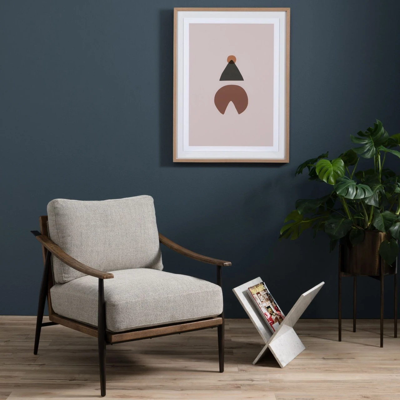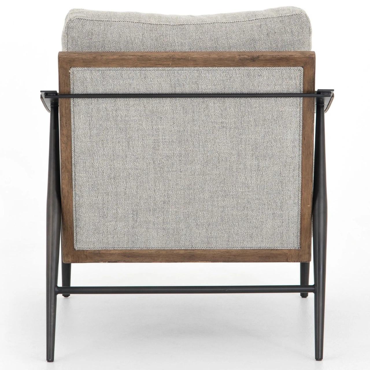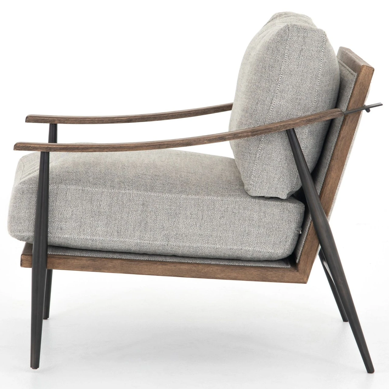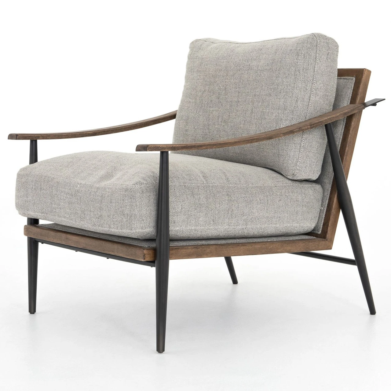 Comfort and class in one chic silhouette. Sloped wooden arms and forged, gunmetal-finished legs frame cushy feather-blend seating covered in a textural grey twill, striking great tonal balance between warm and cool.