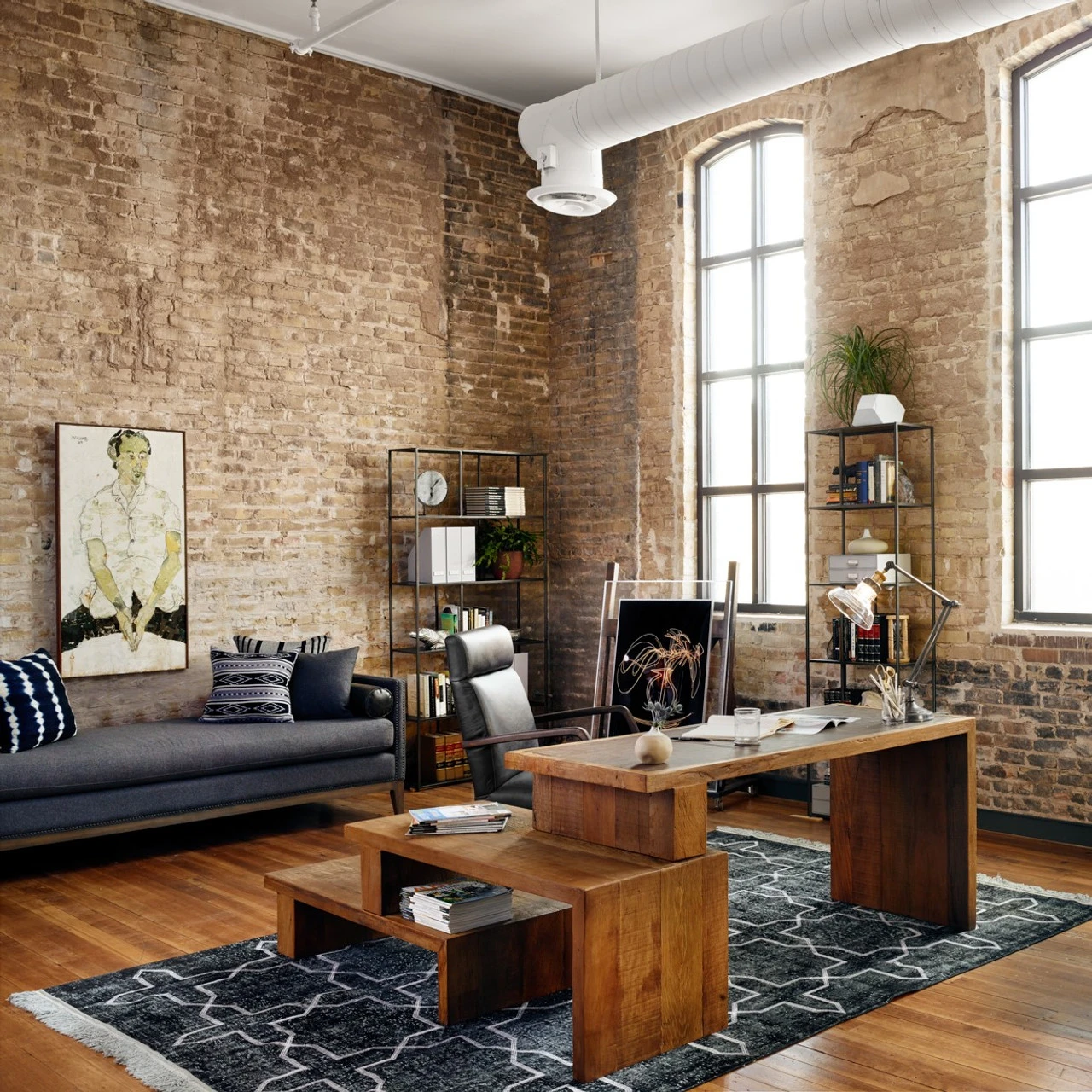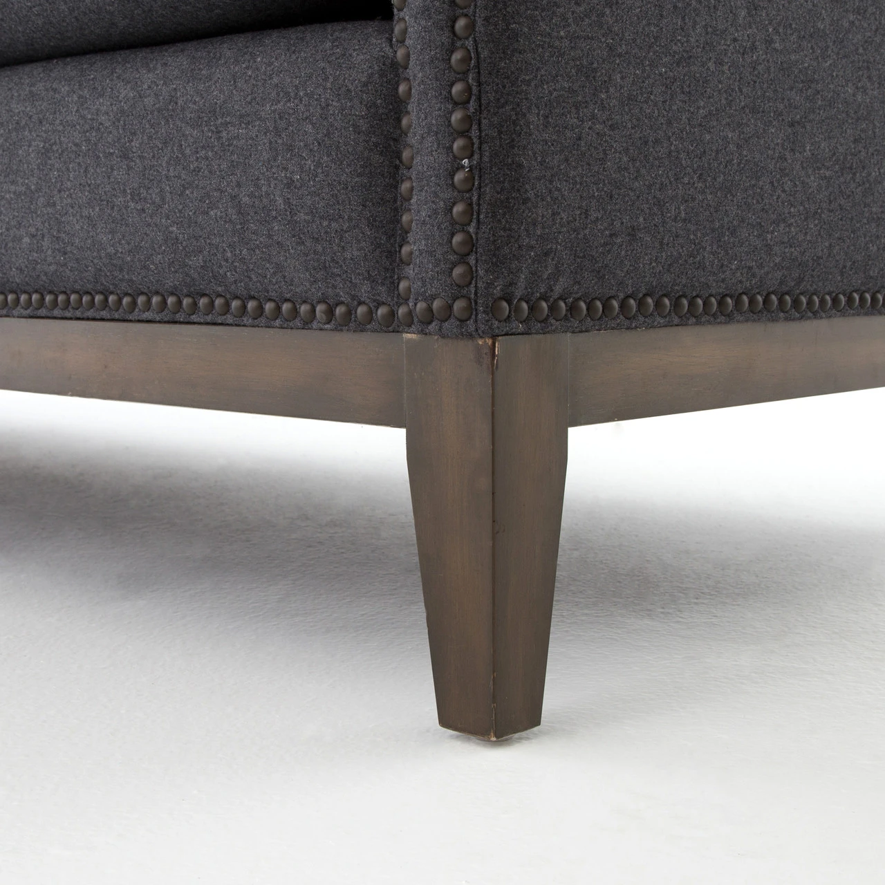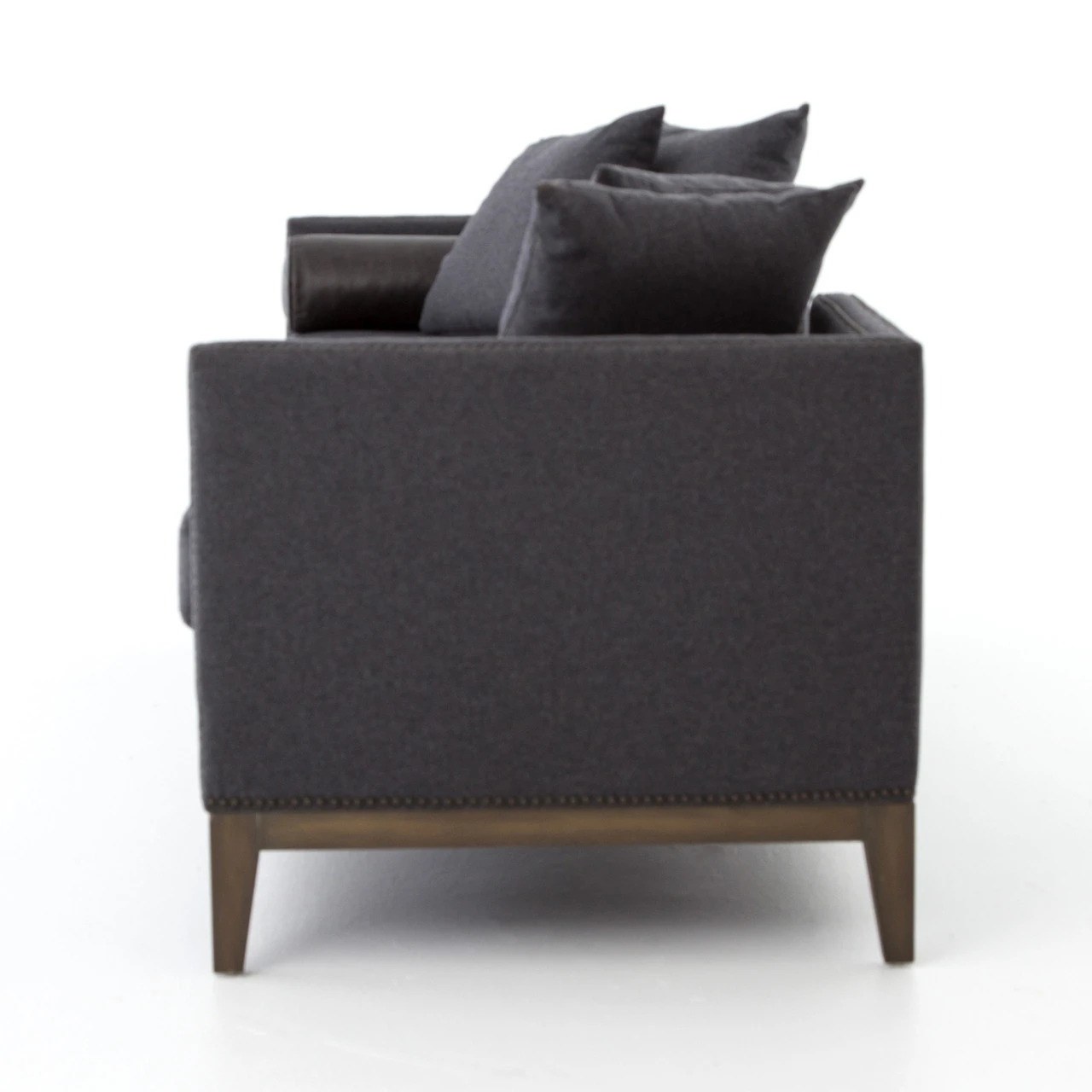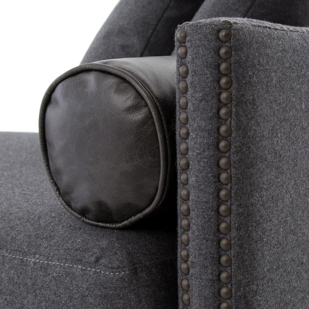 Mixed materials and an open chaise design offers dynamic and distinctive seating. Weathered oak with charcoal felt, bronze nailhead trim, and black leather bolsters.