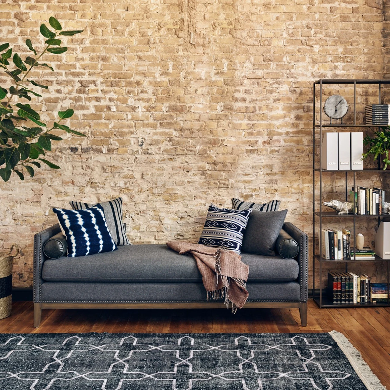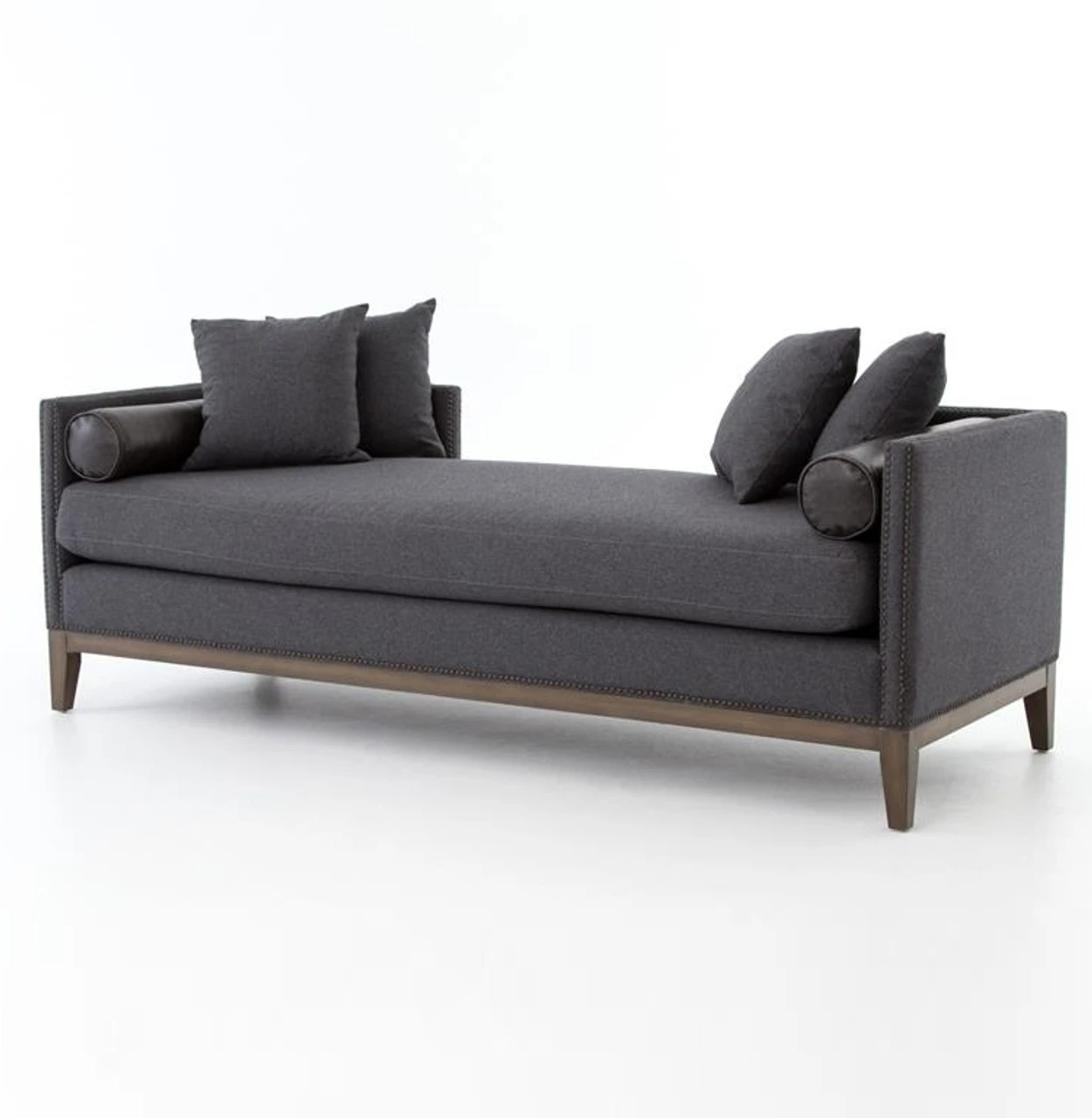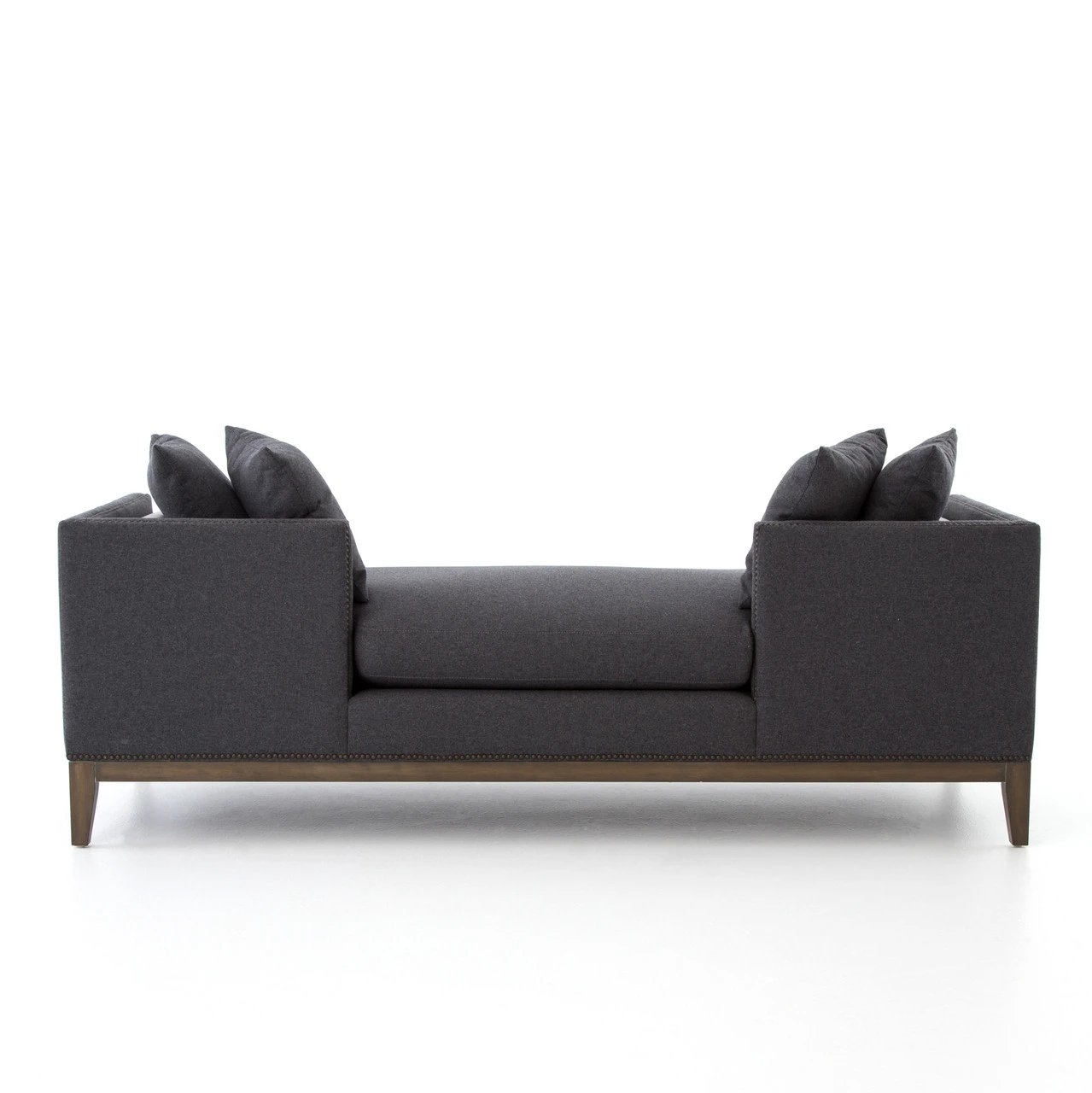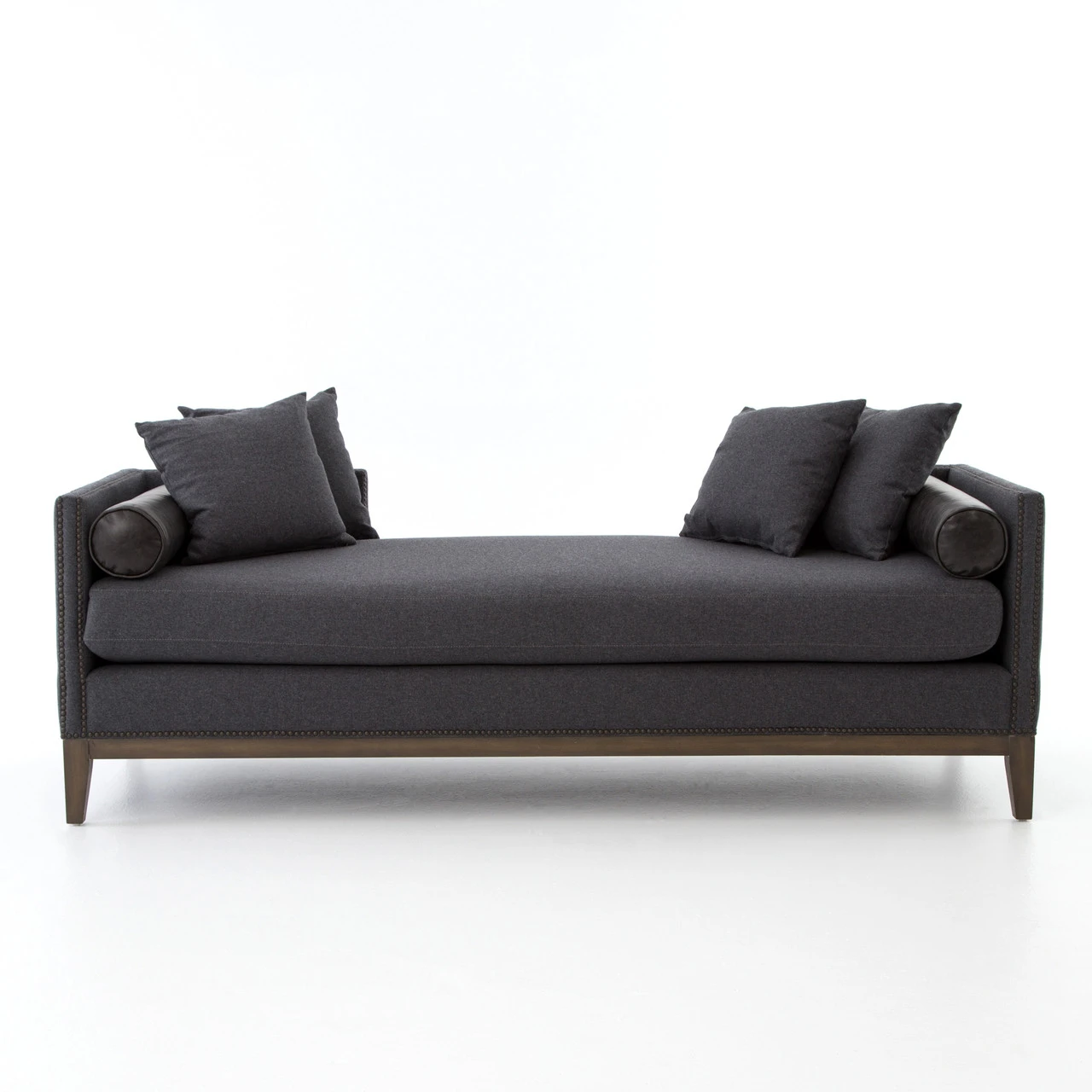 Fresh takes on upholstery are focused on adding a softer edge to modern living — without sacrificing style. Unblemished attention to quality, the upscale Double Chaise Daybed is deeply padded for comfort and gracefully designed for beauty. Place this open bench in the middle of a room for seating in either direction. Meticulously crafted from Weathered oak frame with charcoal felt color upholstery, bronze nailhead trim and black leather bolsters.