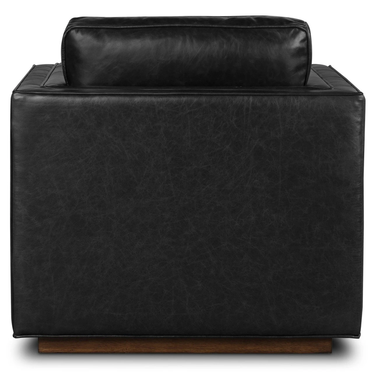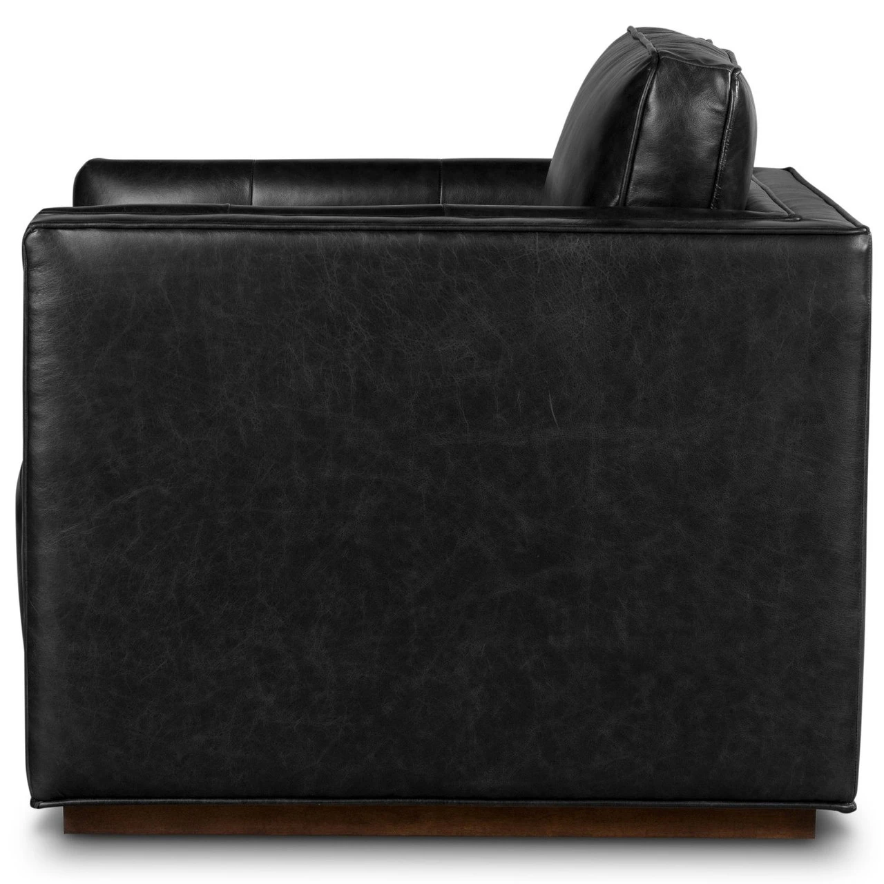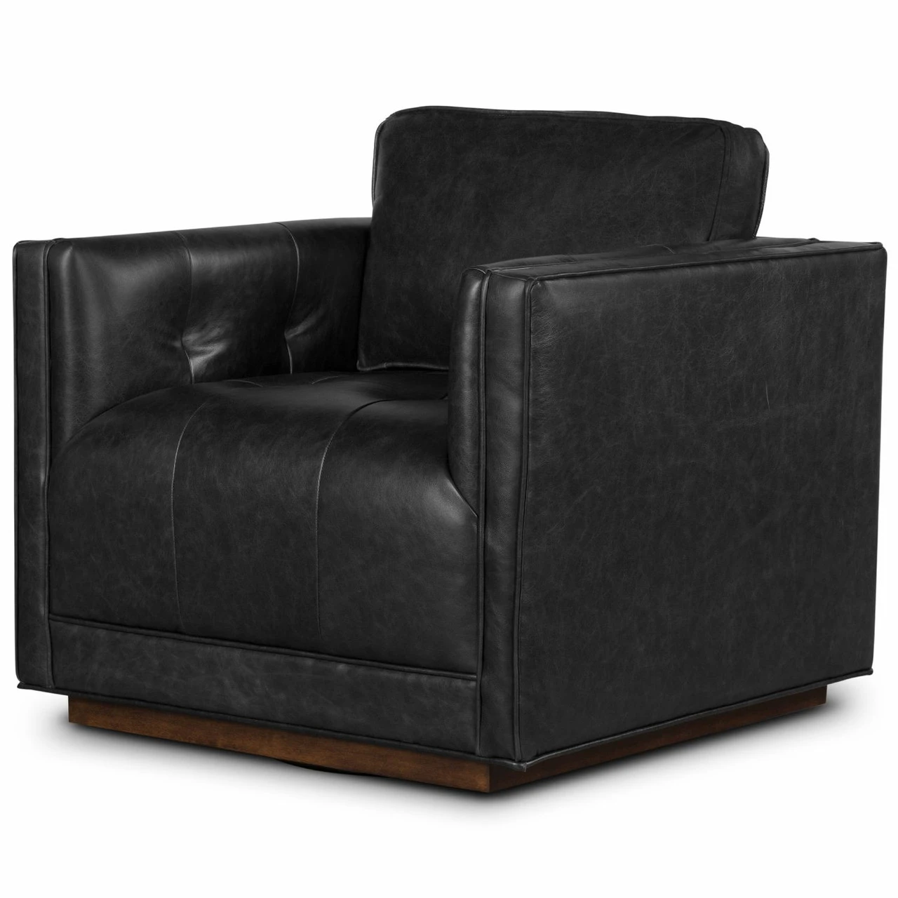 Streamlined shaping enriched by luxurious material. Black top-grain leather covers clean-angled arms for a tailored look, while blind tufting delivers an aura of depth. A swivel base of solid parawood takes this modern seating style to the next level.