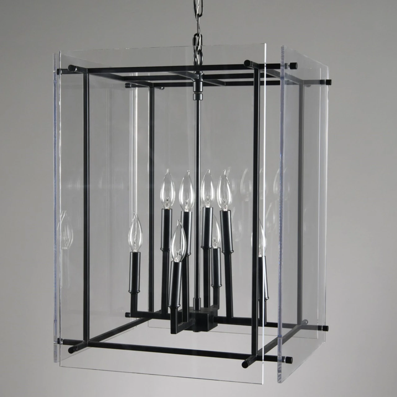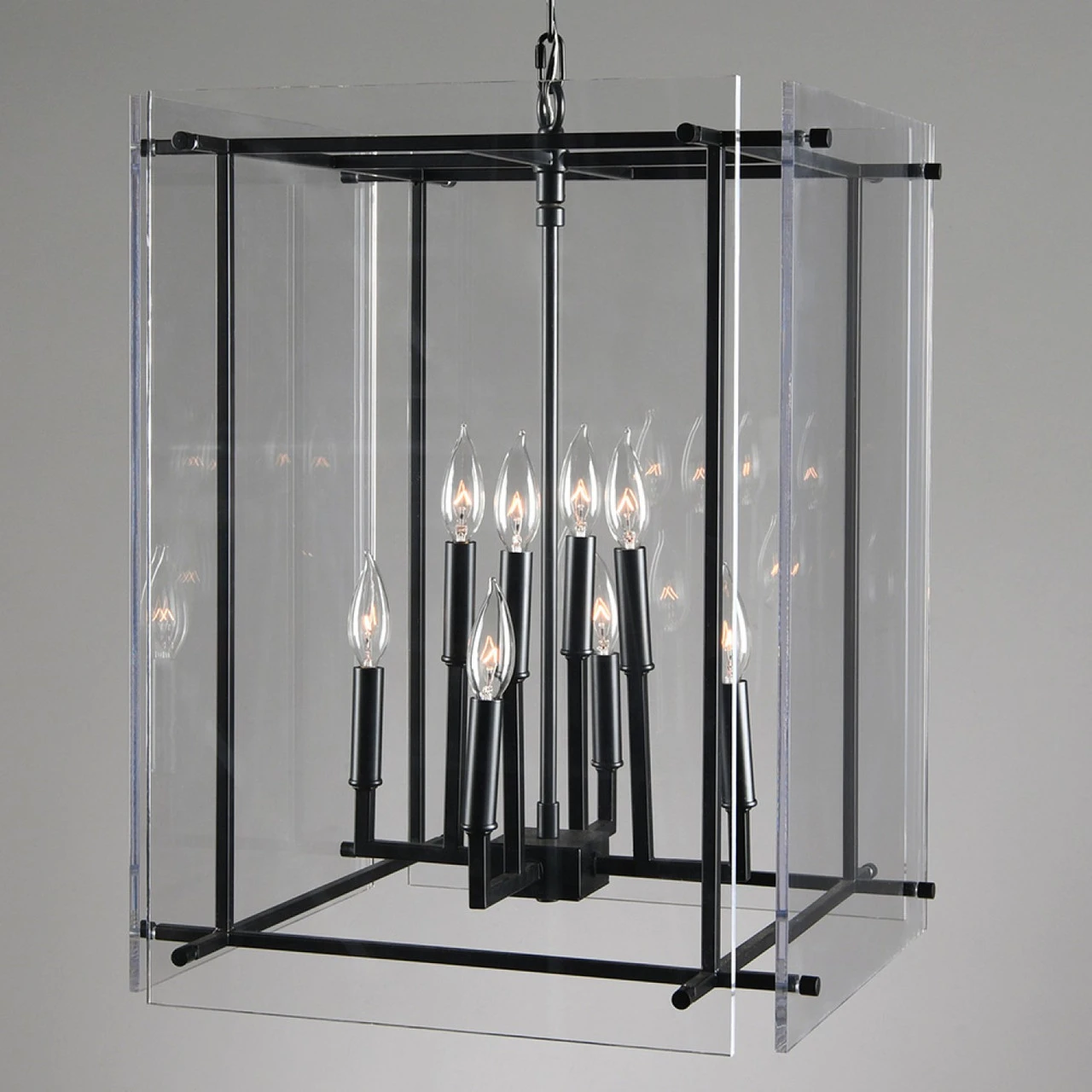 Sharp lines and a black finish give this iron chandelier a sleek look while eight bulbs perfectly illuminate any space.