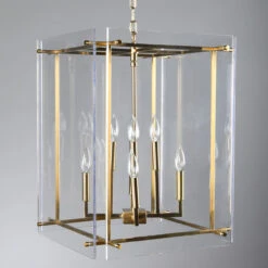 Minimalist and modern, this chandelier highlights its linear design with a gleaming brass finish and crisp acrylic panes. The elegantly simple design complements traditional and modern styles alike while the sleek finishes enhance any color scheme.