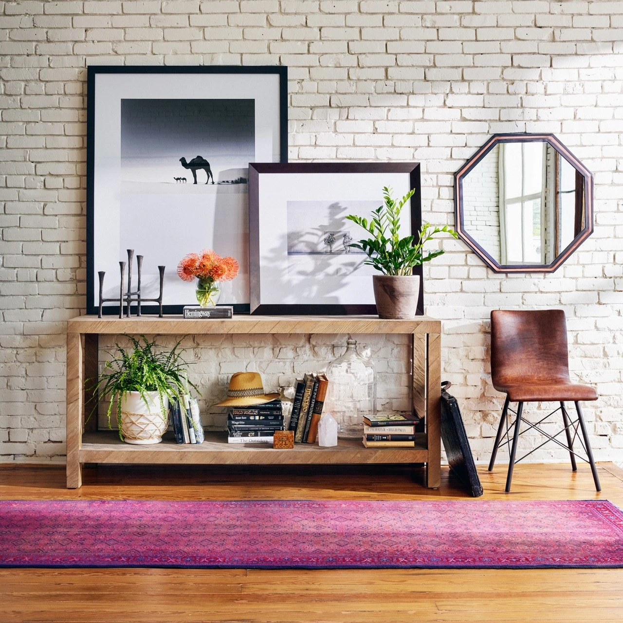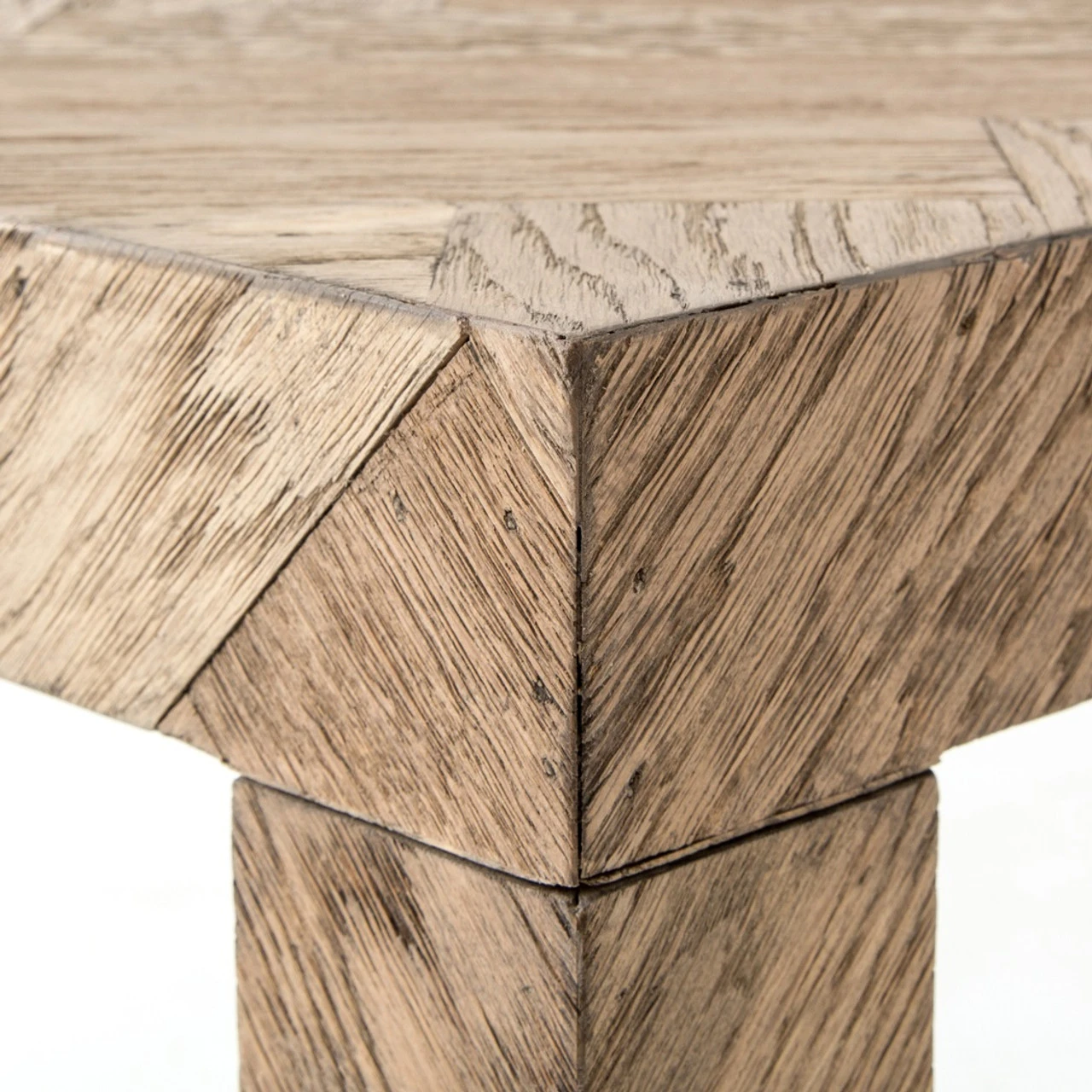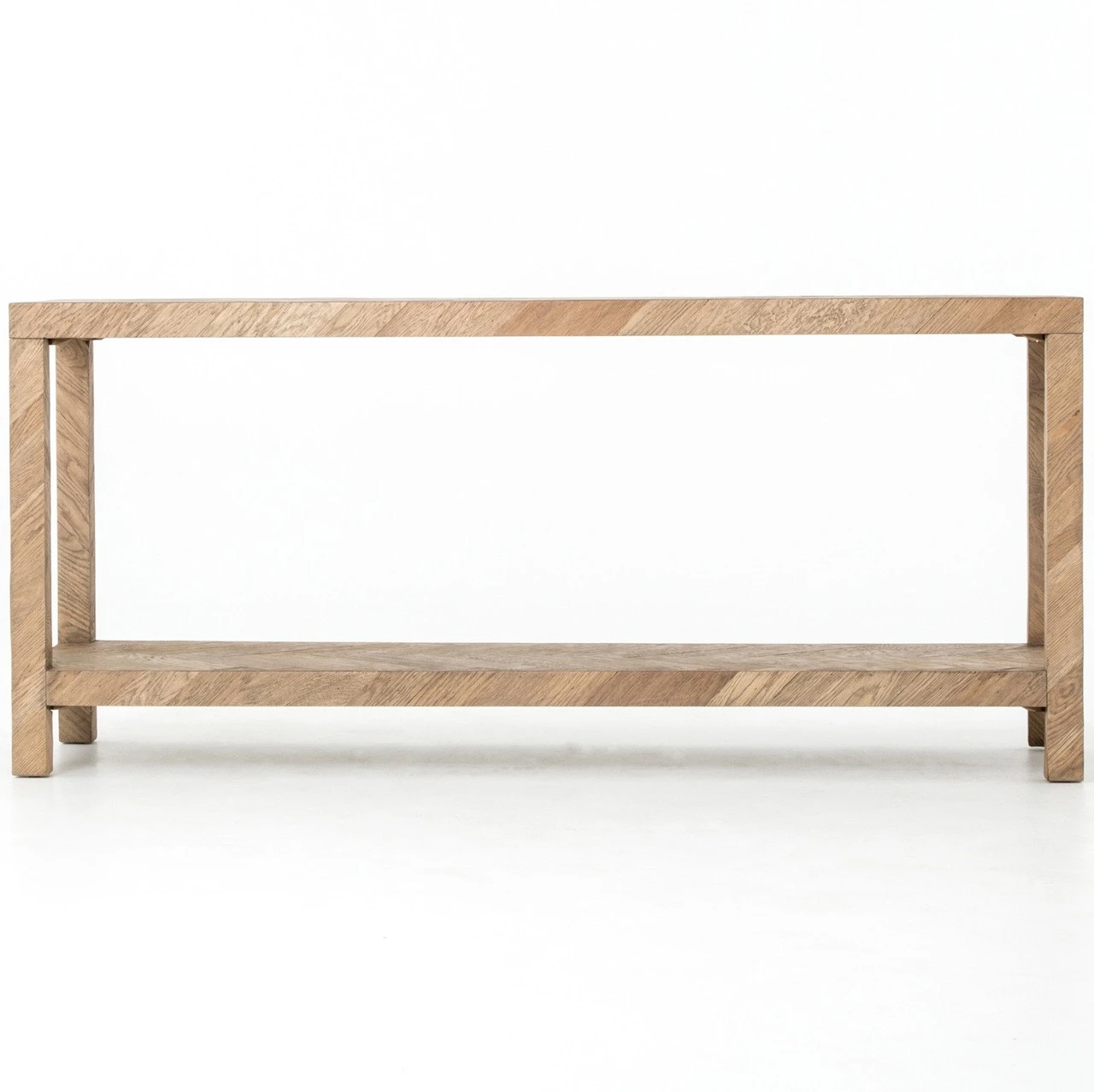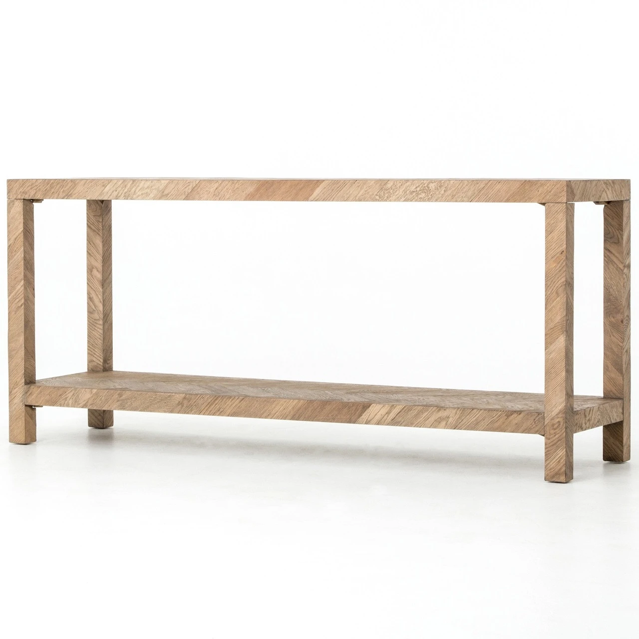 The simplest answer is often the right one. This deceptively simple Parsons-style console table offers grandly exaggerated dimensions and a subtle, herringbone parquet pattern on every surface. This rustic console table stands proud– perfect in the foyer or hallway.