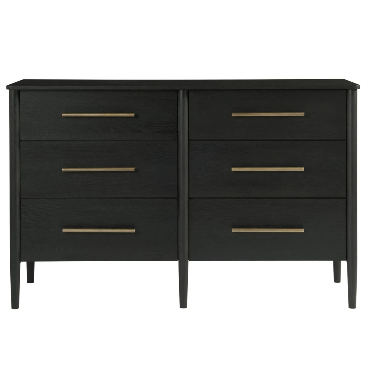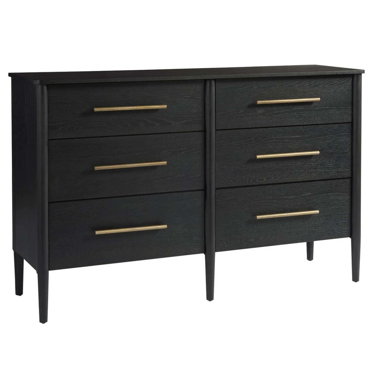 Inspired by 1950s French furnishings. Its six roomy drawers are built with English dovetails, punctuated by contemporary brass hardware, flanked by smooth tapered legs and finished in a deep brown to light black hue. Our Contemporary Langley Black Wooden 6 Drawer Dresser will easily anchor any bedroom design.