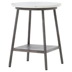 Intriguing contrasts in a simple silhouette. A smooth round white marble top sits on a hammered gun metal base with a hand-forged feel. This Round end table will make a statement whether next to a sofa or in bedroom as a nightstand.